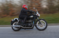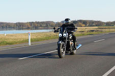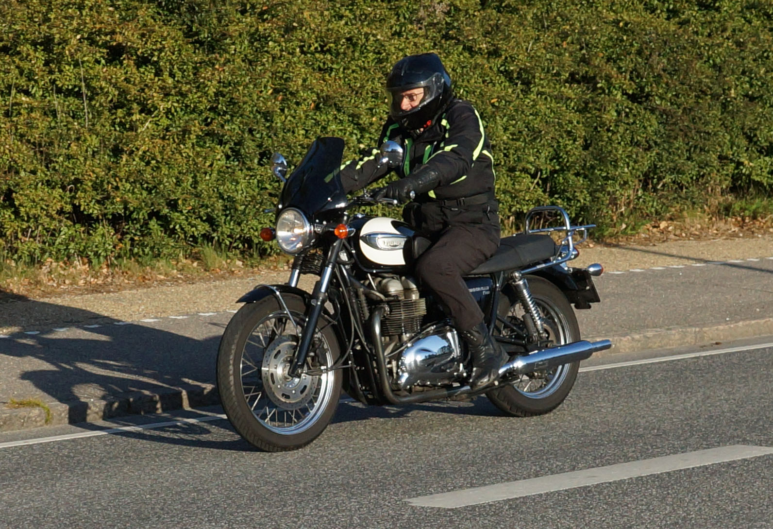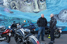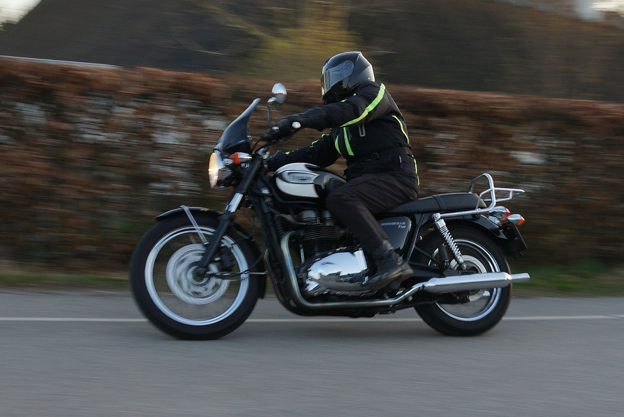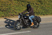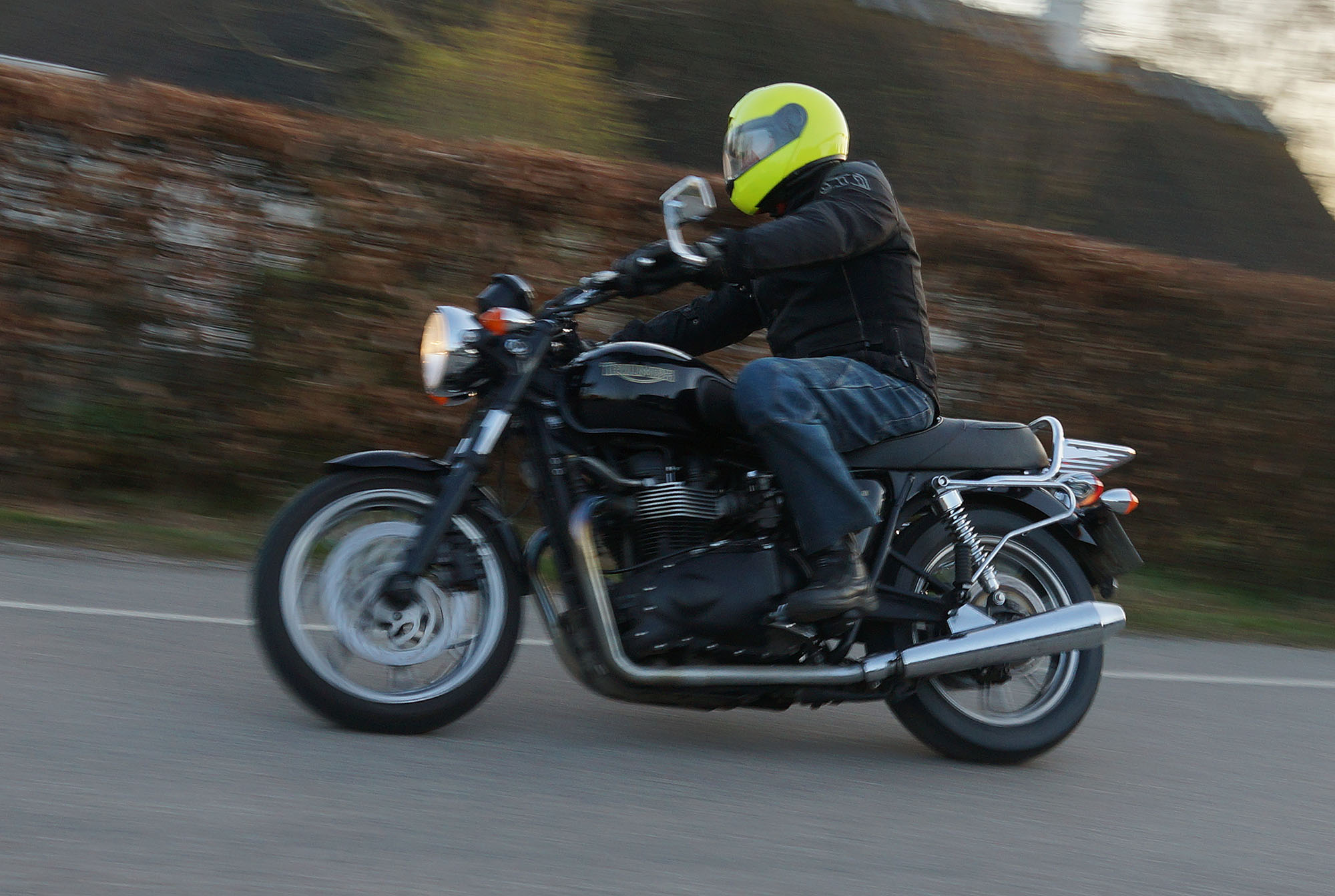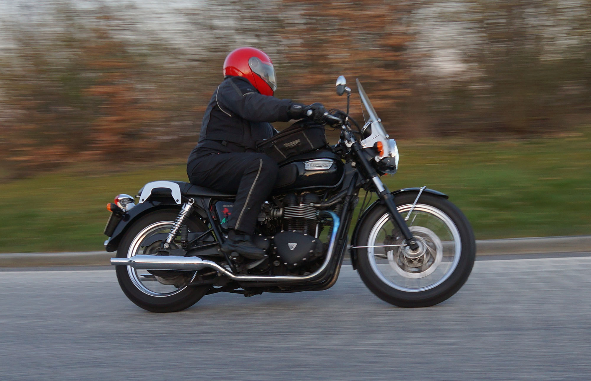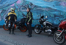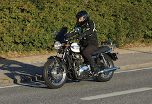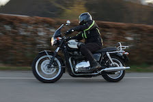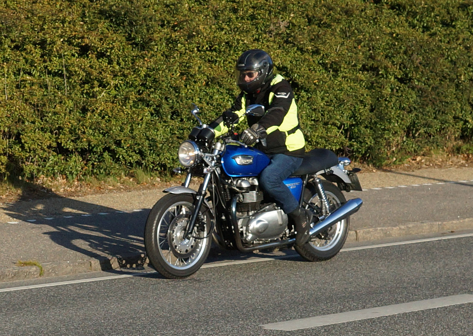 Niels-Jørgen på en sort-hvid Bonneville T100 -05, Henrik på en blå-hvid Bonneville T100 -02,