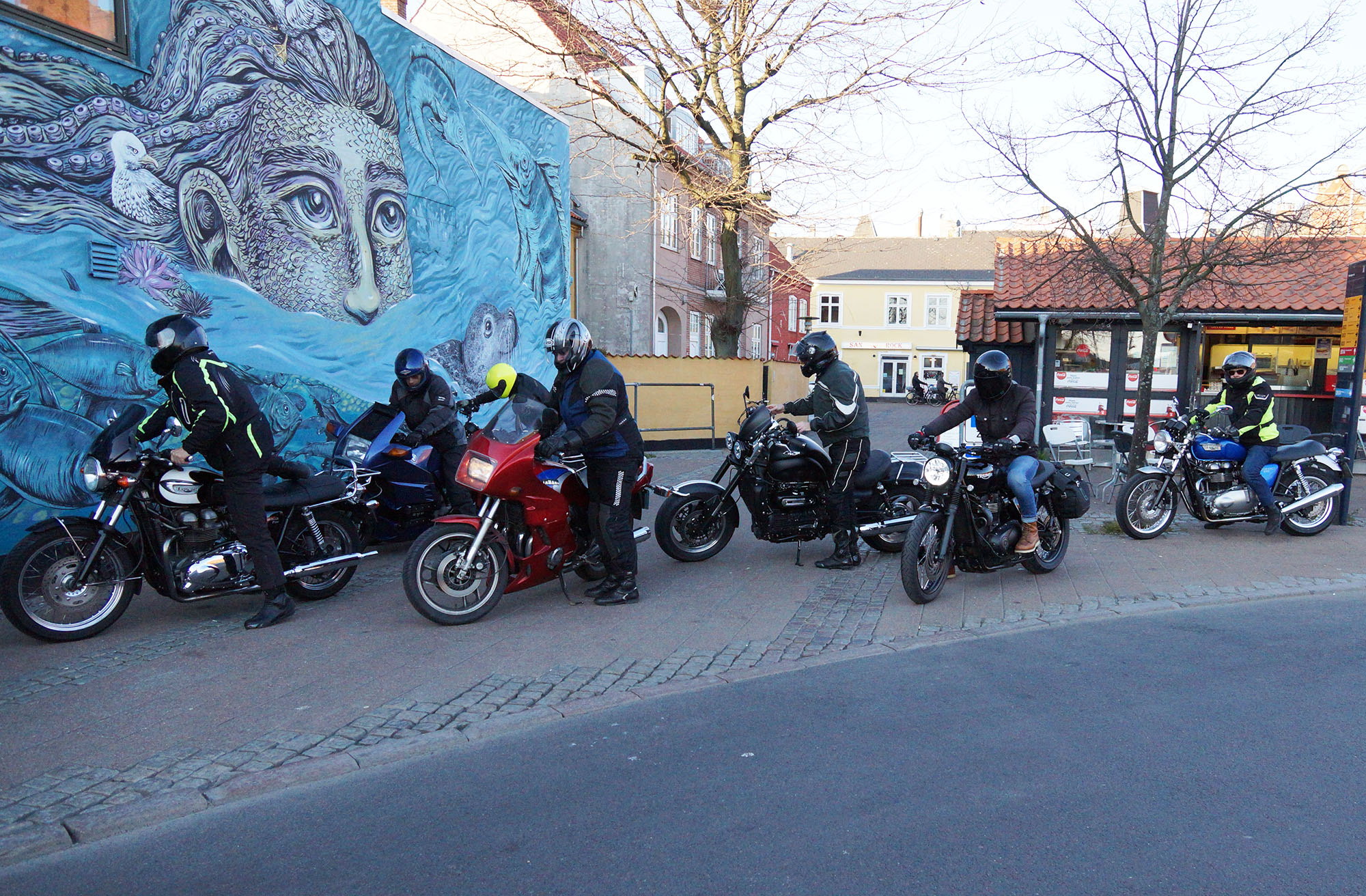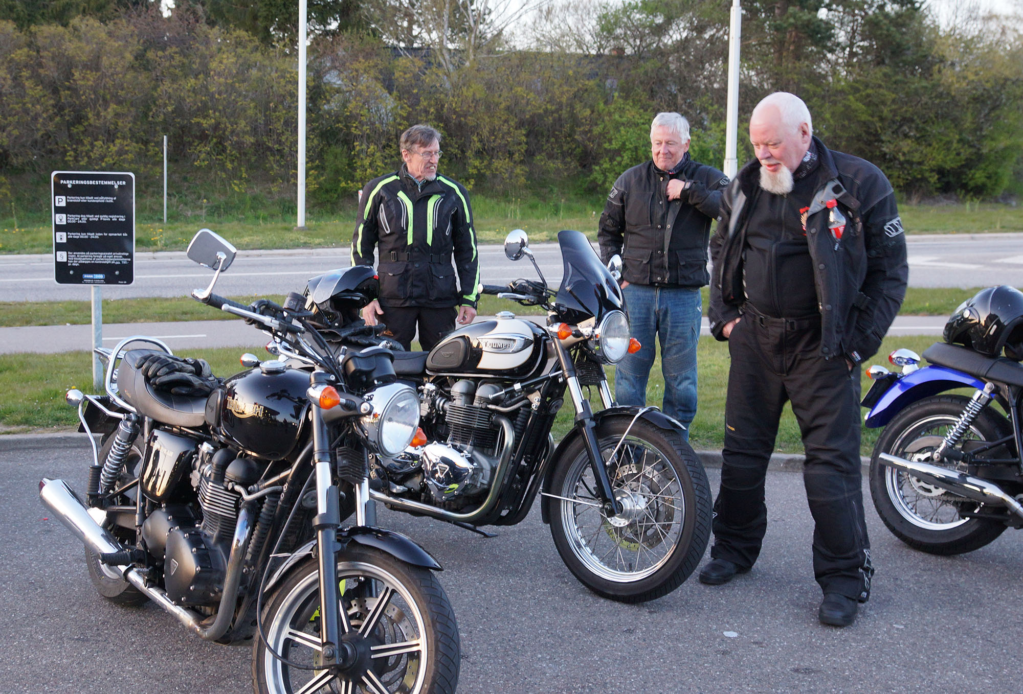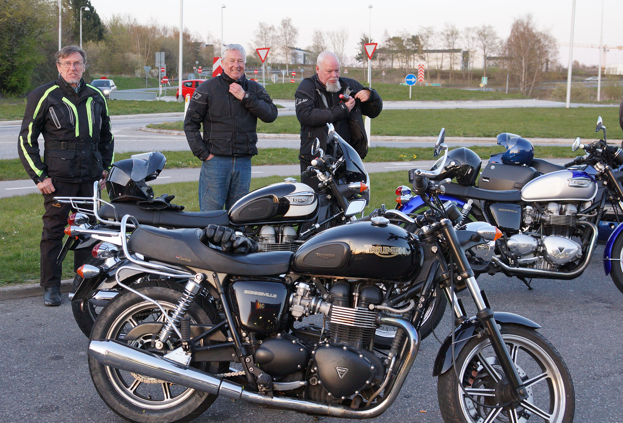 Emil på en sort Street Twin -16, Steen på en blå Thruxton -06, Carsten på en rød