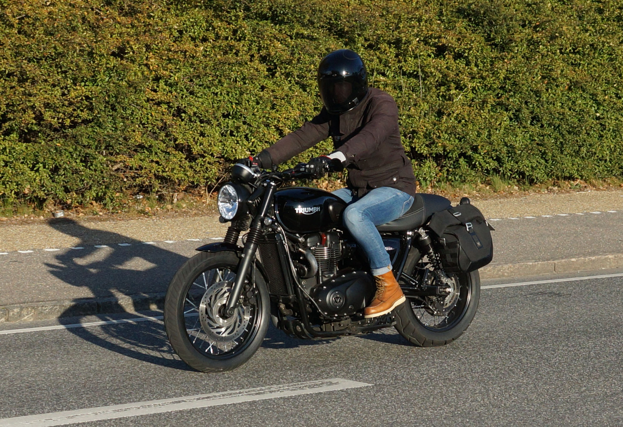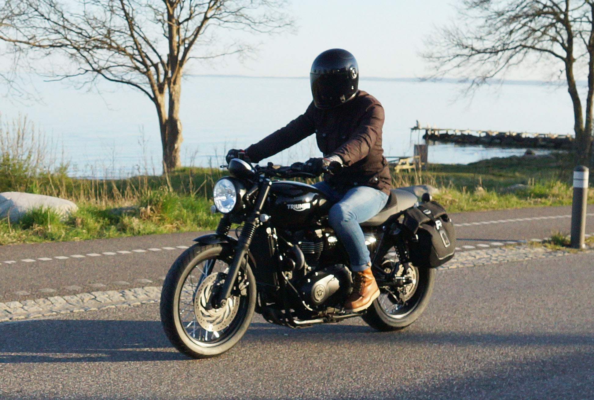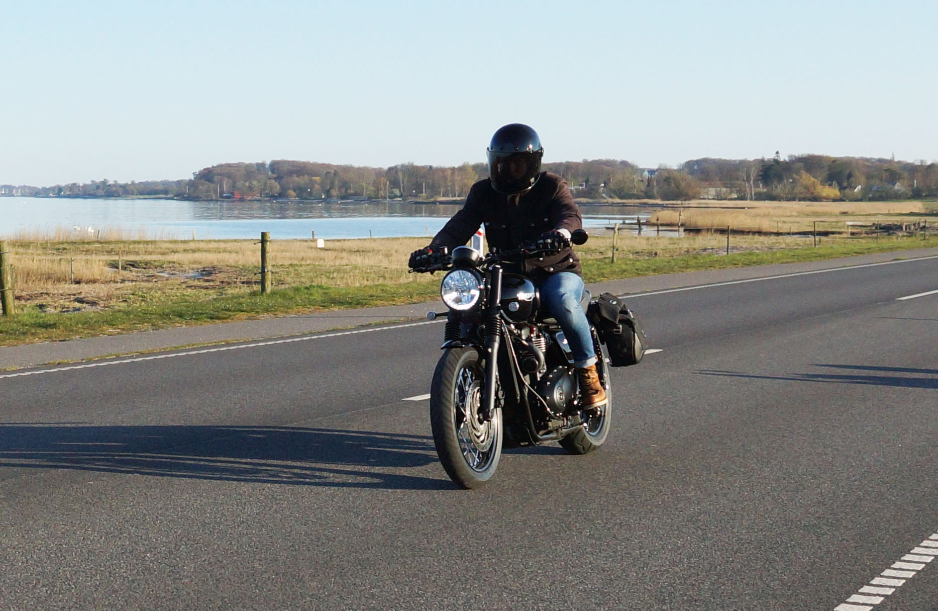 Emil på en sort Street Twin -16, Steen på en blå Thruxton -06, Carsten på en rød