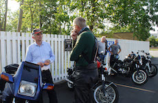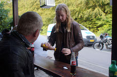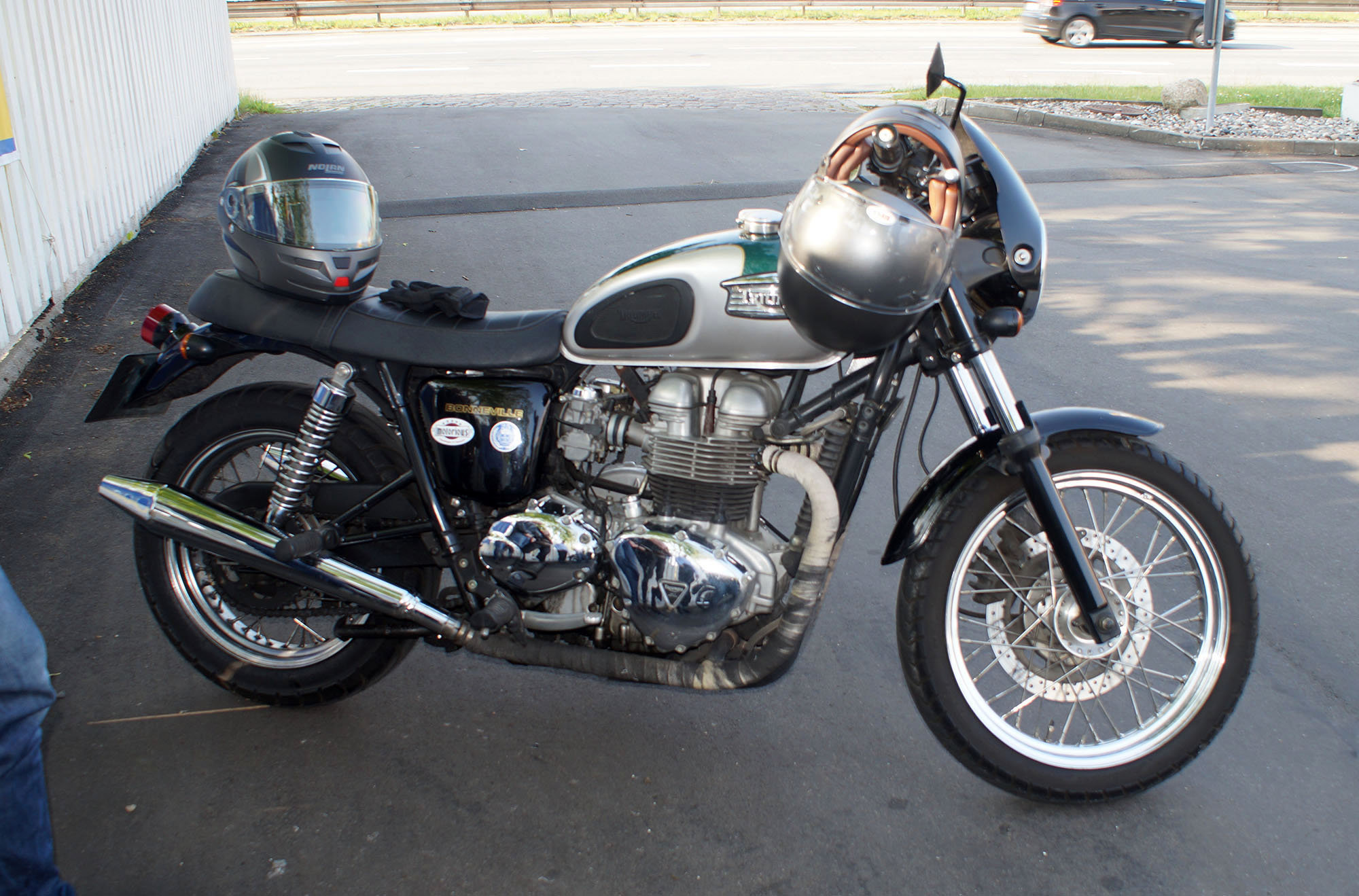 Da vi havde ventet lidt kom Mads-Peter på en sølv/grøn Bonneville -01,