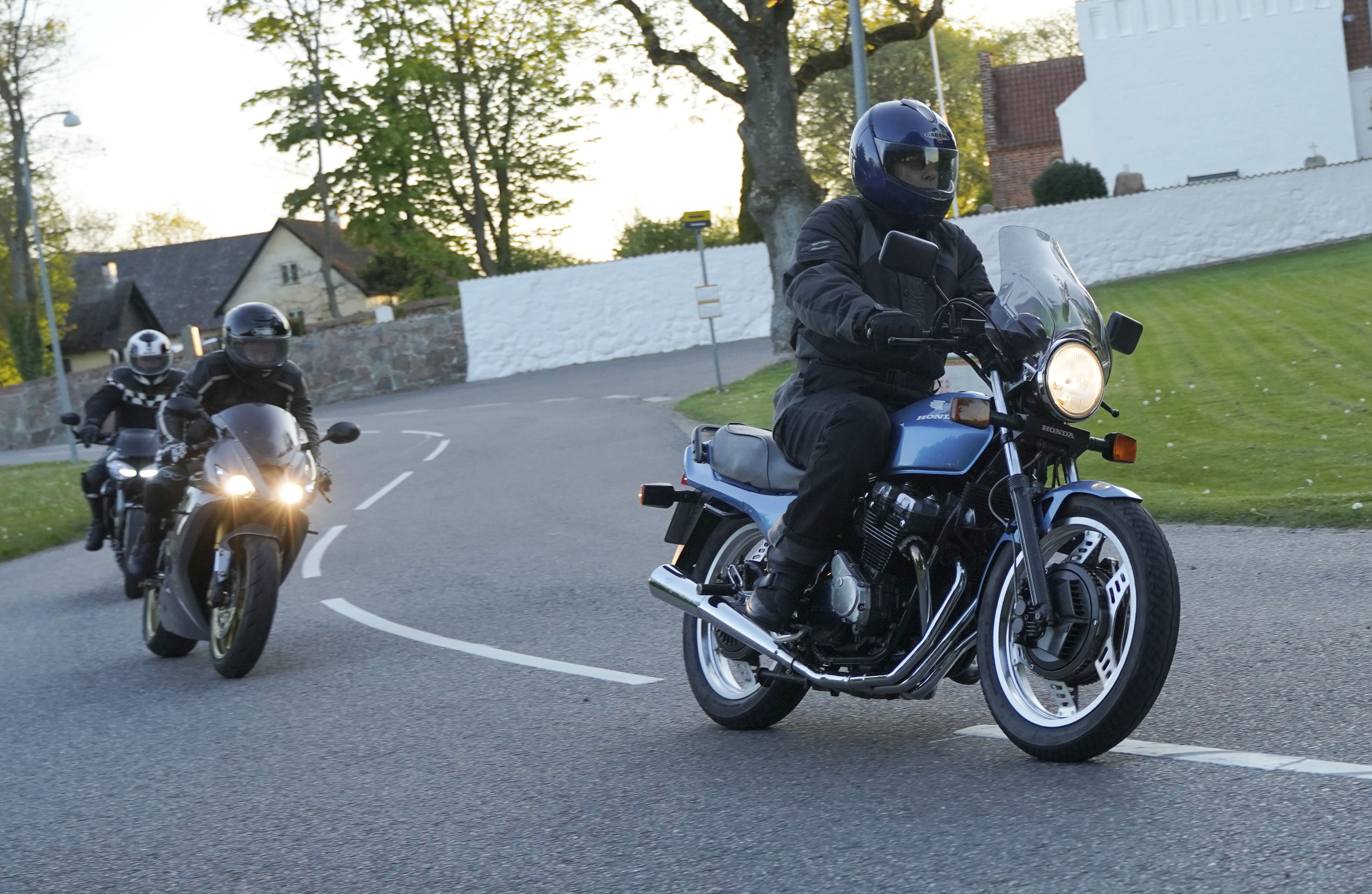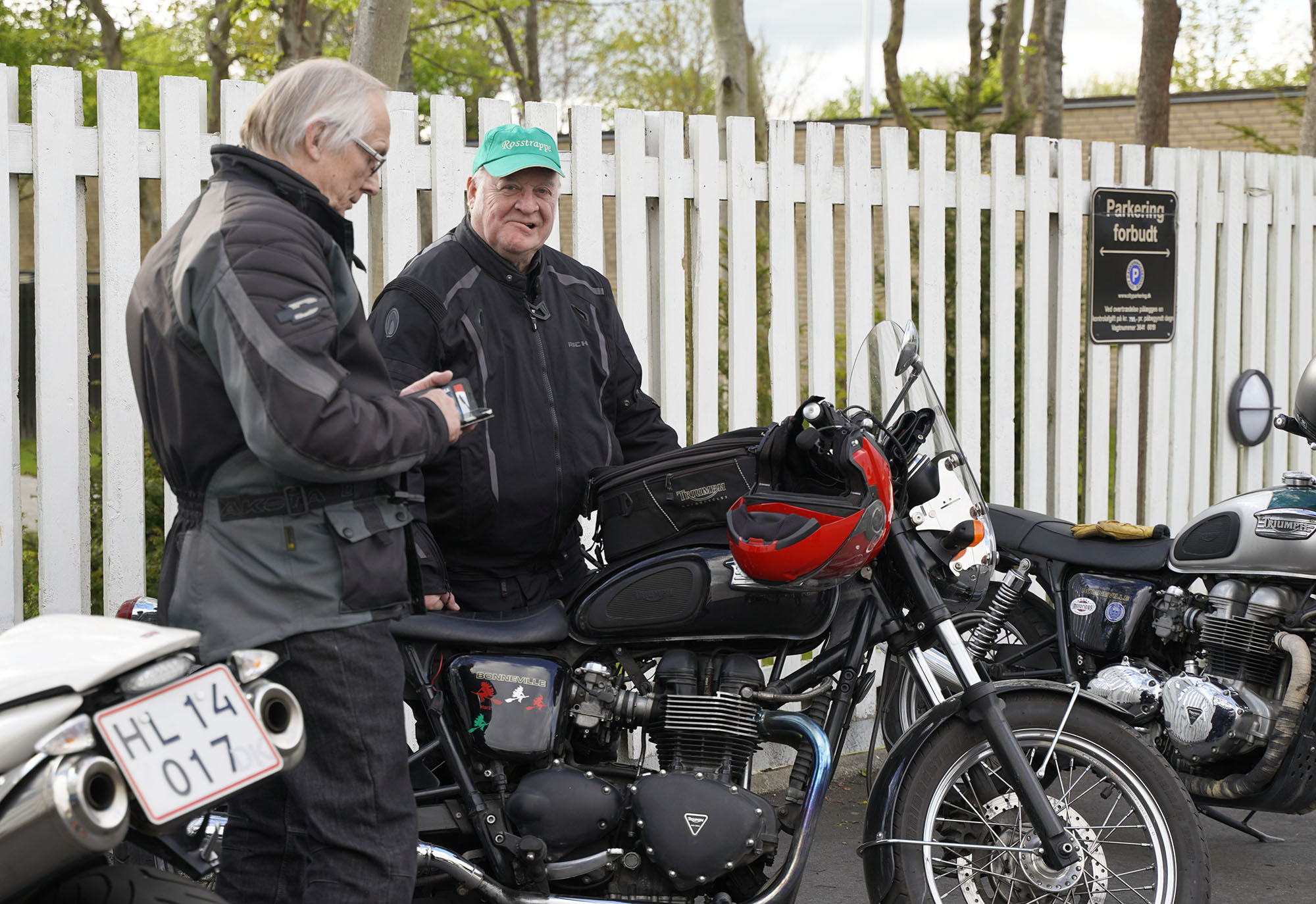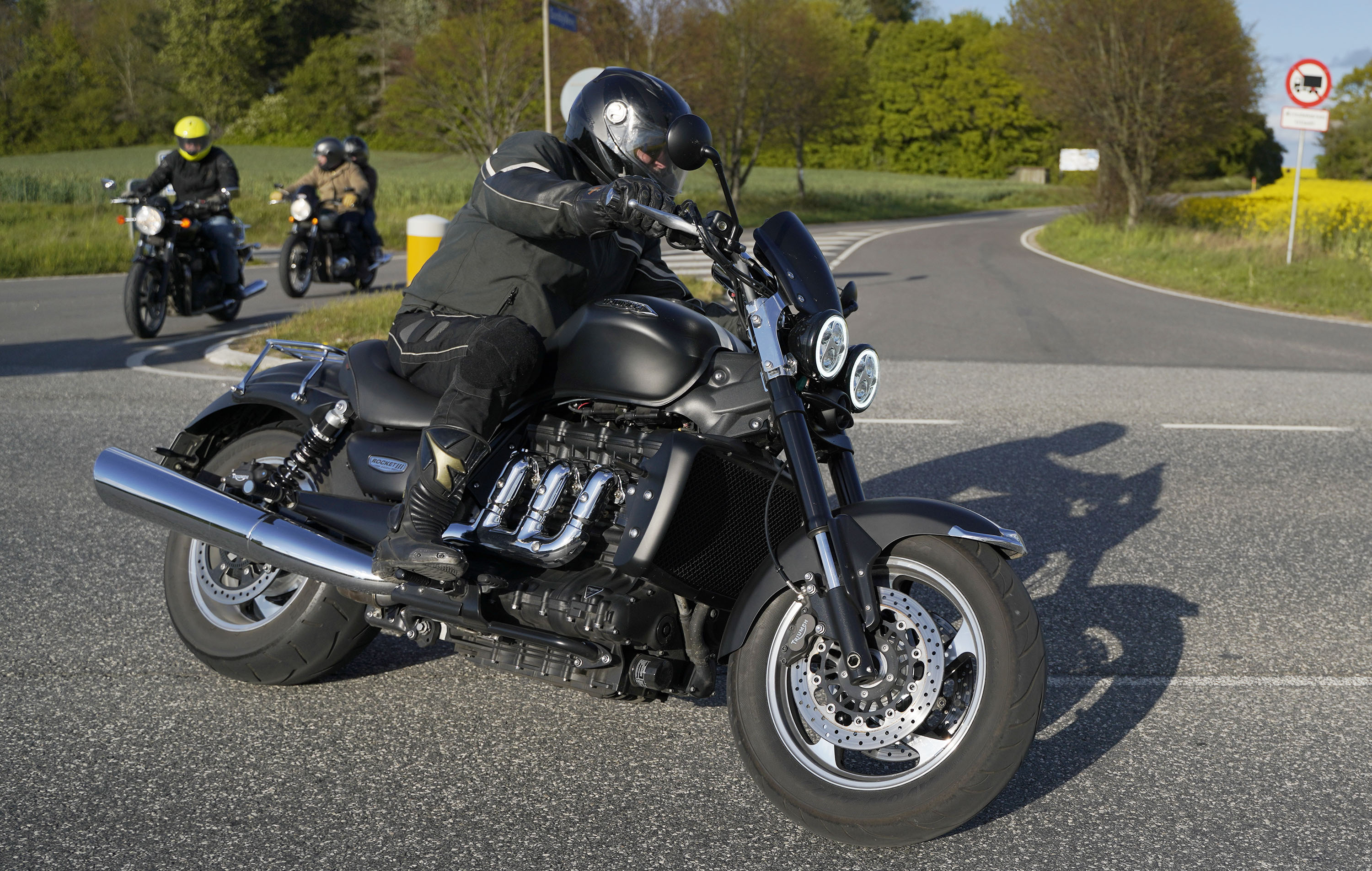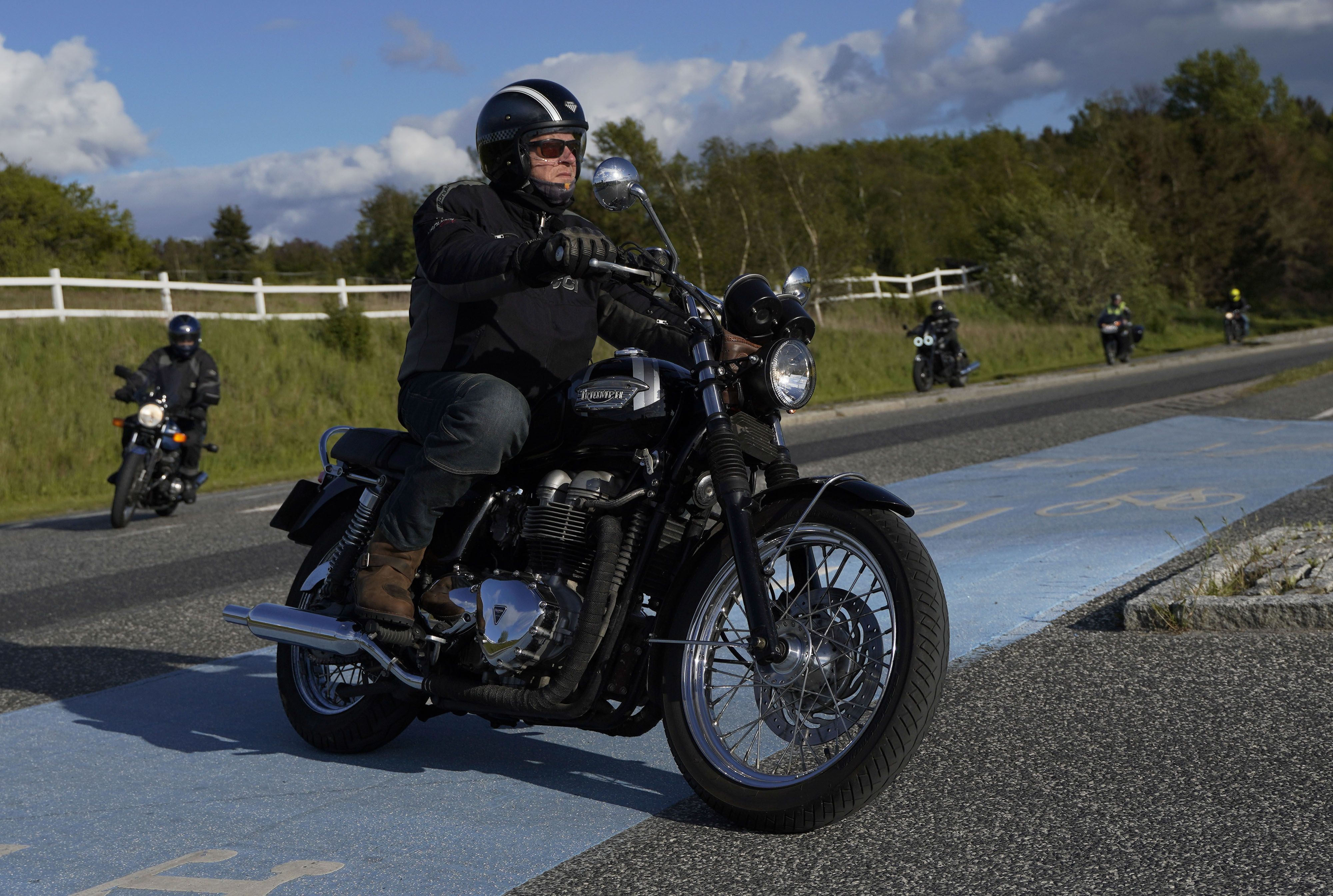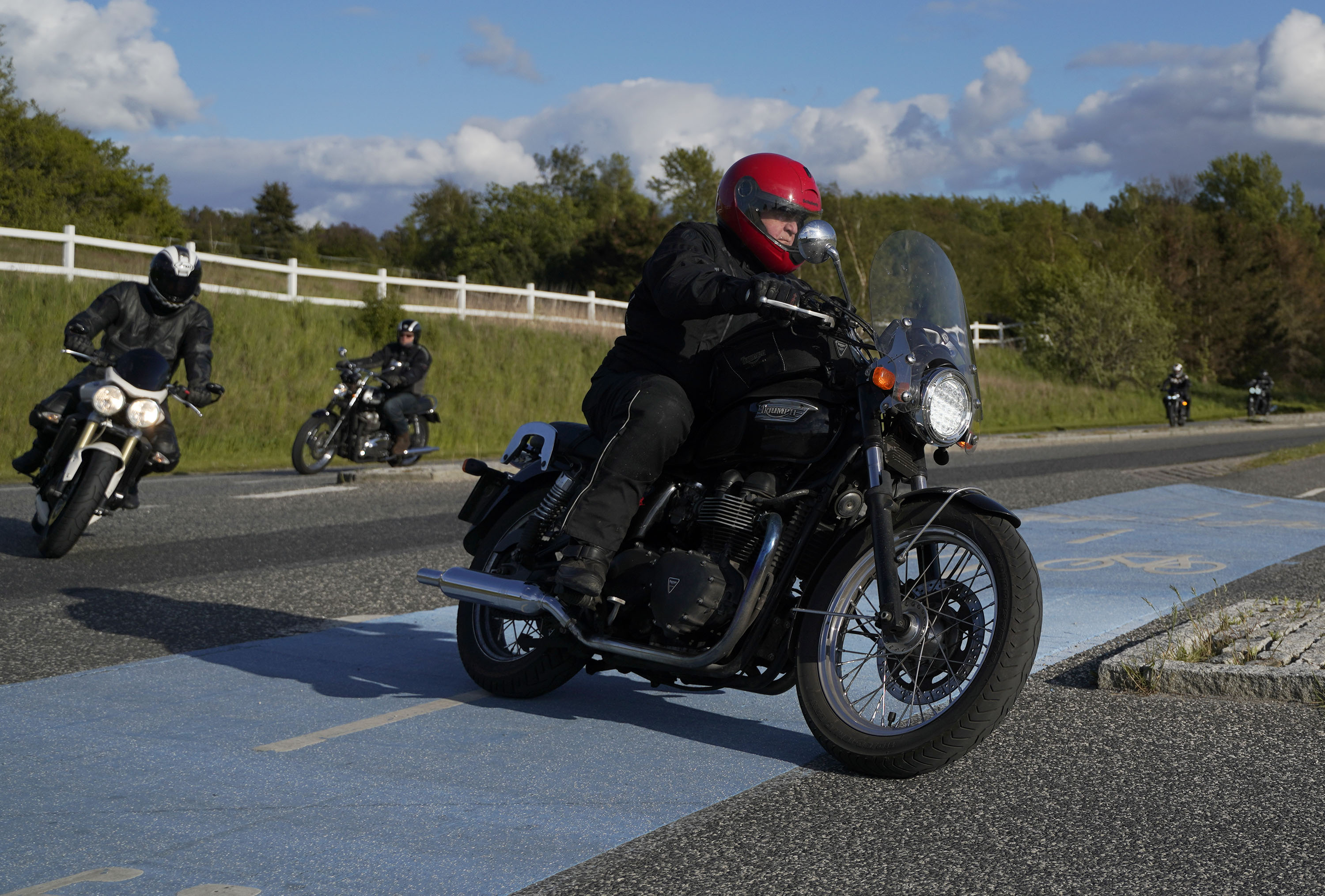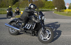 Jan på en sort Rocket III -14, Henrik på en sort Bonneville -04, Klaus på en hvid Street