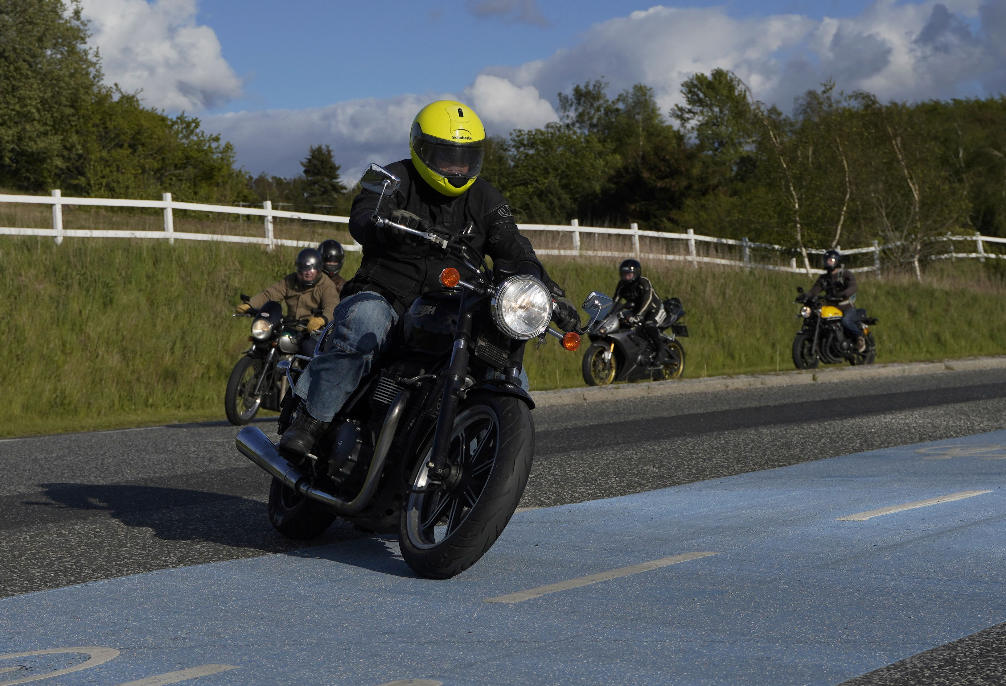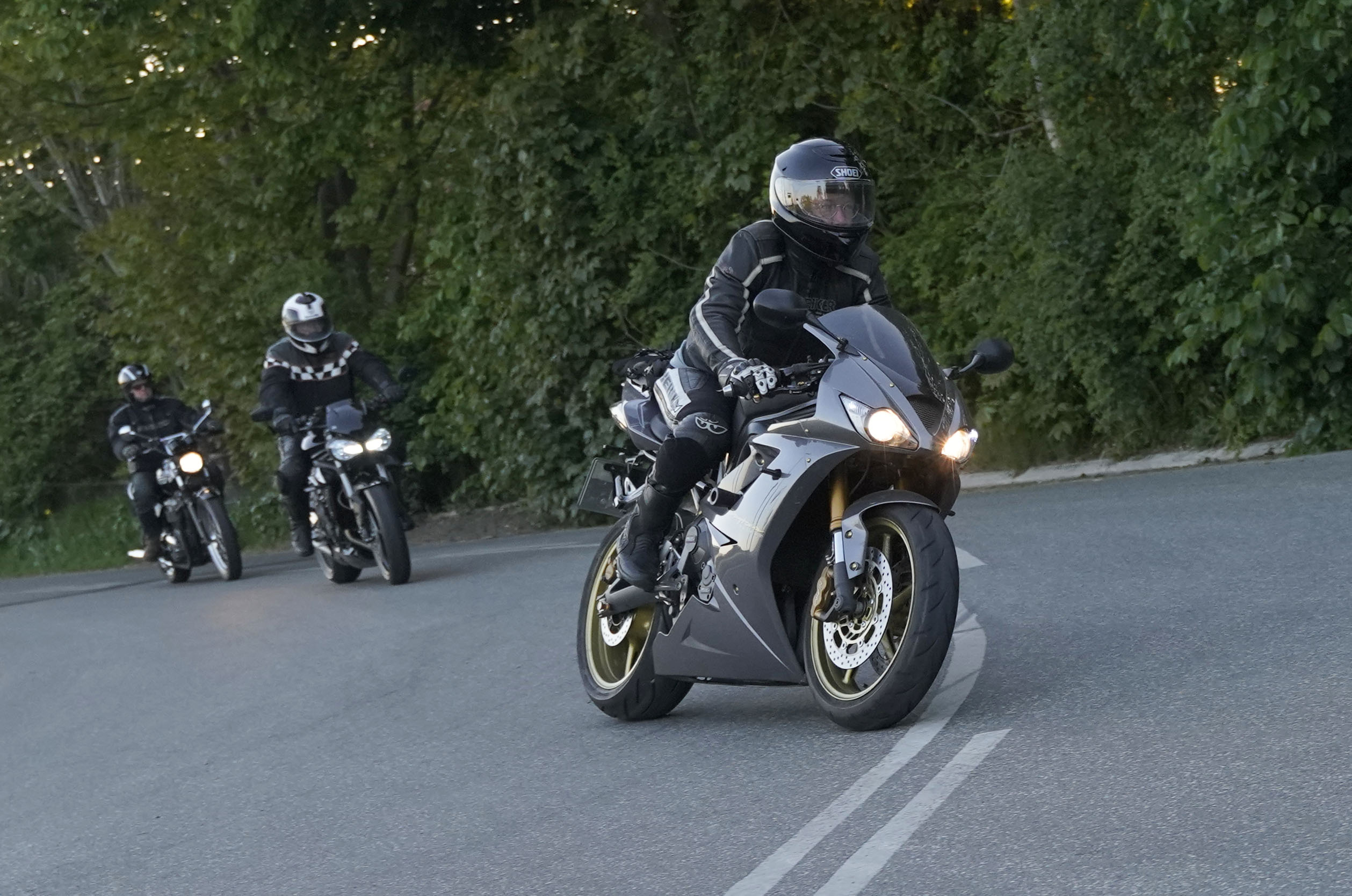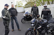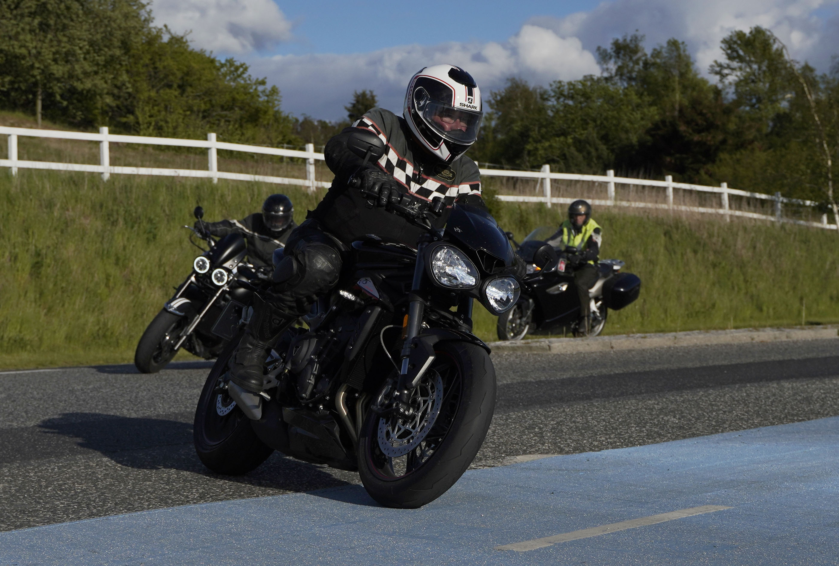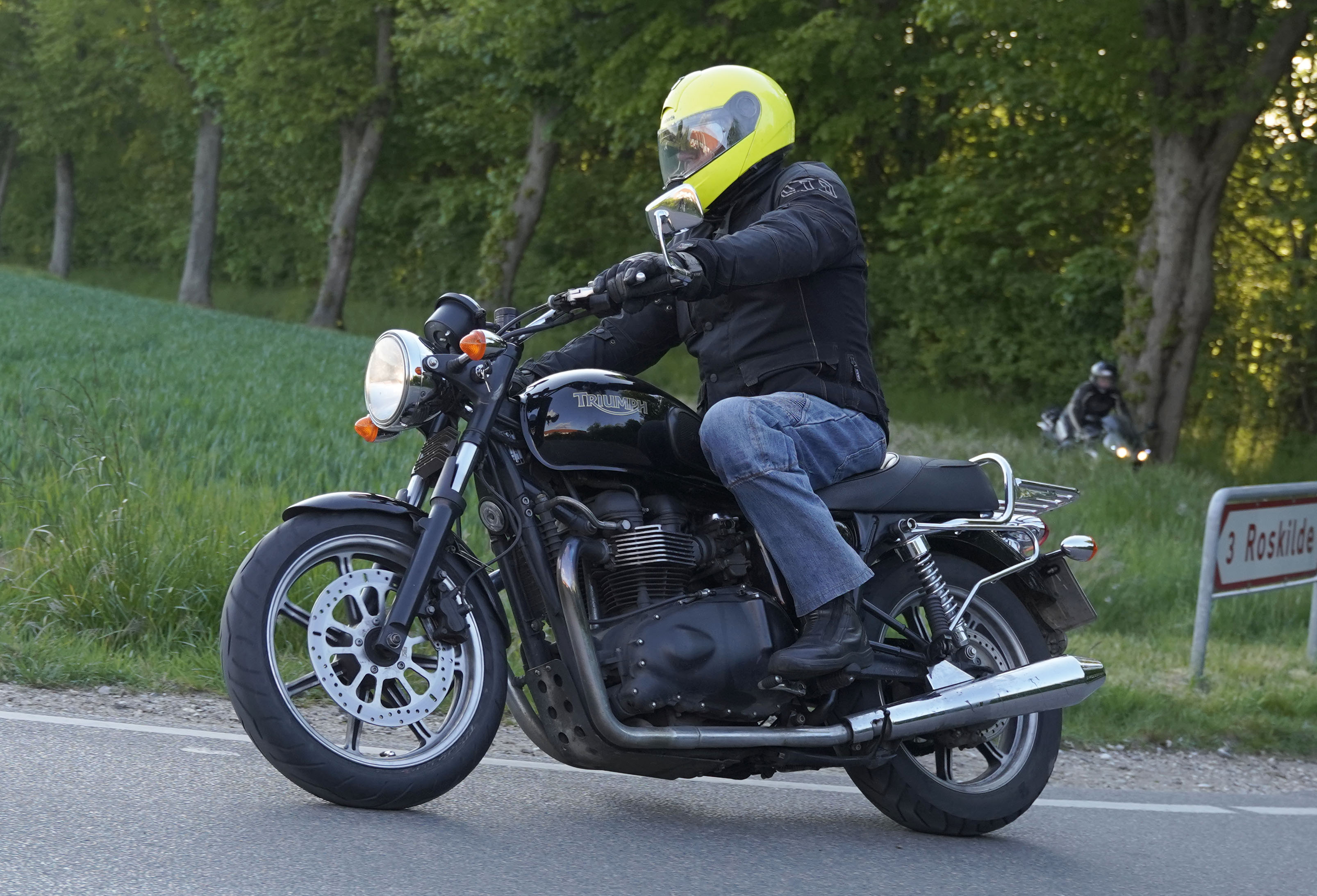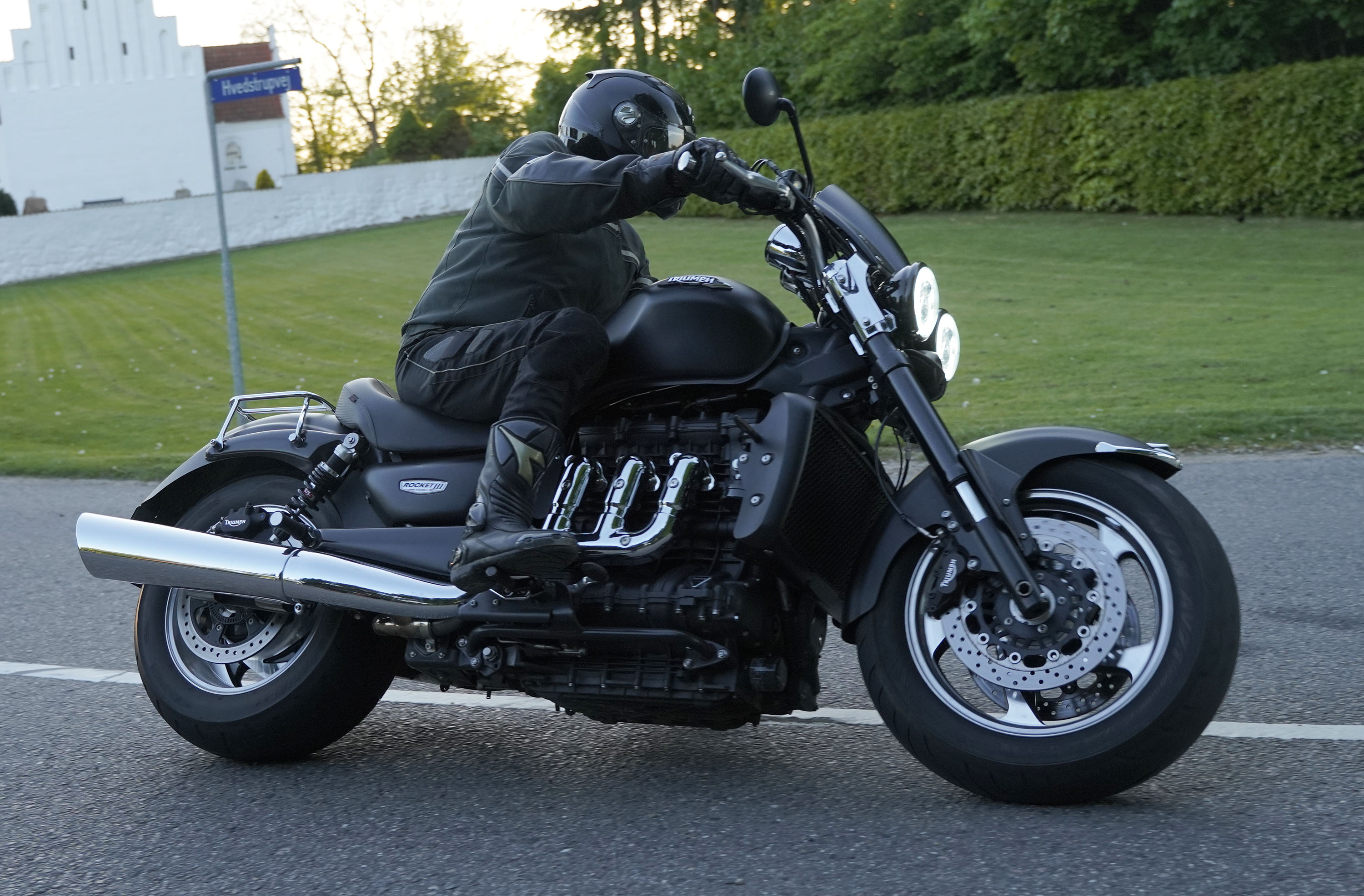 Jan på en sort Rocket III -14, Henrik på en sort Bonneville -04, Klaus på en hvid Street
