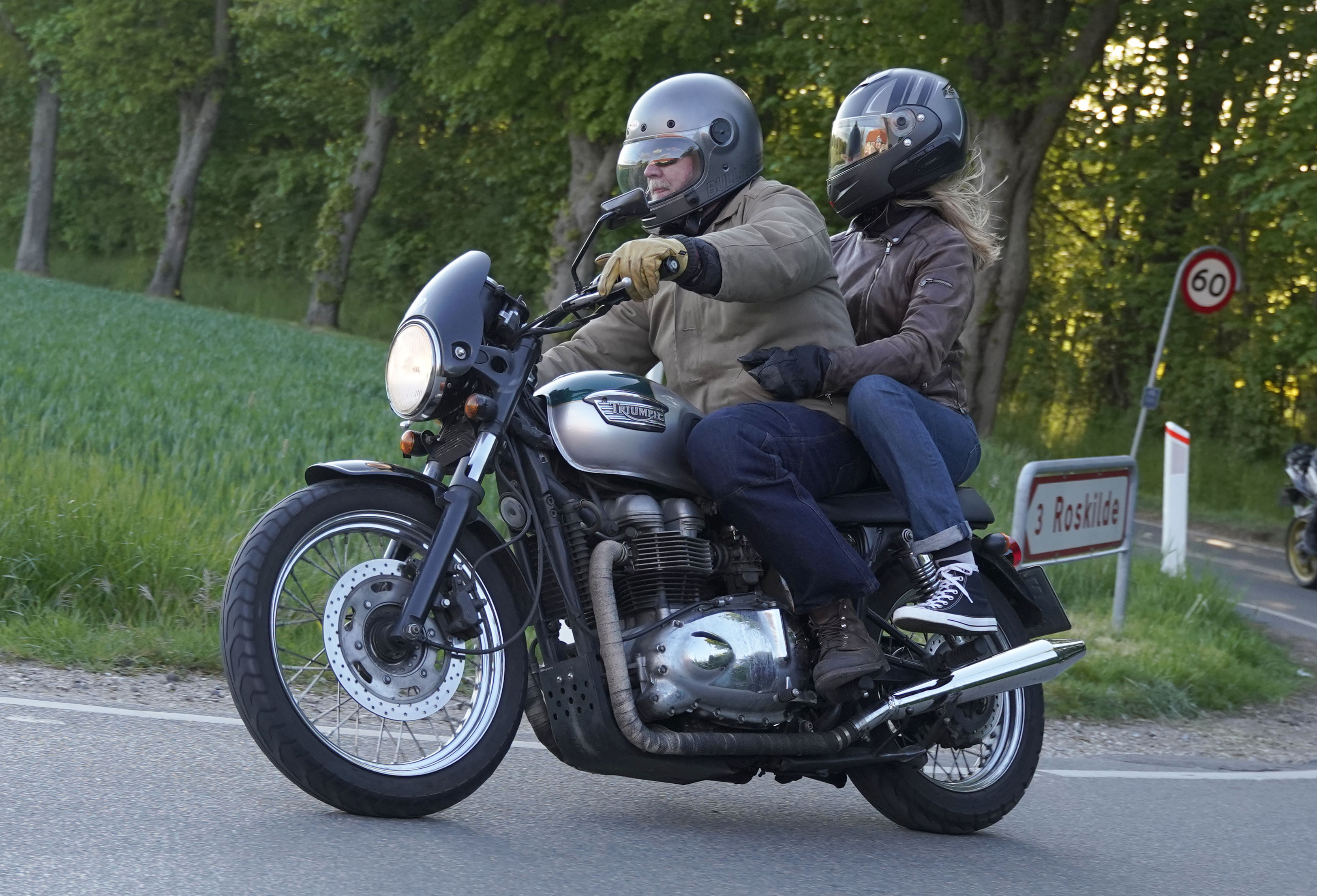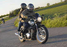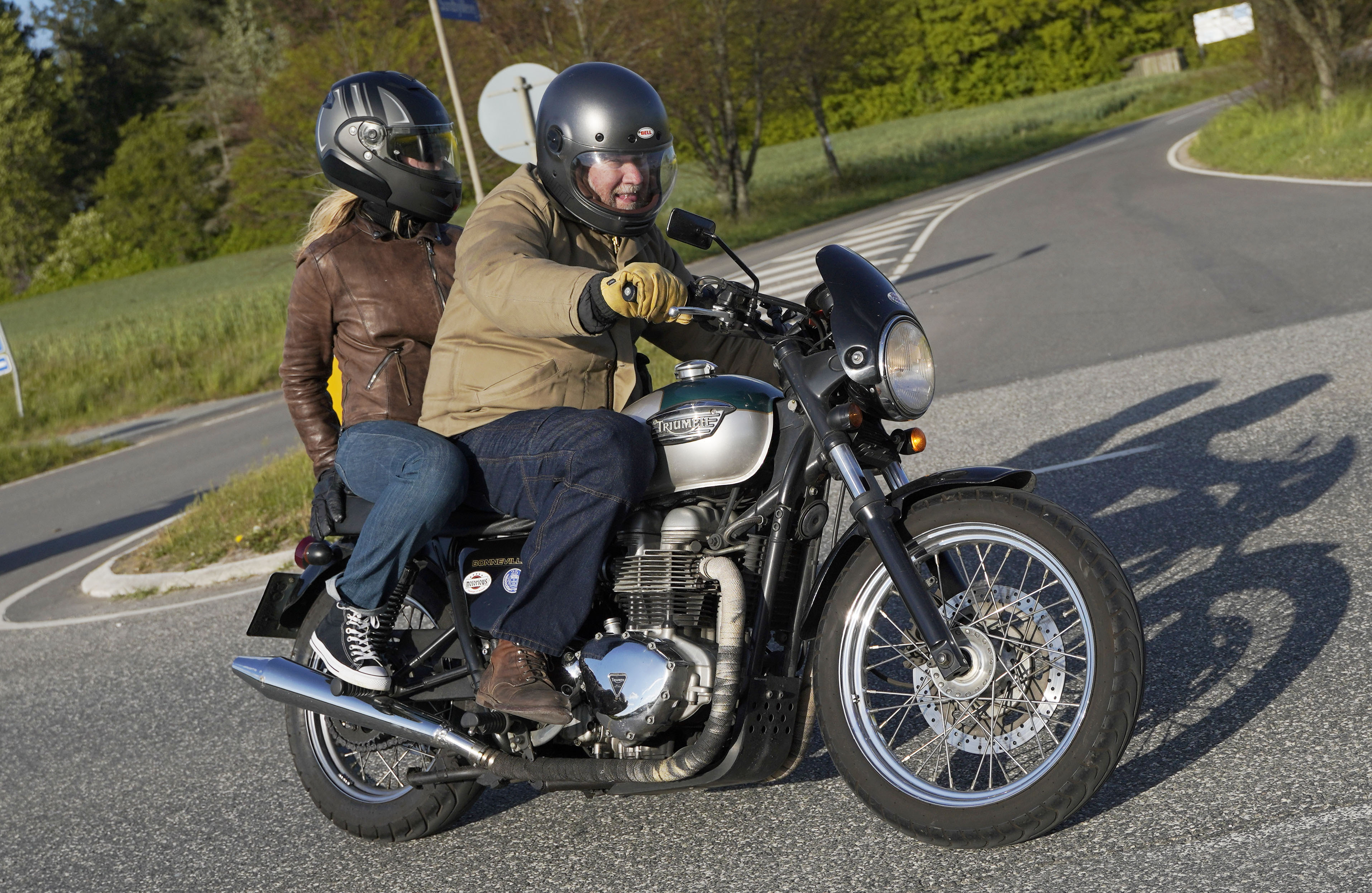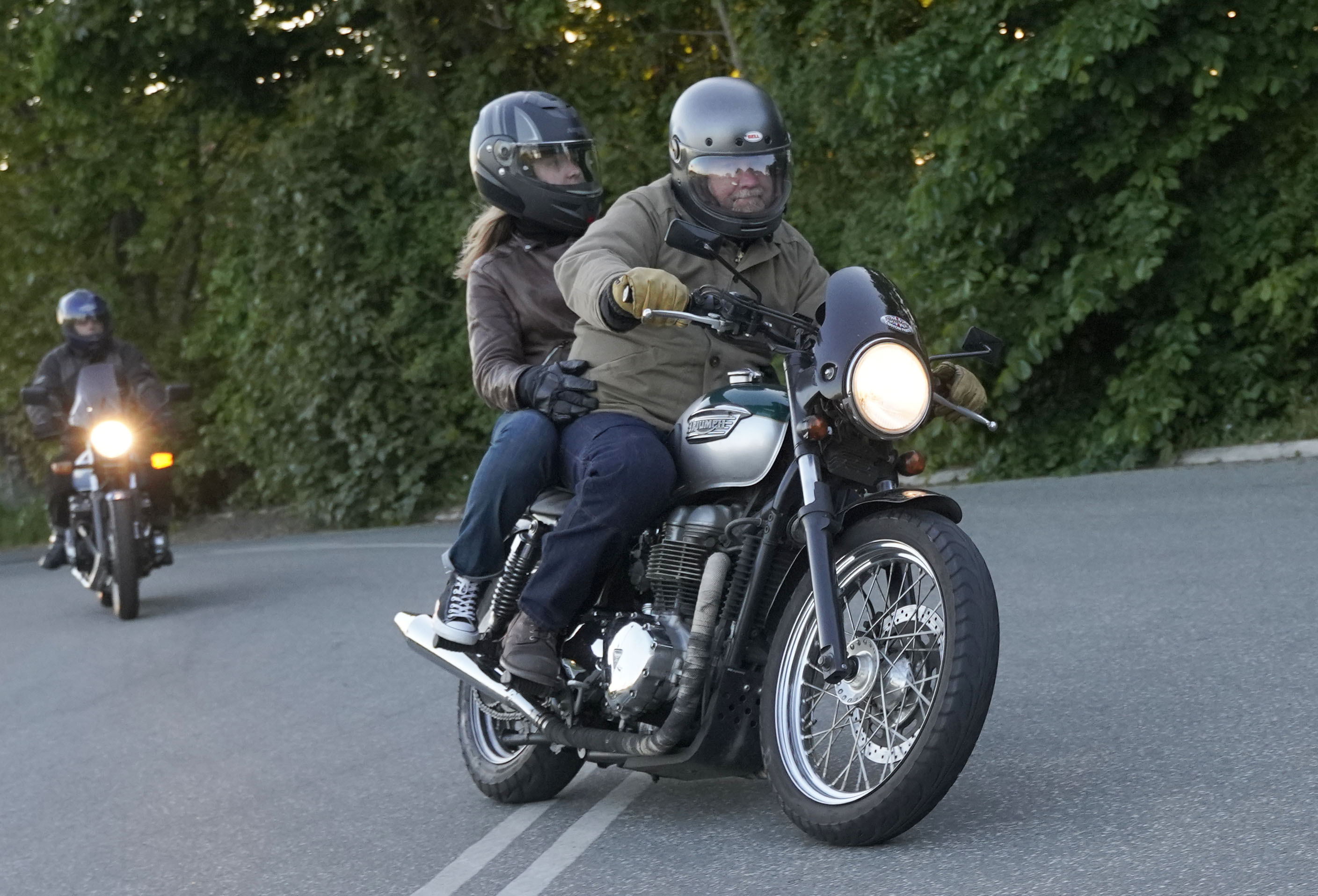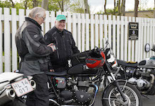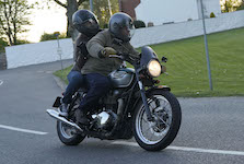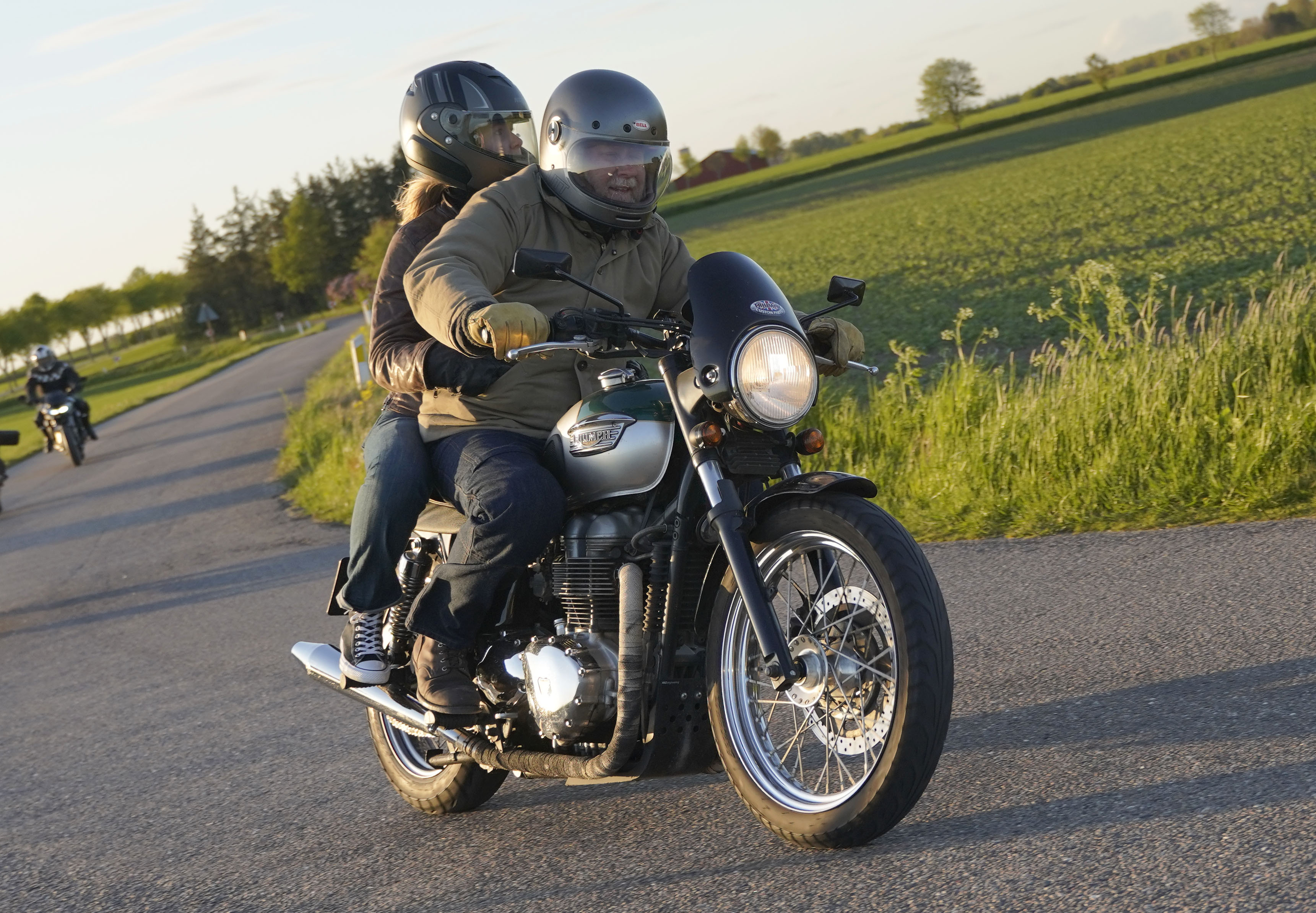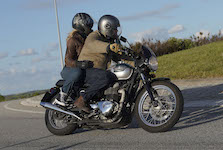Niels på en sort Bonneville -10, Mads-Peter og Karla på en grøn/sølv Bonneville -01.