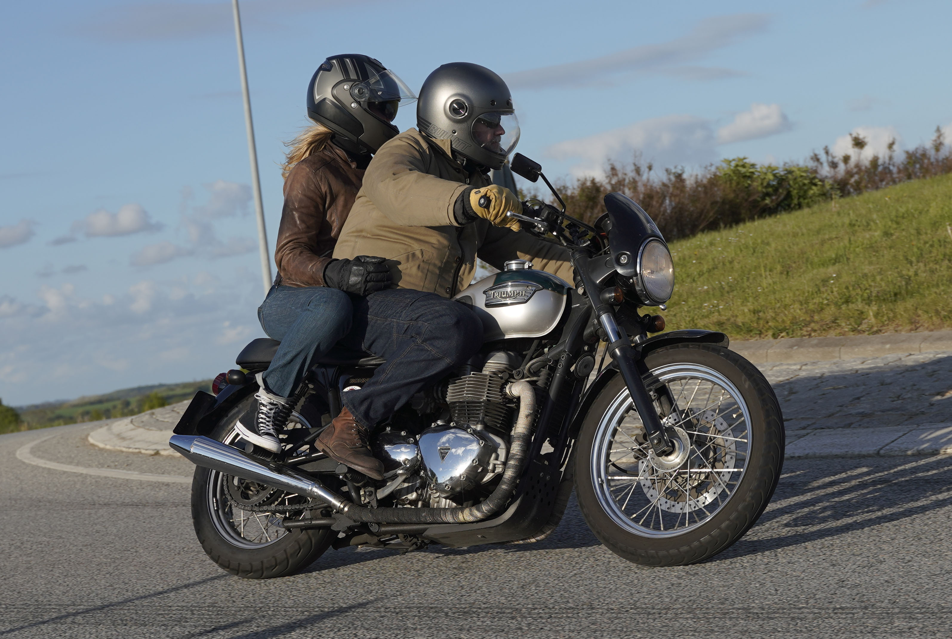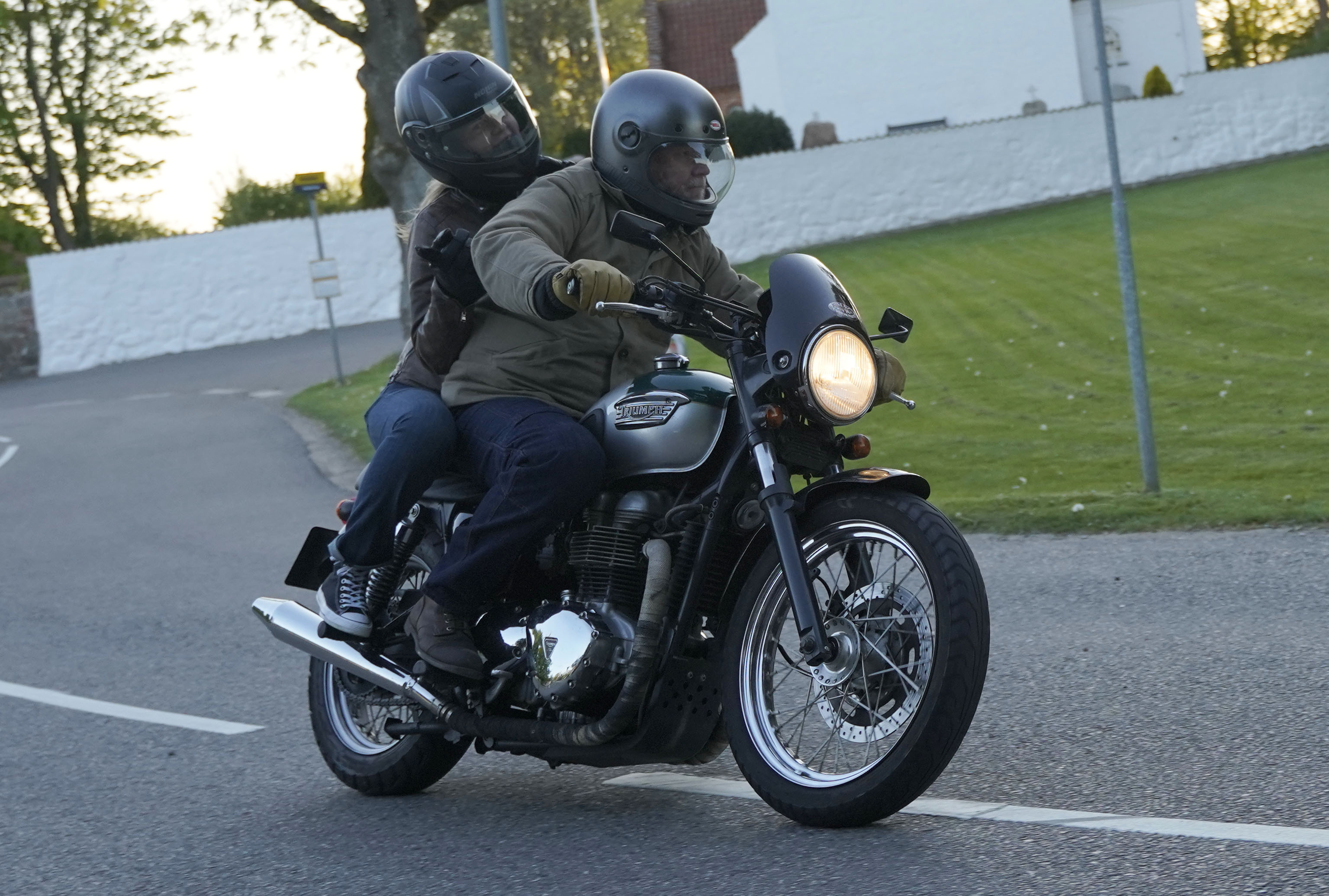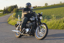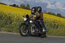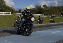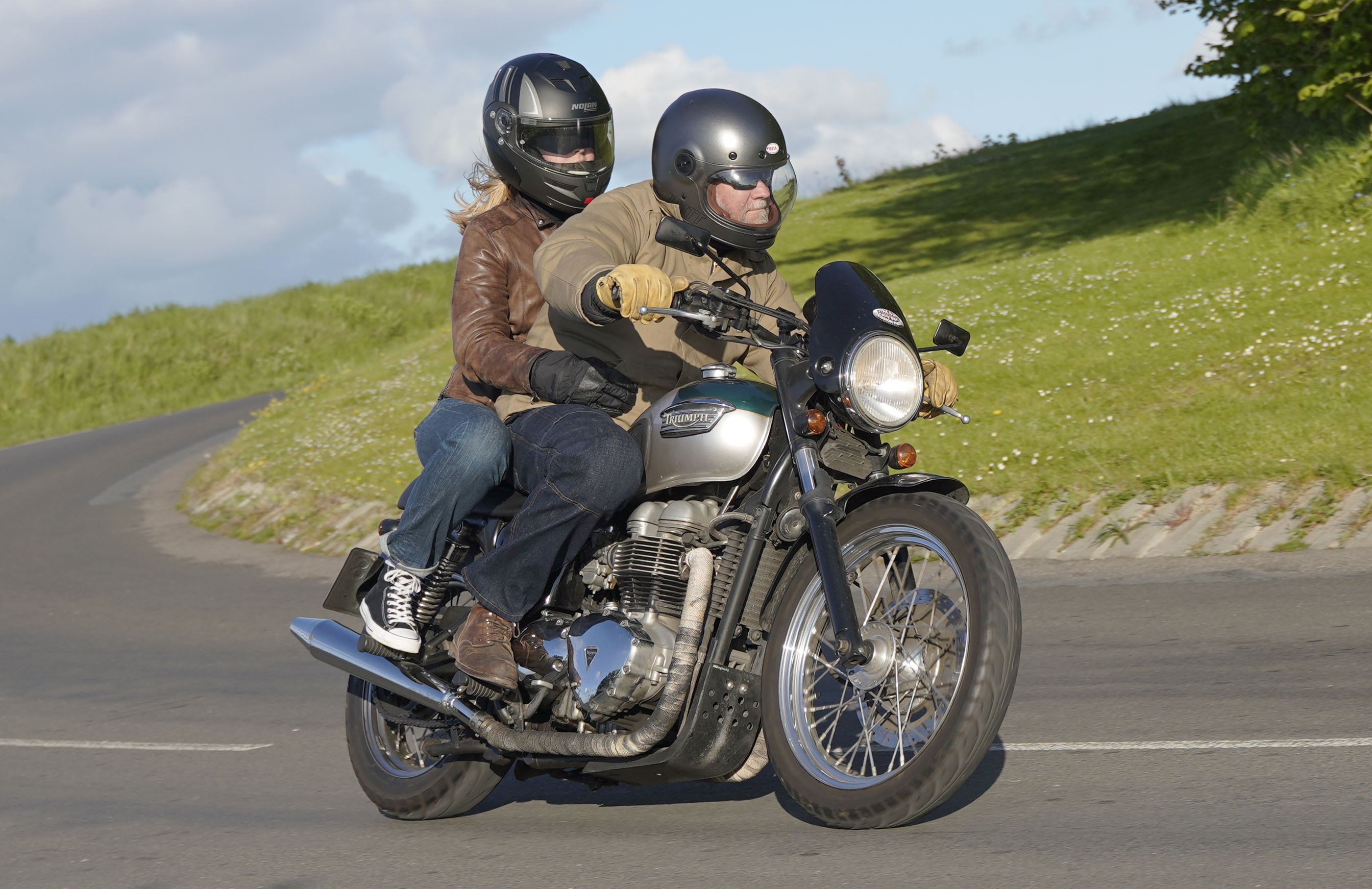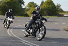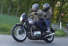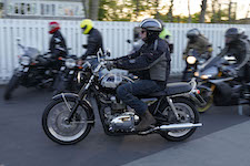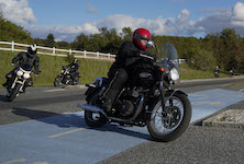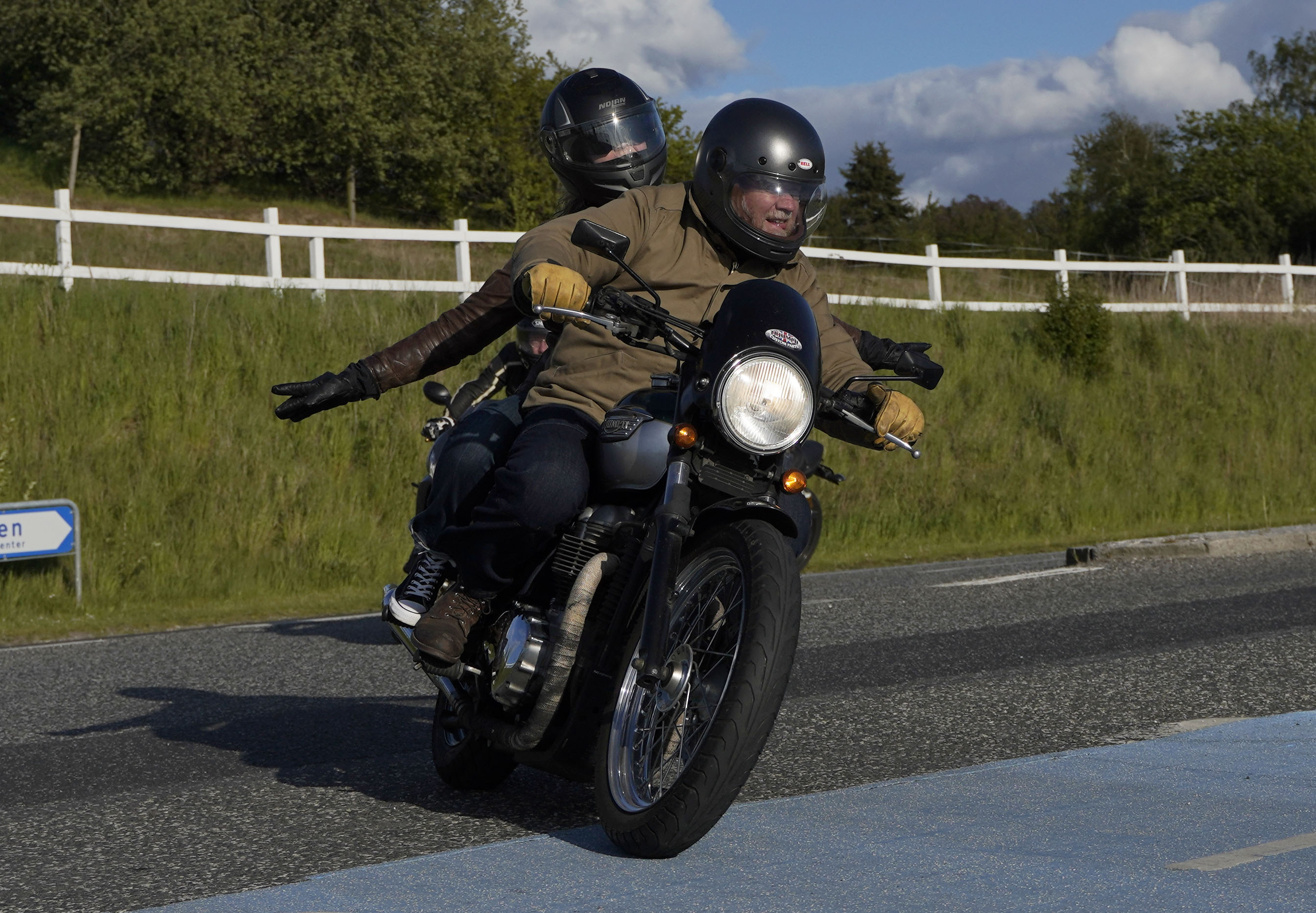 Niels på en sort Bonneville -10, Mads-Peter og Karla på en grøn/sølv Bonneville -01.