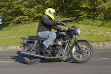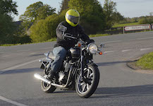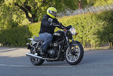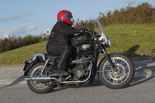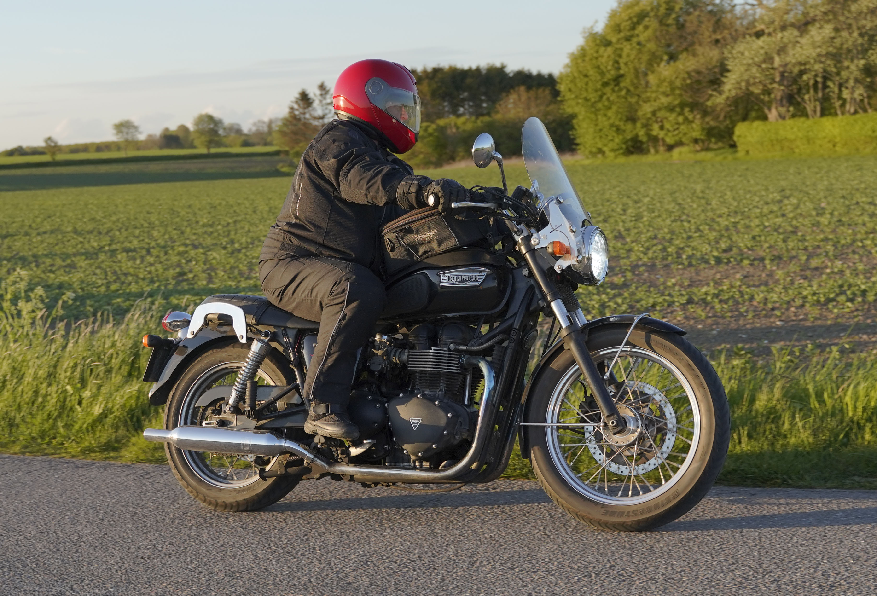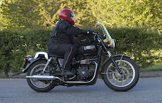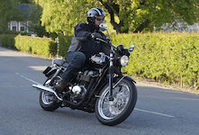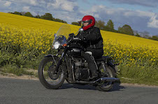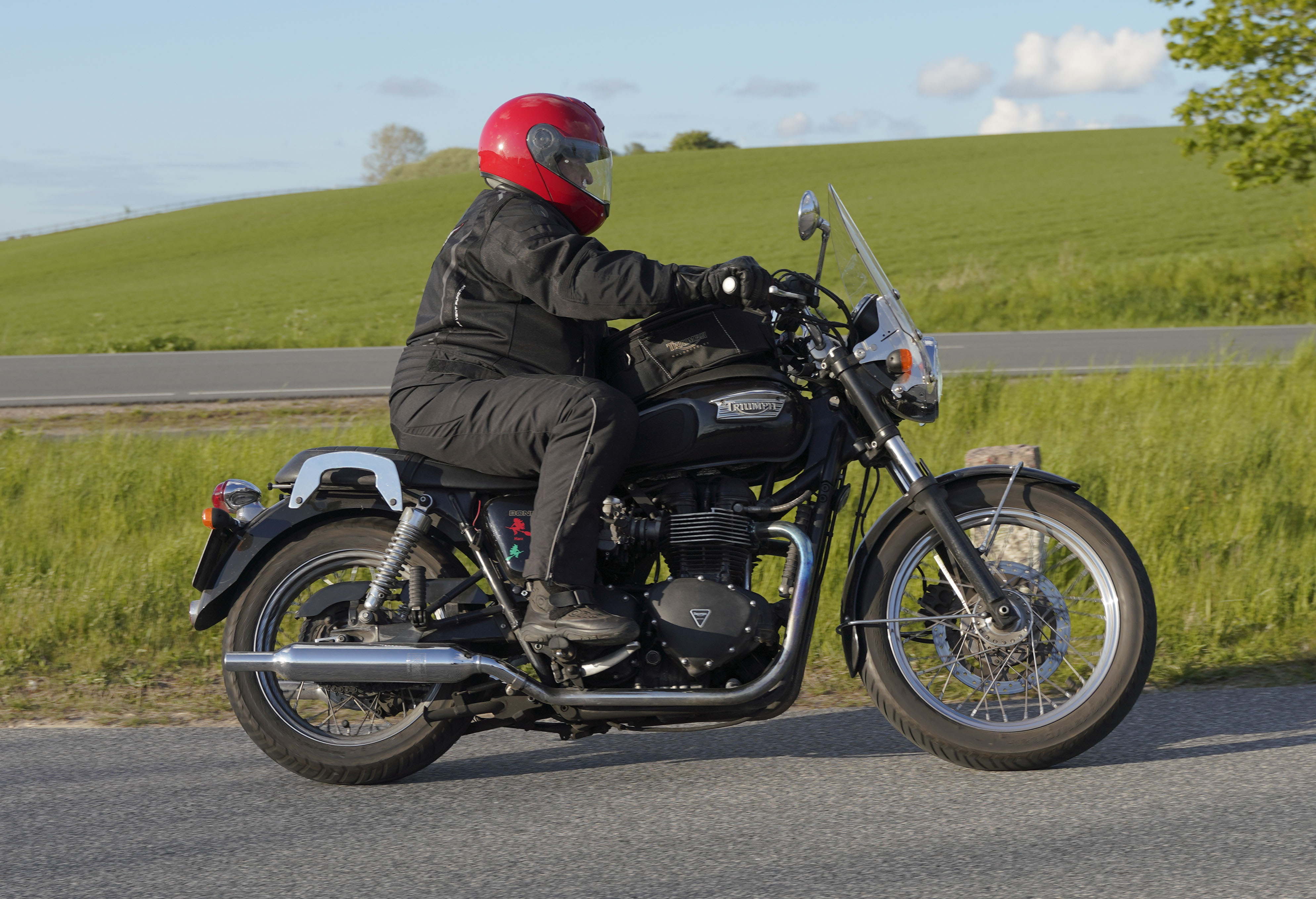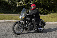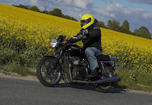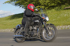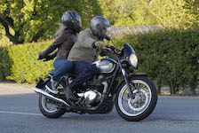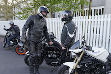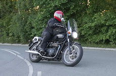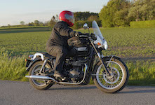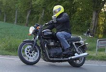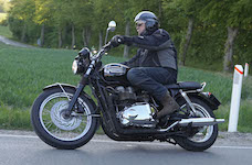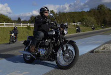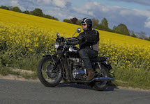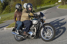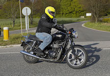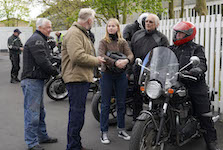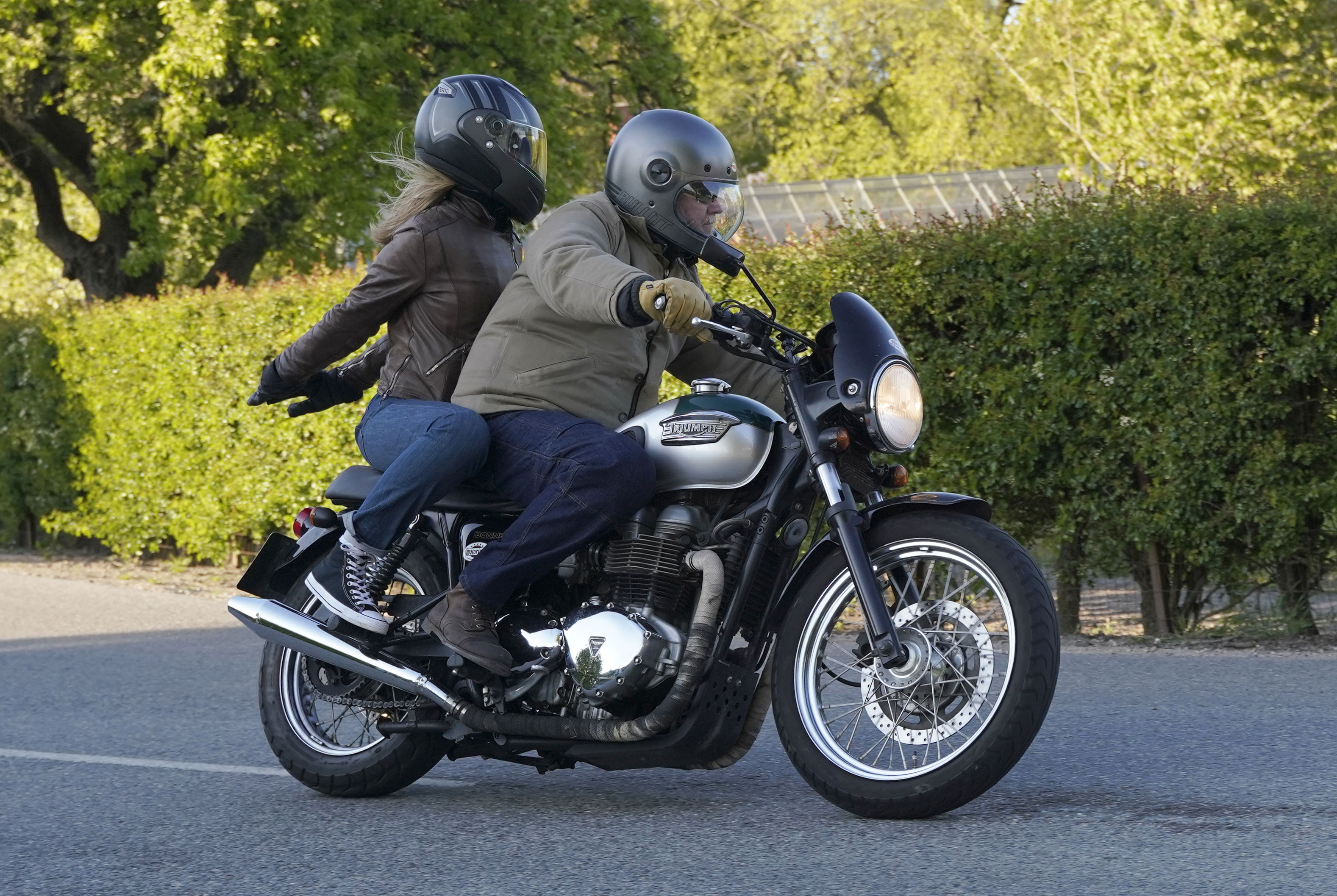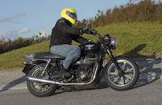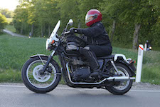 Niels på en sort Bonneville -10, Mads-Peter og Karla på en grøn/sølv Bonneville -01.