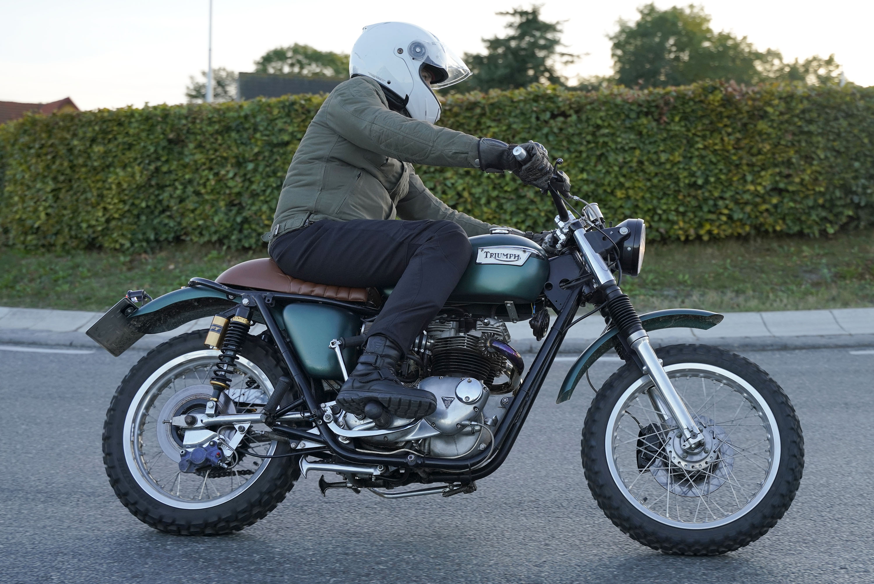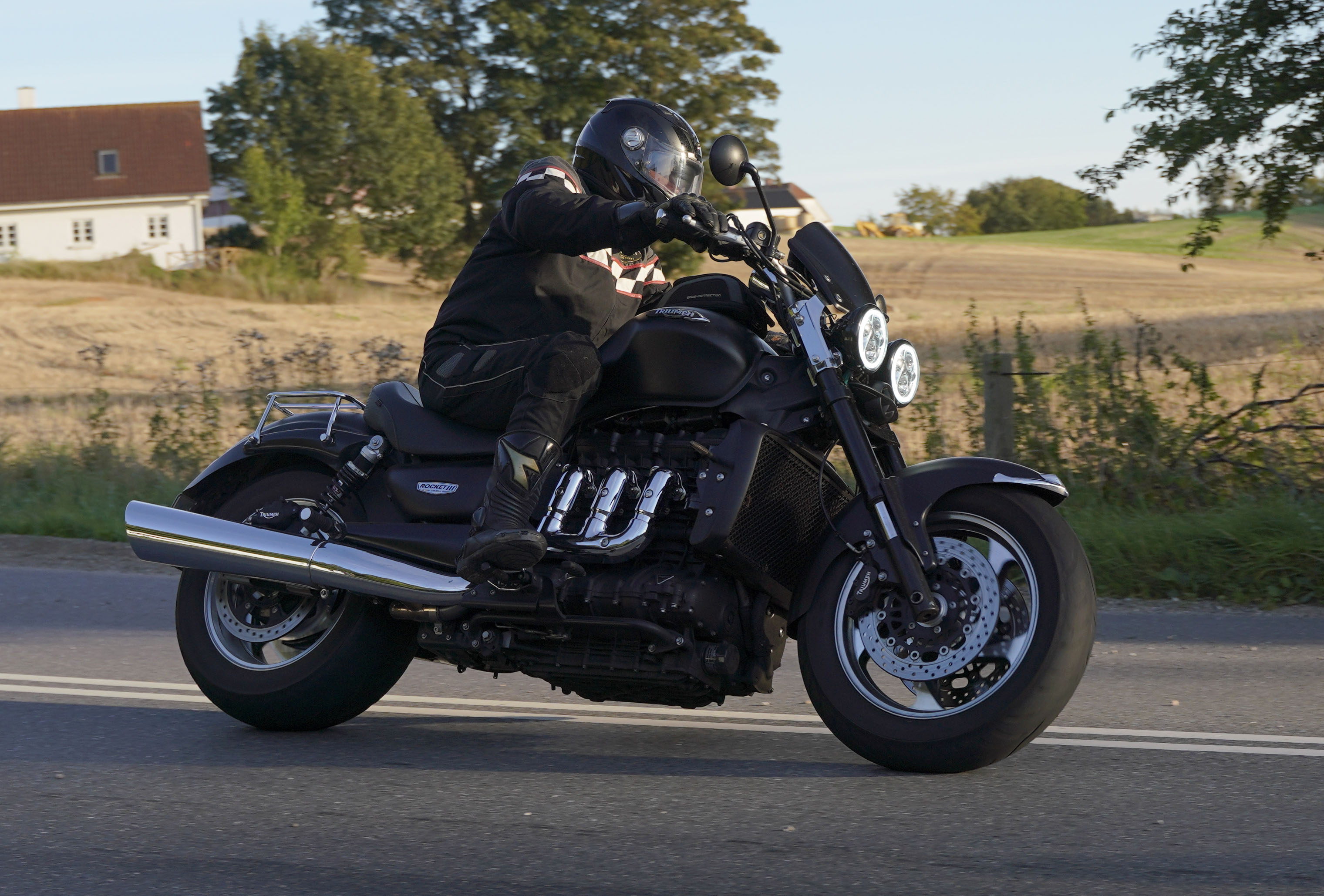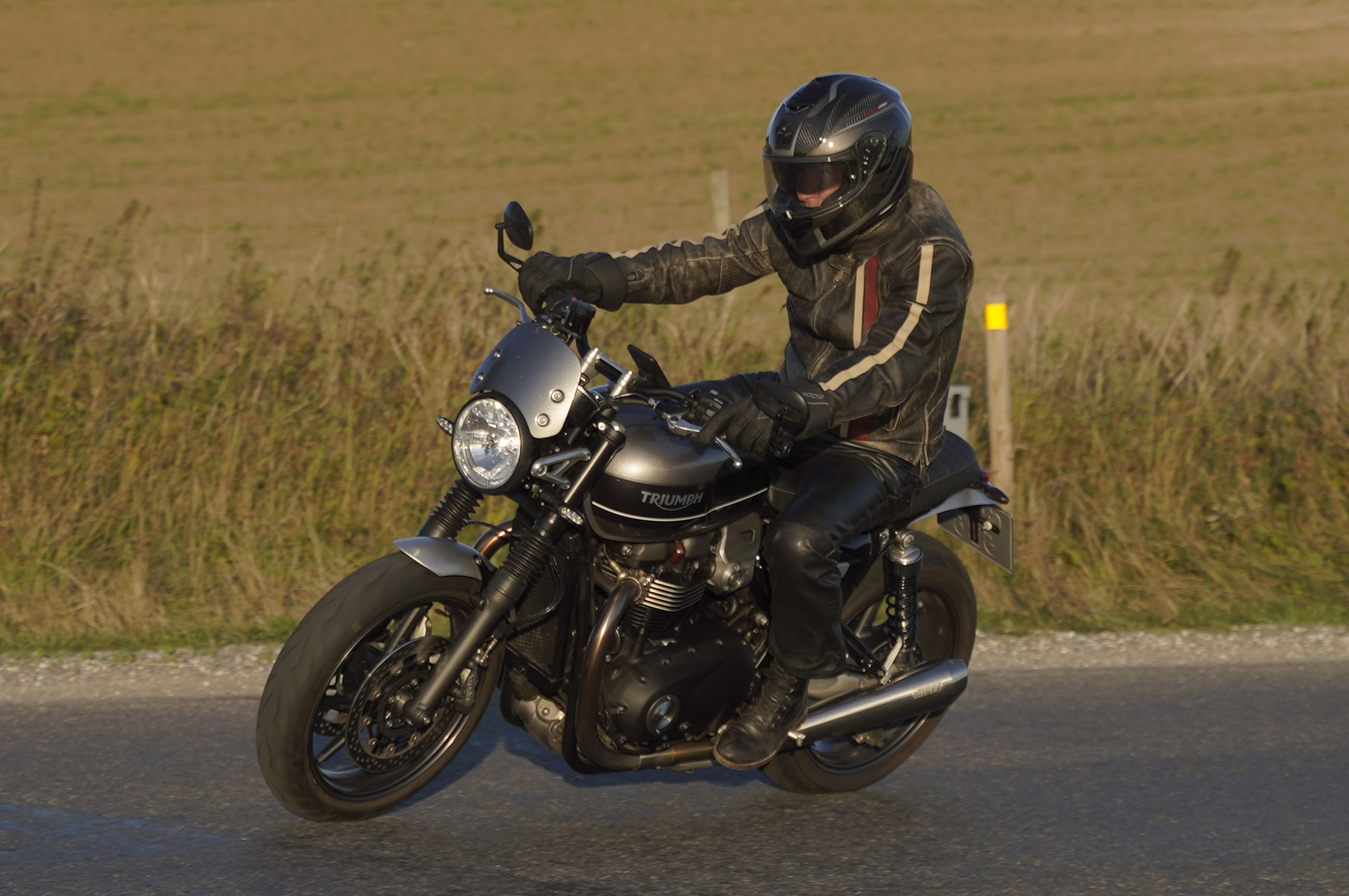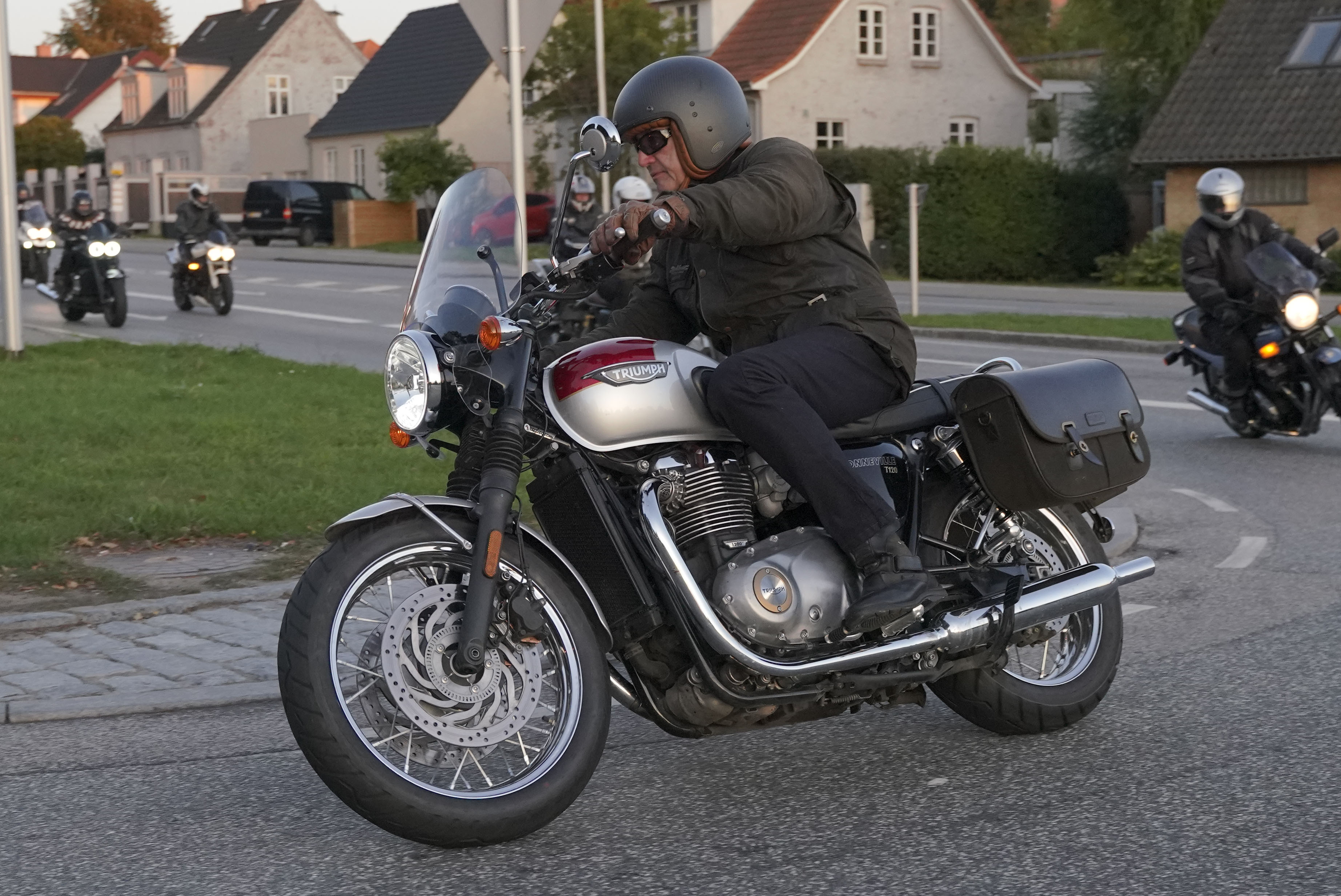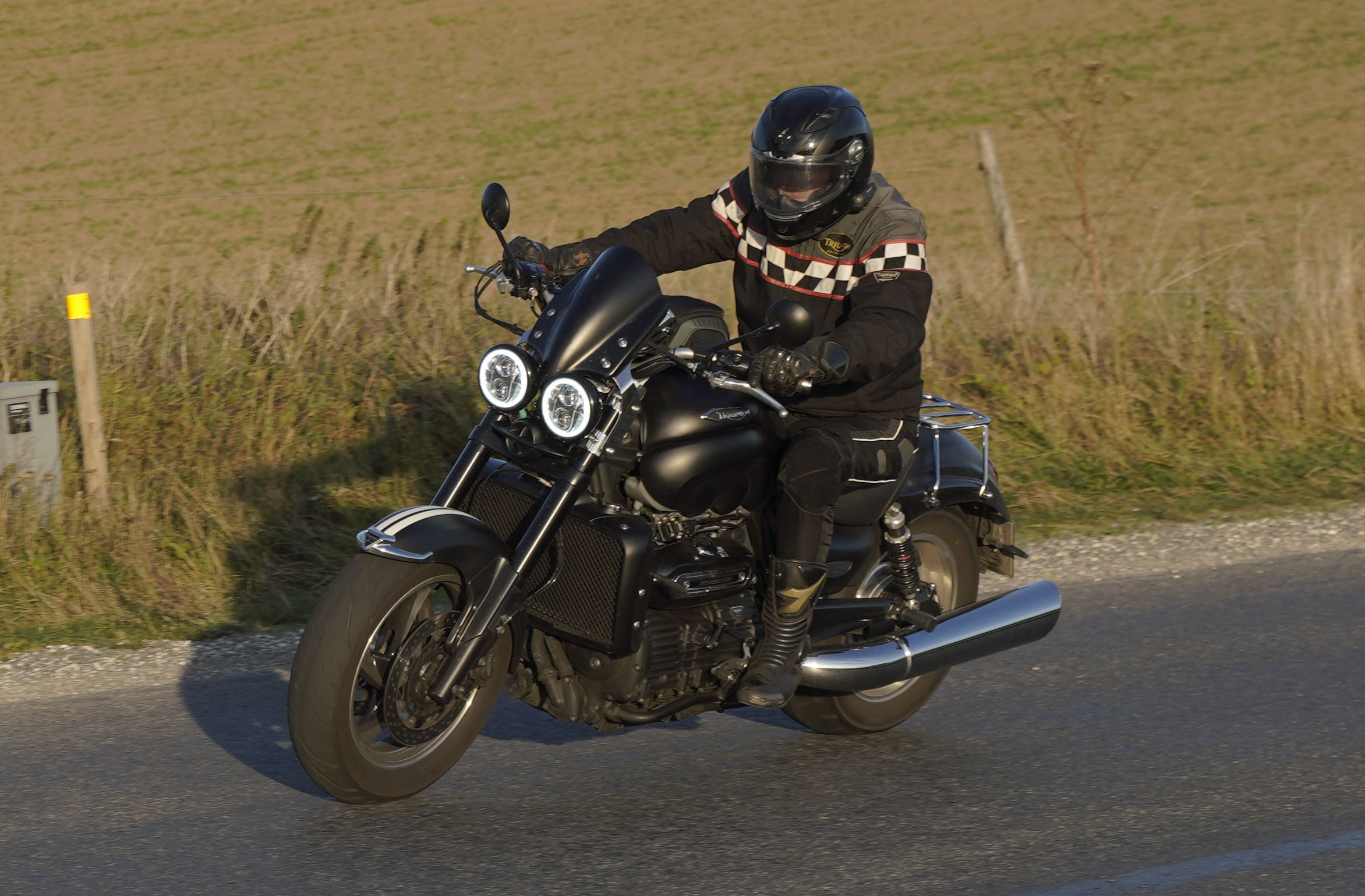 den lavt stående sol fra forkert retning. Alligevel kan du se Finns Bonneville mangler