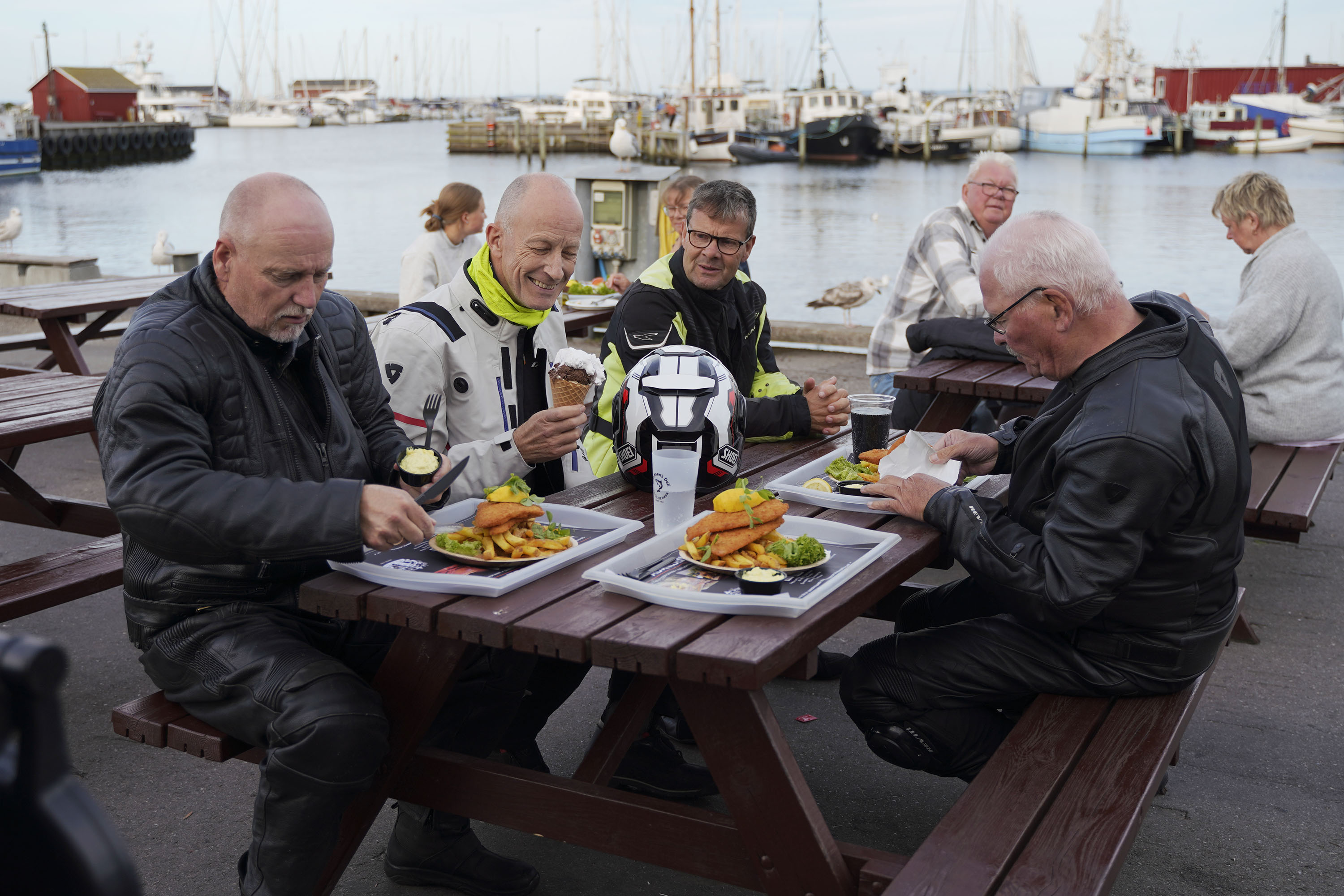 Så fulgte mange fine veje nordpå i retning Gilleleje. Vel framme så tog vi spisepause på havnen. Underligt, der var ingen køer ved grillen. Nå ja, resten af Danmark sat i sofaen ved TV'n og så fodbold. Fisken smagte godt, vejret var godt, havnen var skøn, og selskabet var fedt. Snak og hygge og noget at spise. Ikke så tosset.