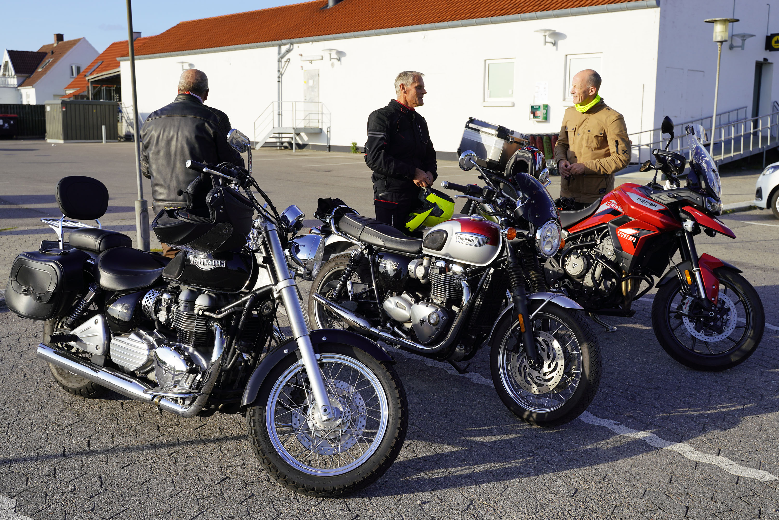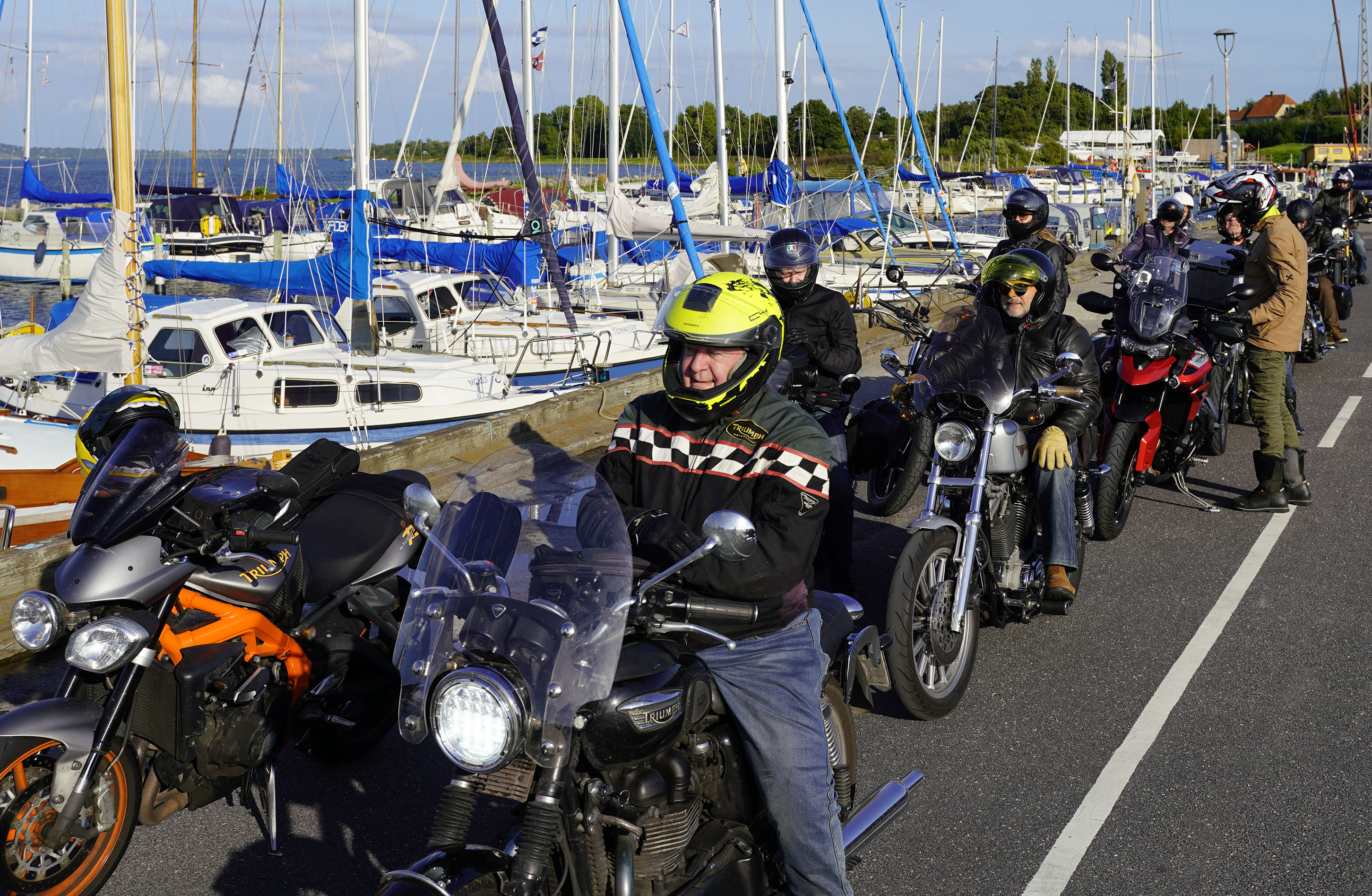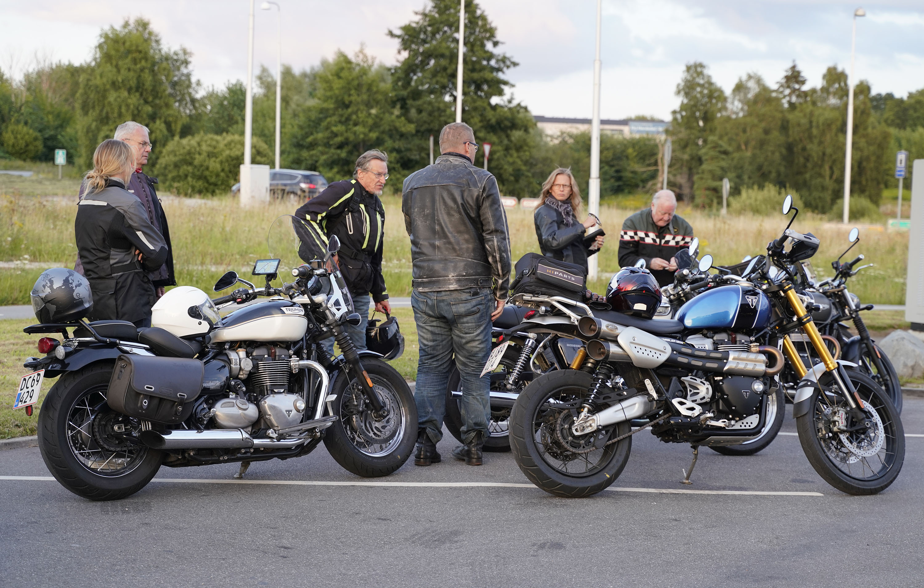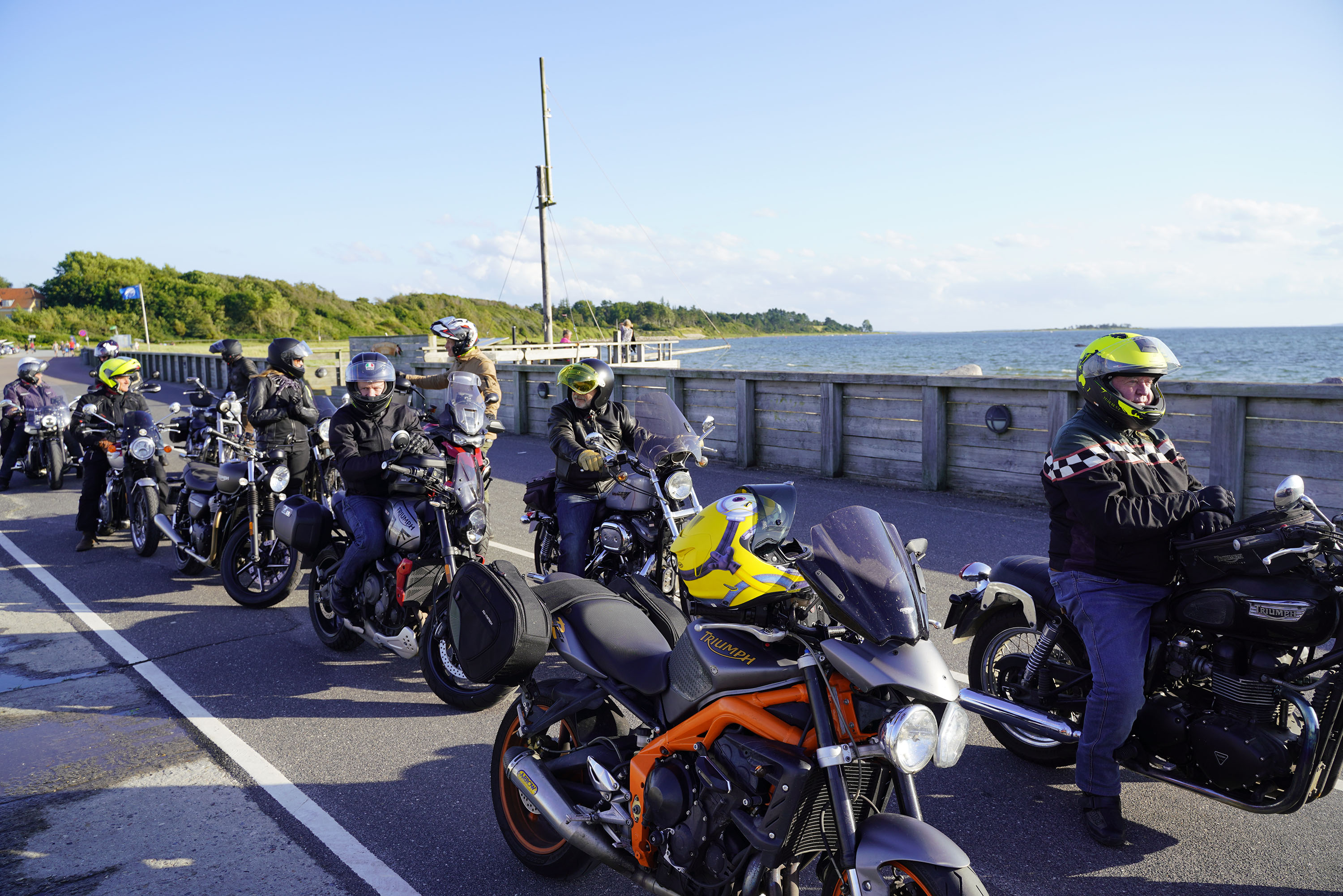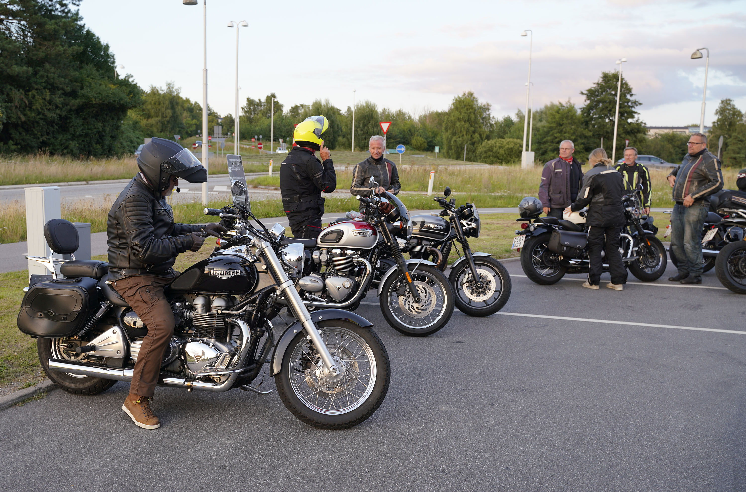 Jeg ankom til mødestedet på tanken, og der var flere der hade tænkt det samme. Der var Mogens på den sorte Bonneville -07, Tore på en sølv Trident 660 -21, Eva på en champagne/sort Street Twin -20, Niels Jørgen på en sort/hvis Bonneville T100 -05, Allan på en sort America -06, Torben på en sølv Harley Sprotster -99, Finn på en blå Scrambler 1200 -19, Per på en rød Tiger 900 -17, Julius på en rød/sølv Bonneville T120 -12, og mig selv på den grå/orange Street Triple KM-spec -08.Kl 17.30 startede vi turen og kørte gennem skoven til Værløse hvor vi drejede nord-vest mod Ganløse og Slagslunde.