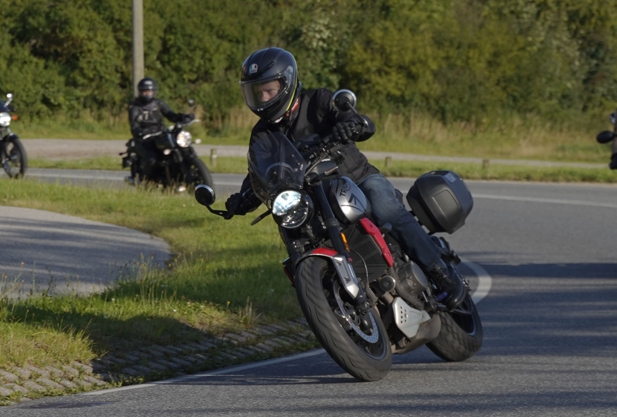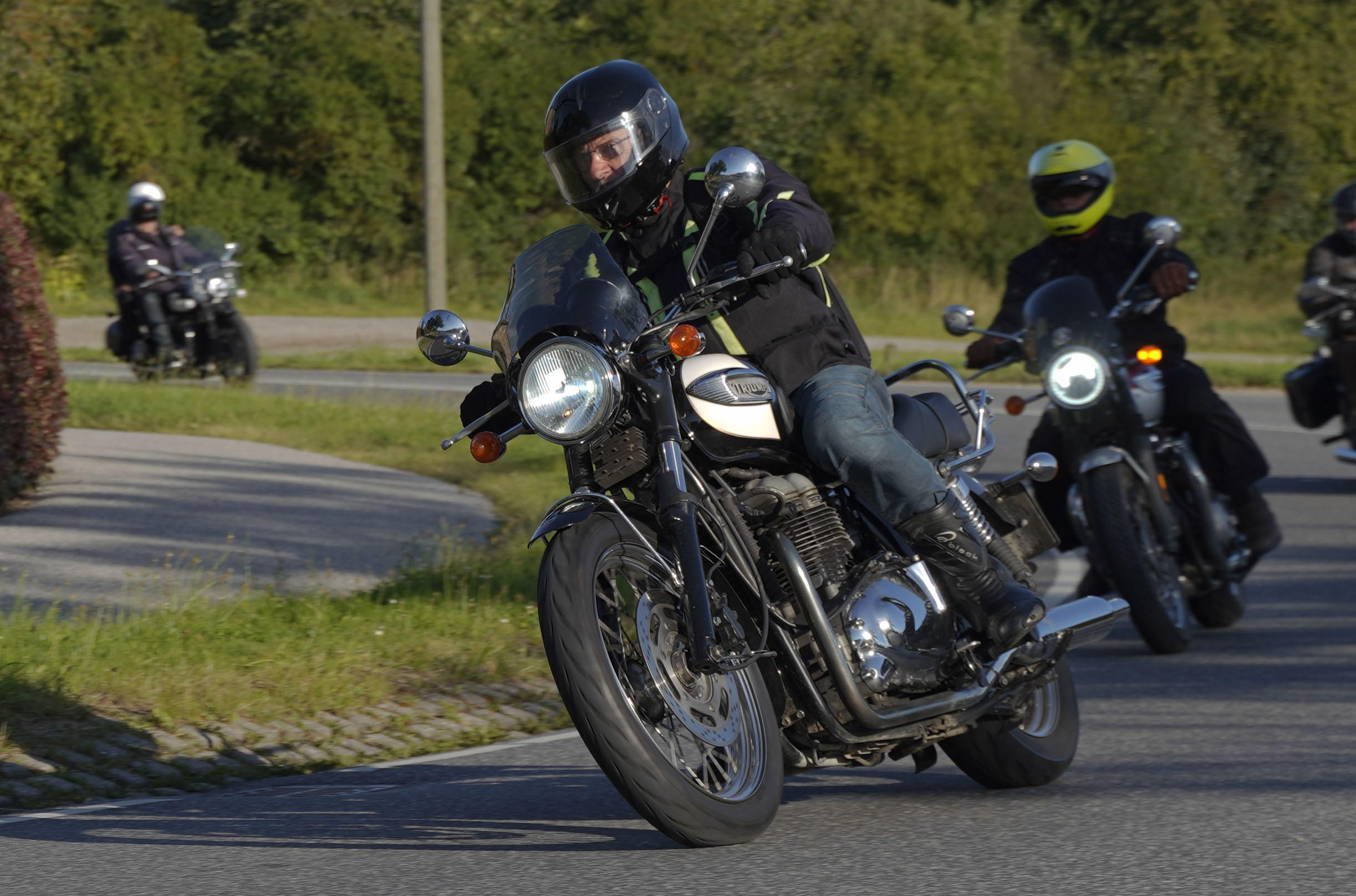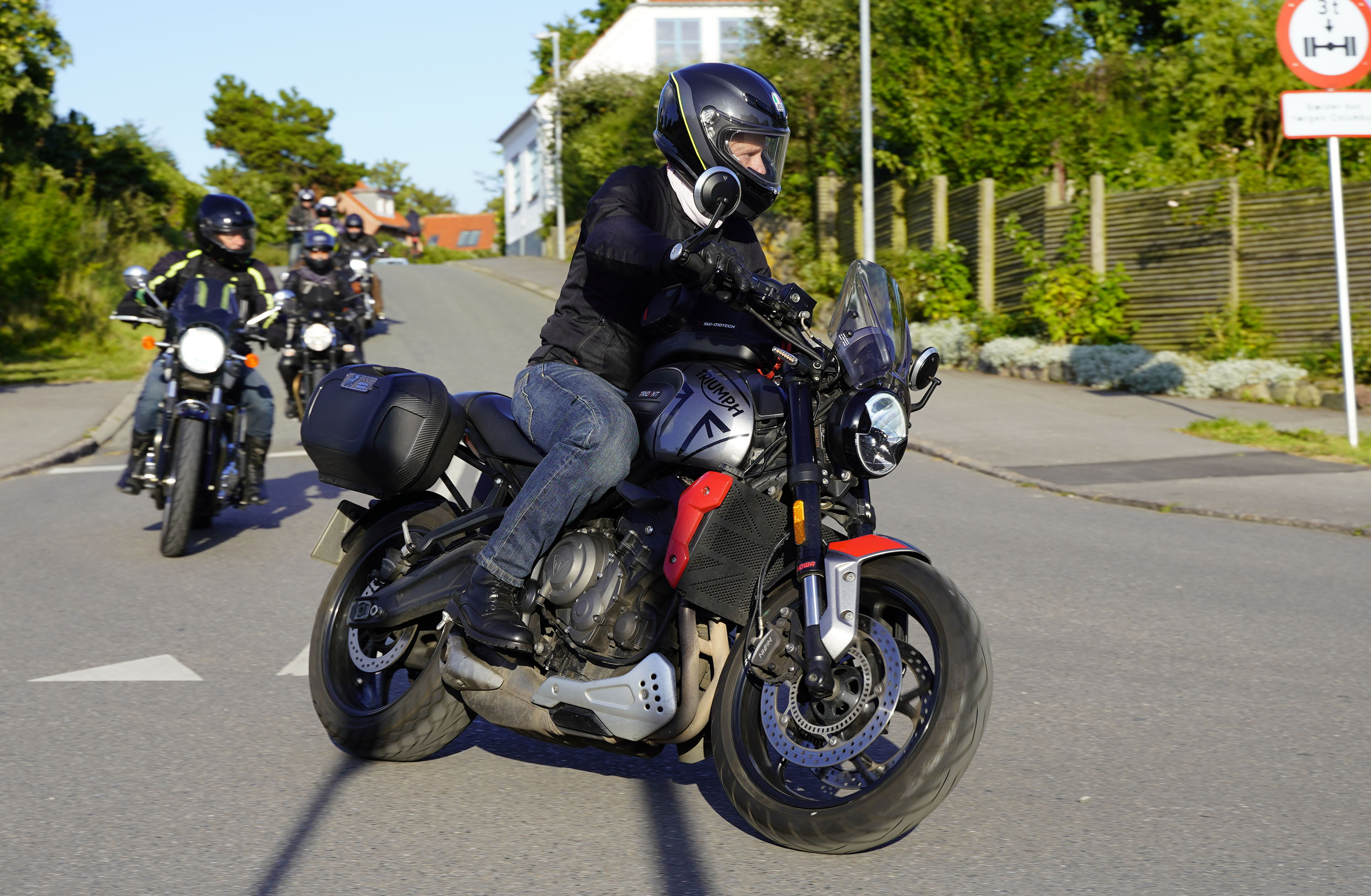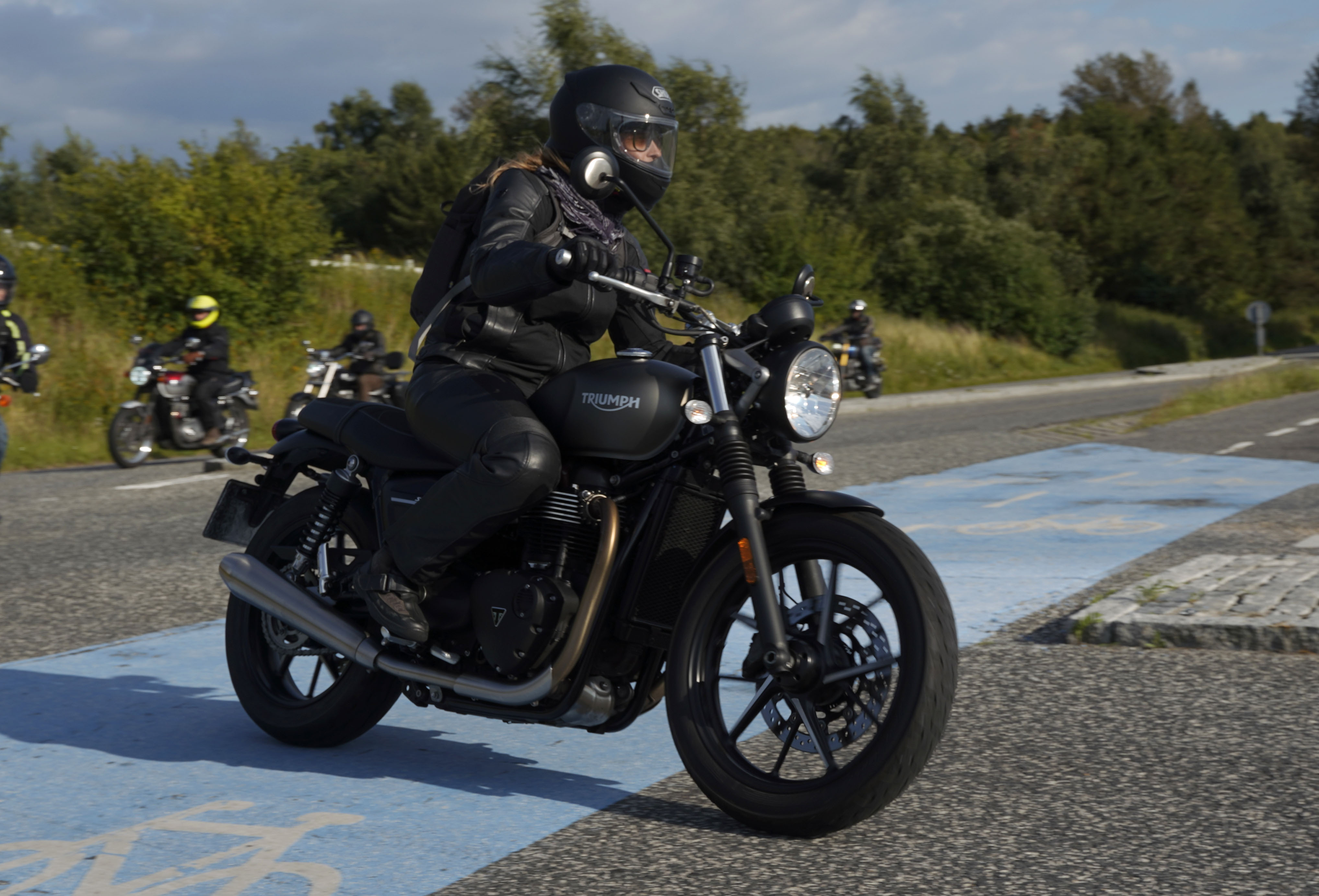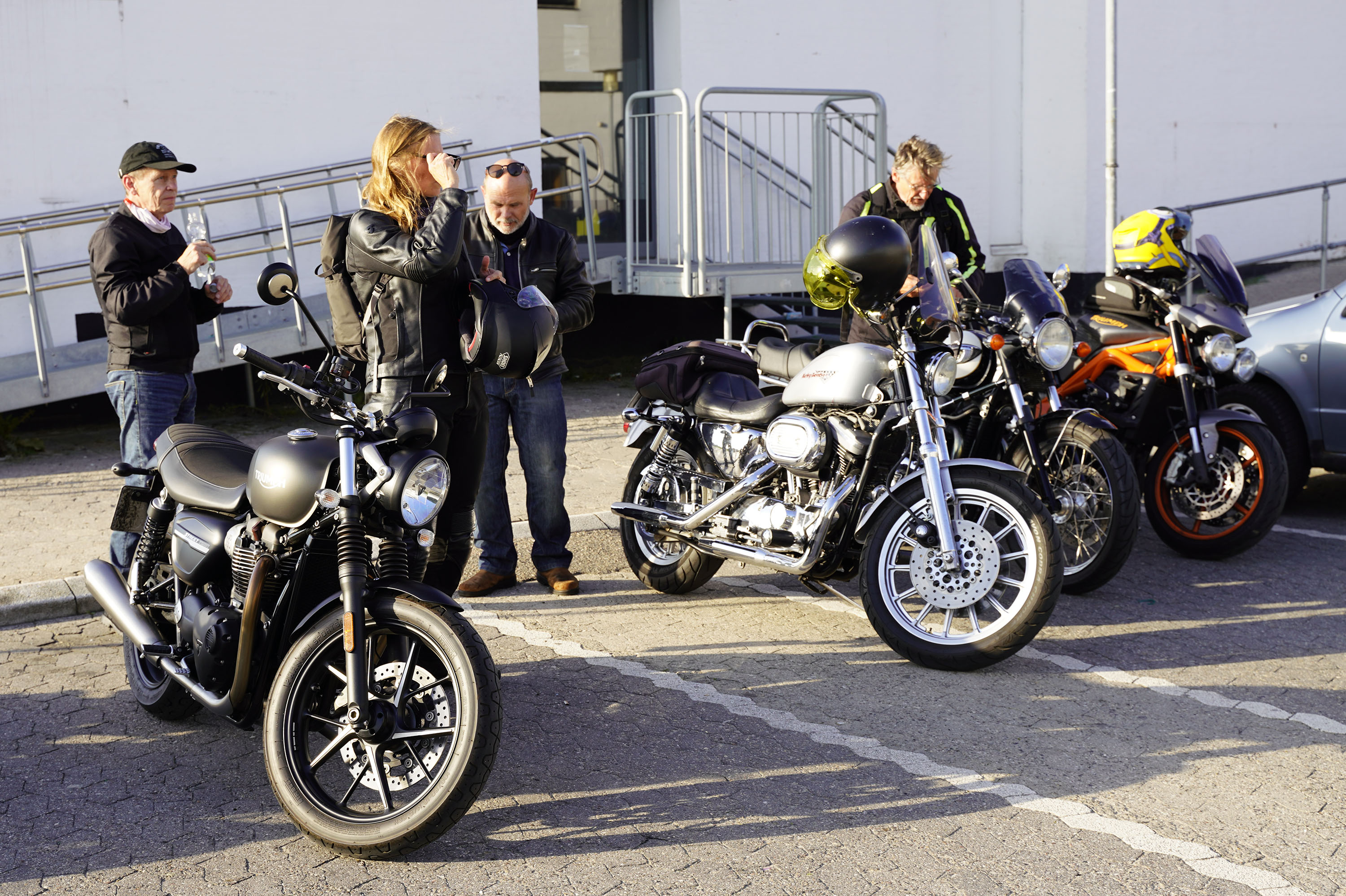 Jeg ankom til mødestedet på tanken, og der var flere der hade tænkt det samme. Der var Mogens på den sorte Bonneville -07, Tore på en sølv Trident 660 -21, Eva på en champagne/sort Street Twin -20, Niels Jørgen på en sort/hvis Bonneville T100 -05, Allan på en sort America -06, Torben på en sølv Harley Sprotster -99, Finn på en blå Scrambler 1200 -19, Per på en rød Tiger 900 -17, Julius på en rød/sølv Bonneville T120 -12, og mig selv på den grå/orange Street Triple KM-spec -08.Kl 17.30 startede vi turen og kørte gennem skoven til Værløse hvor vi drejede nord-vest mod Ganløse og Slagslunde.
