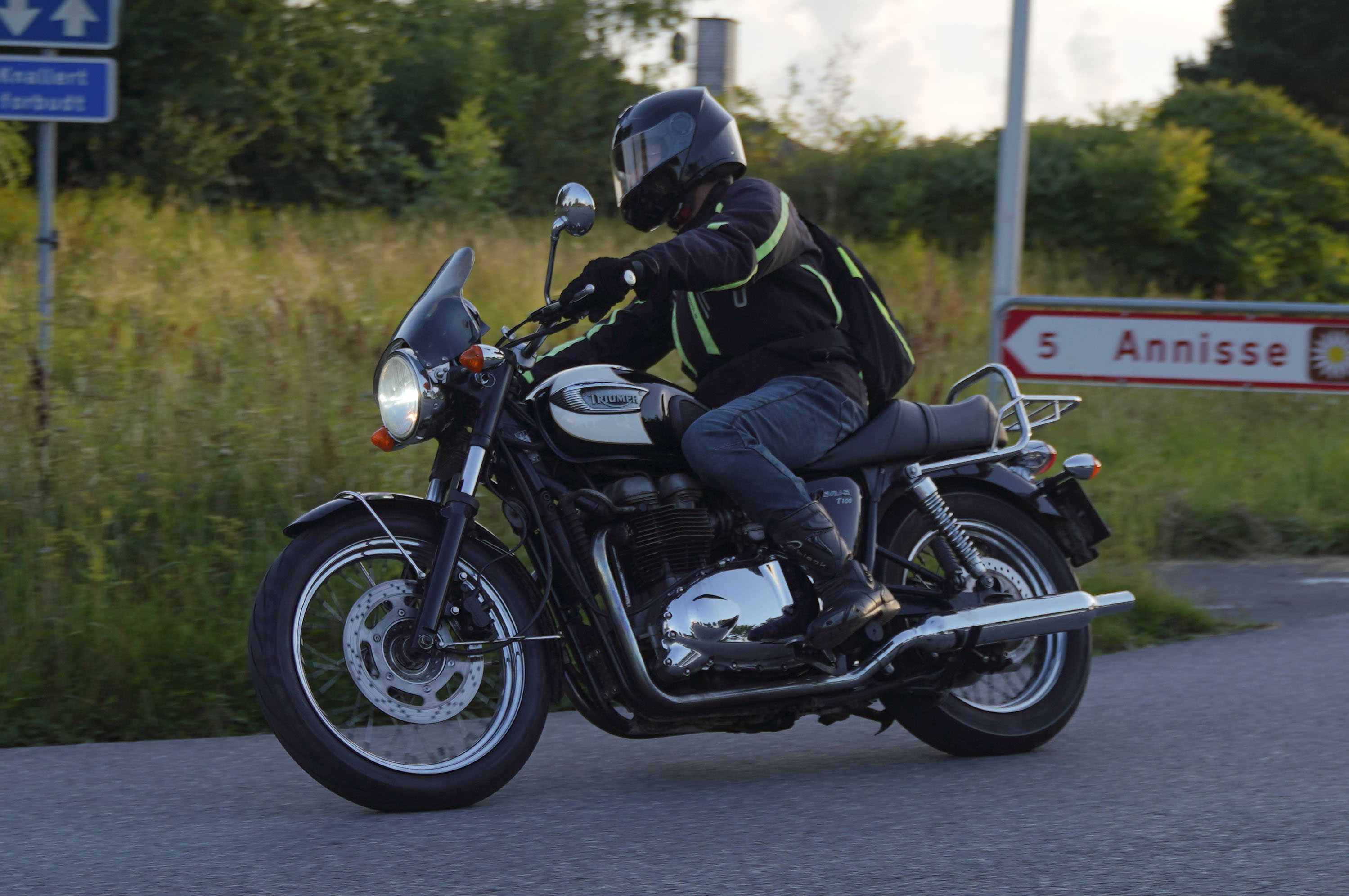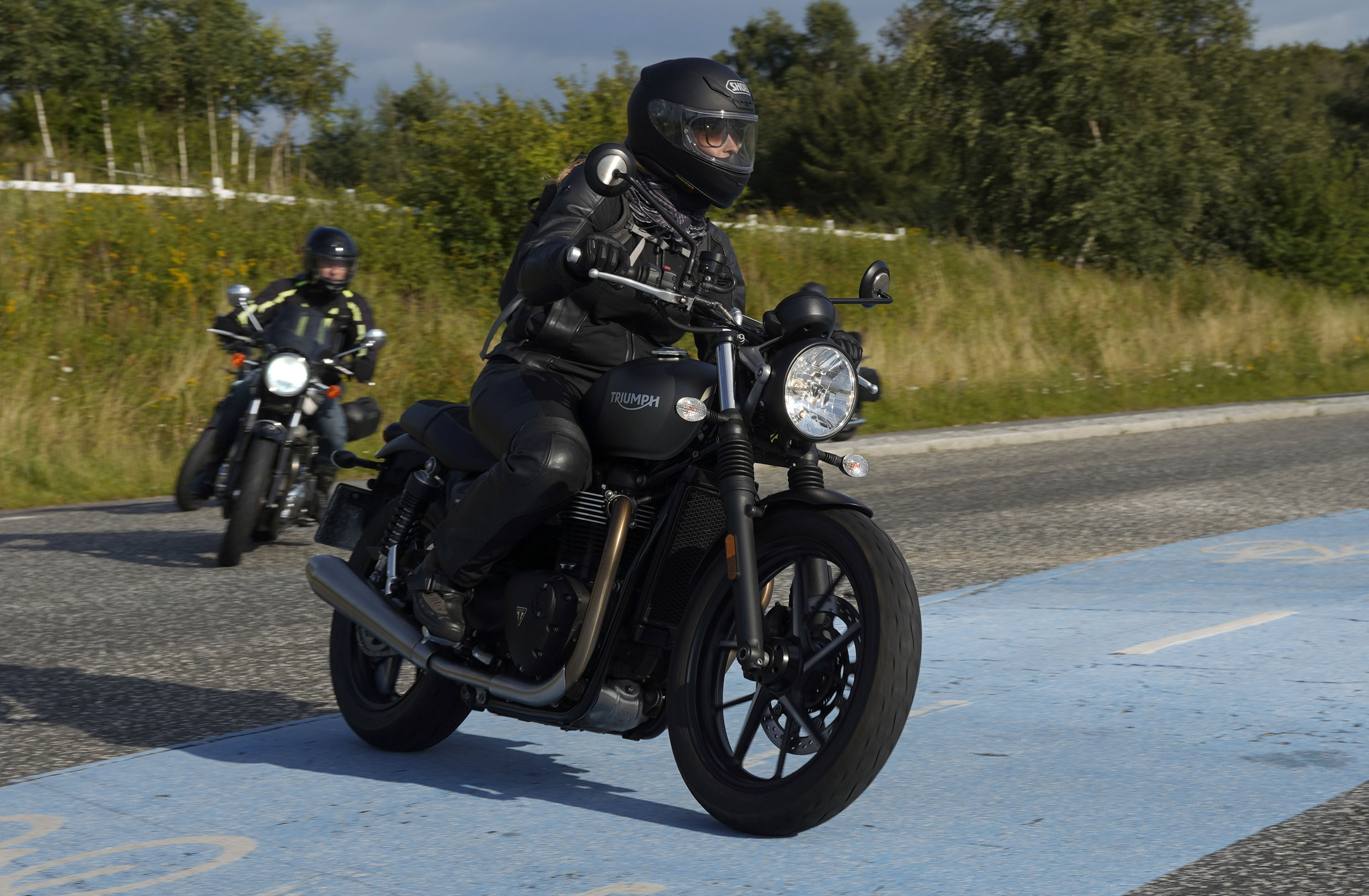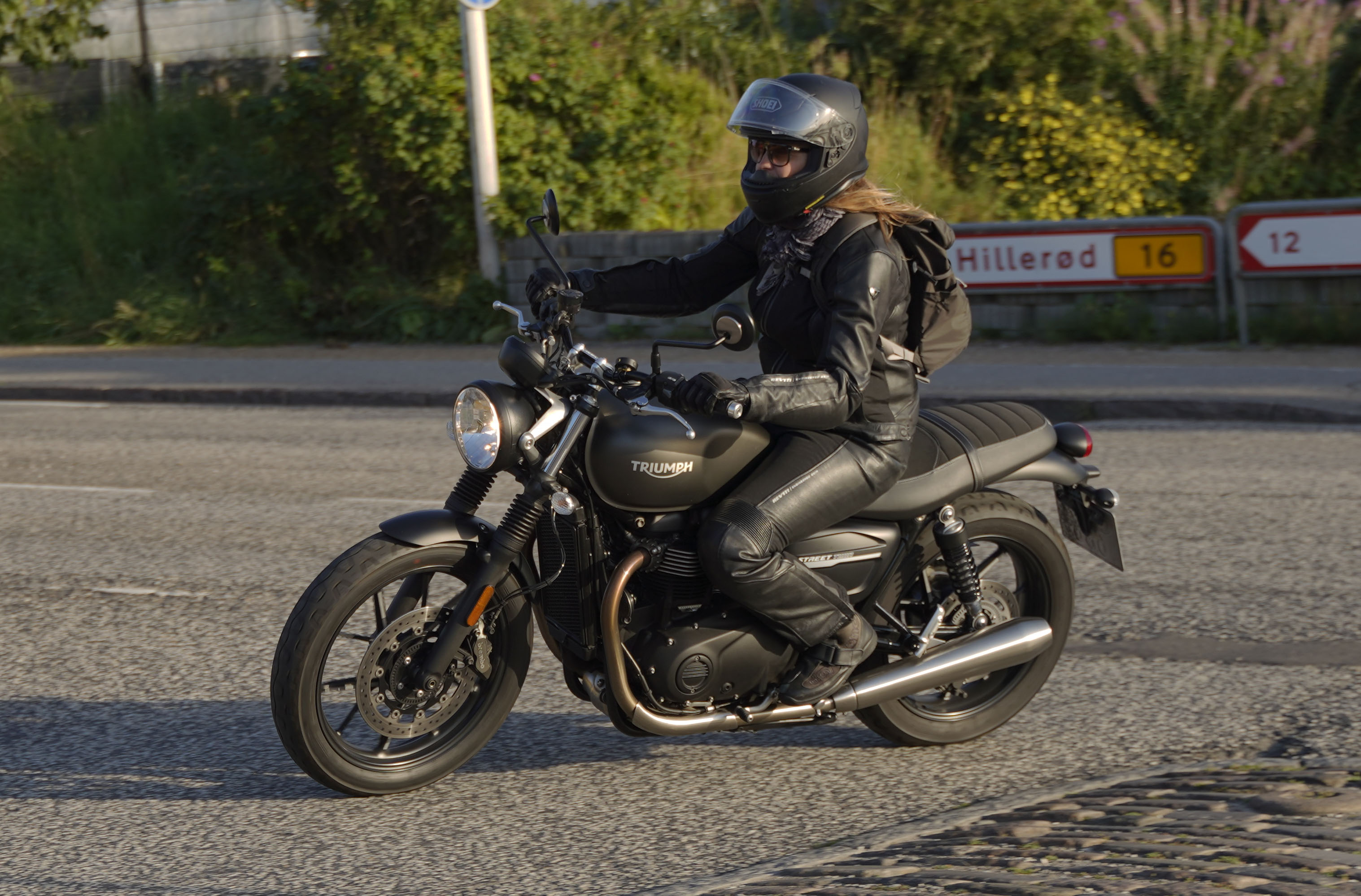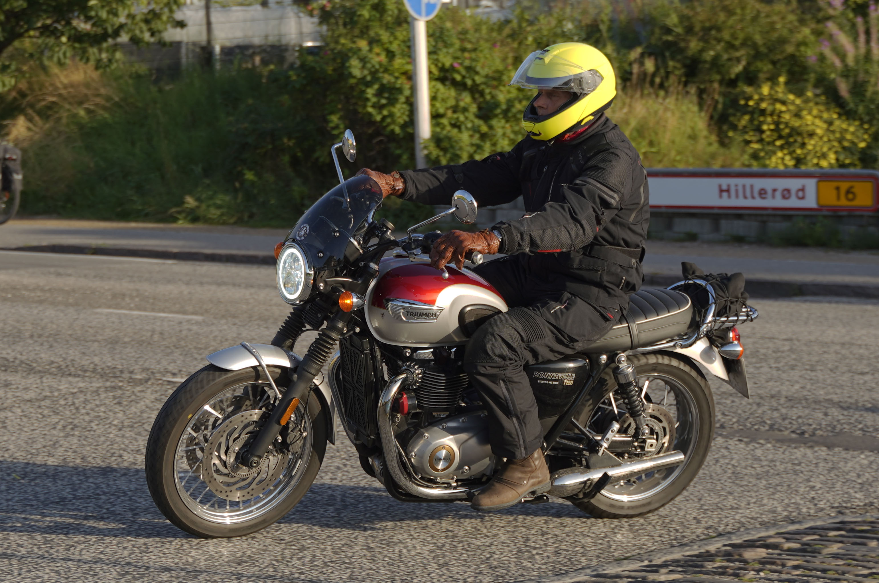 Jeg ankom til mødestedet på tanken, og der var flere der hade tænkt det samme. Der var Mogens på den sorte Bonneville -07, Tore på en sølv Trident 660 -21, Eva på en champagne/sort Street Twin -20, Niels Jørgen på en sort/hvis Bonneville T100 -05, Allan på en sort America -06, Torben på en sølv Harley Sprotster -99, Finn på en blå Scrambler 1200 -19, Per på en rød Tiger 900 -17, Julius på en rød/sølv Bonneville T120 -12, og mig selv på den grå/orange Street Triple KM-spec -08.Kl 17.30 startede vi turen og kørte gennem skoven til Værløse hvor vi drejede nord-vest mod Ganløse og Slagslunde.