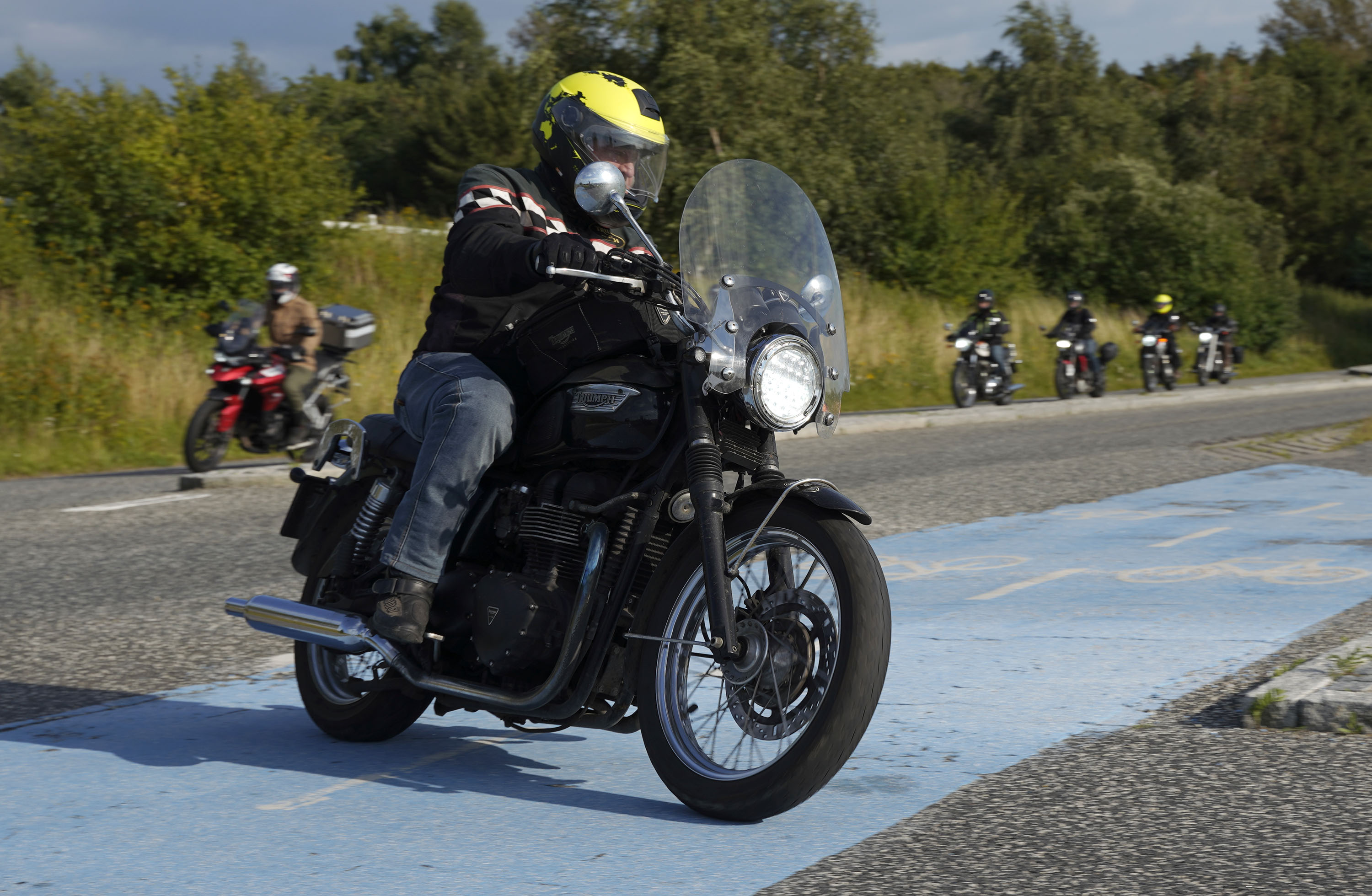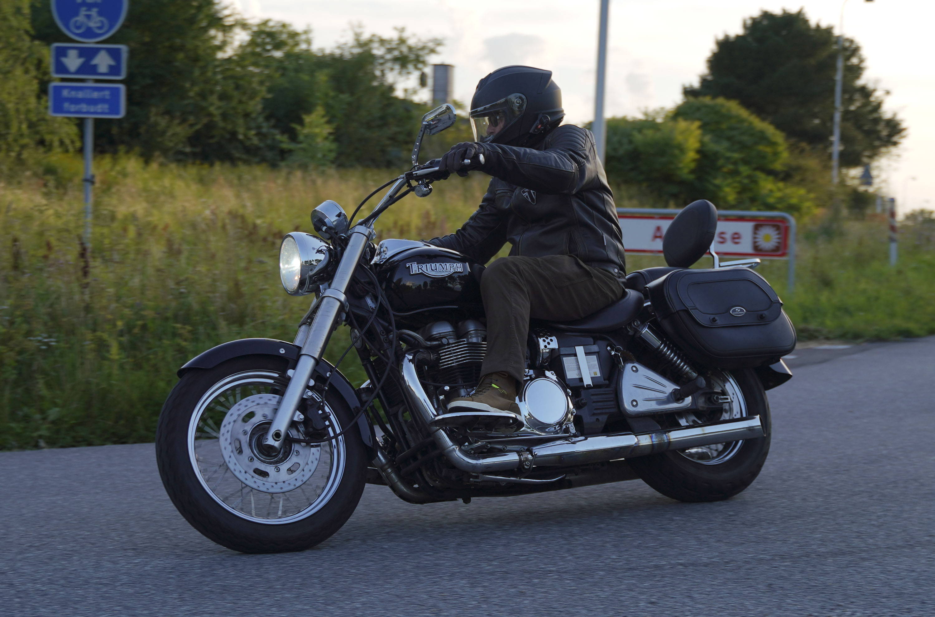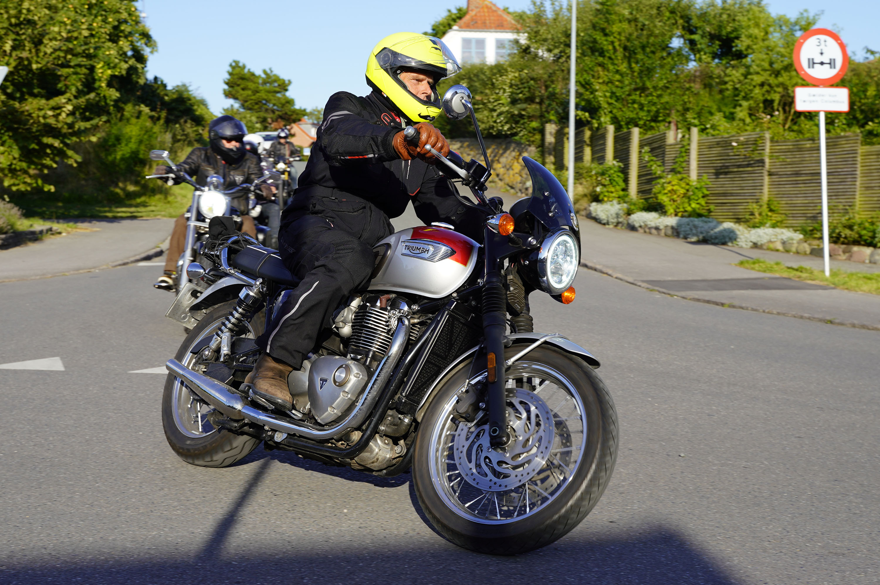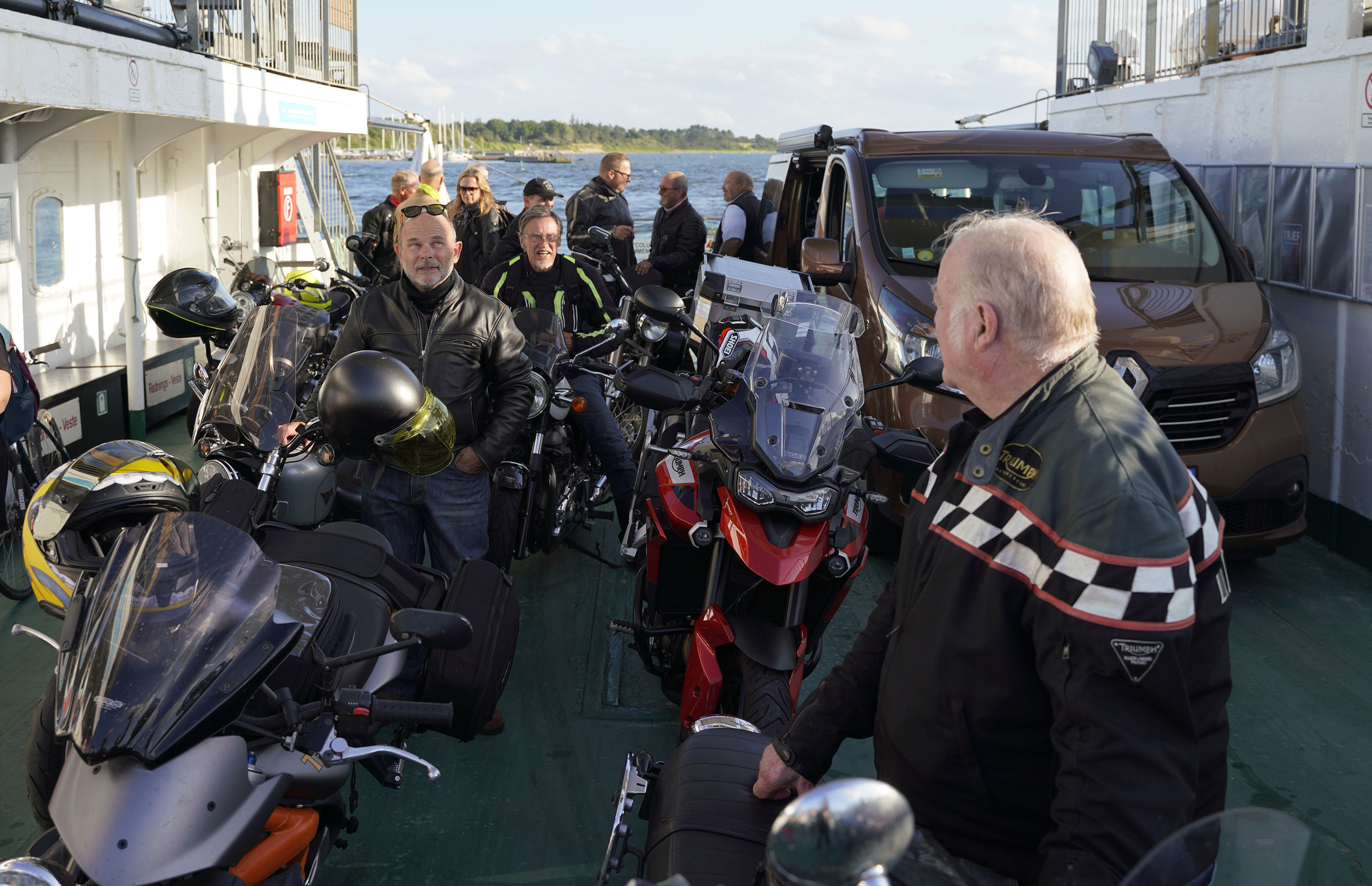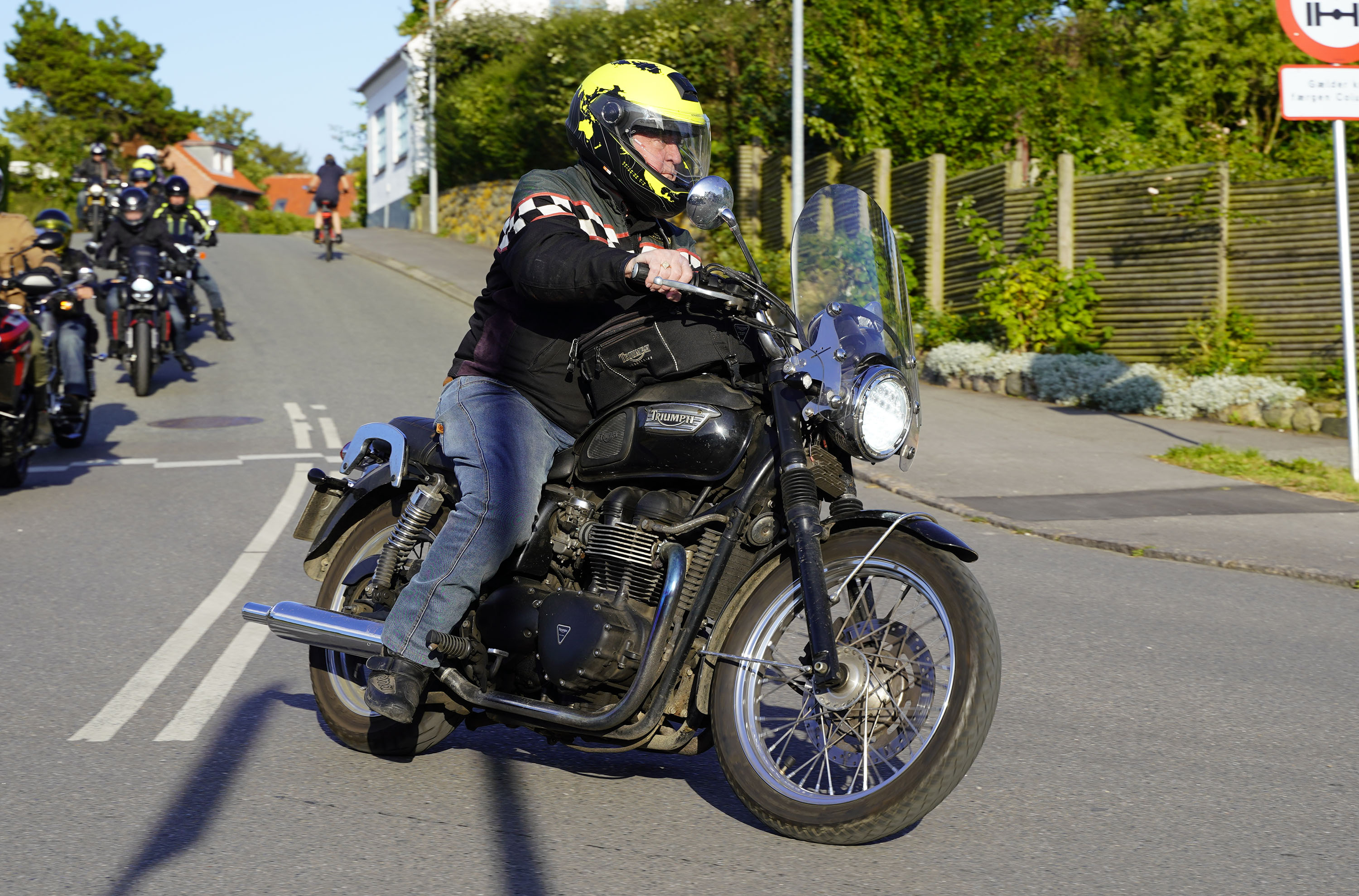 Jeg ankom til mødestedet på tanken, og der var flere der hade tænkt det samme. Der var Mogens på den sorte Bonneville -07, Tore på en sølv Trident 660 -21, Eva på en champagne/sort Street Twin -20, Niels Jørgen på en sort/hvis Bonneville T100 -05, Allan på en sort America -06, Torben på en sølv Harley Sprotster -99, Finn på en blå Scrambler 1200 -19, Per på en rød Tiger 900 -17, Julius på en rød/sølv Bonneville T120 -12, og mig selv på den grå/orange Street Triple KM-spec -08.Kl 17.30 startede vi turen og kørte gennem skoven til Værløse hvor vi drejede nord-vest mod Ganløse og Slagslunde.