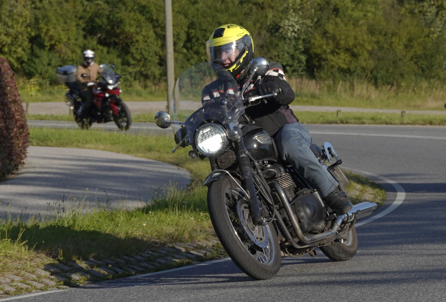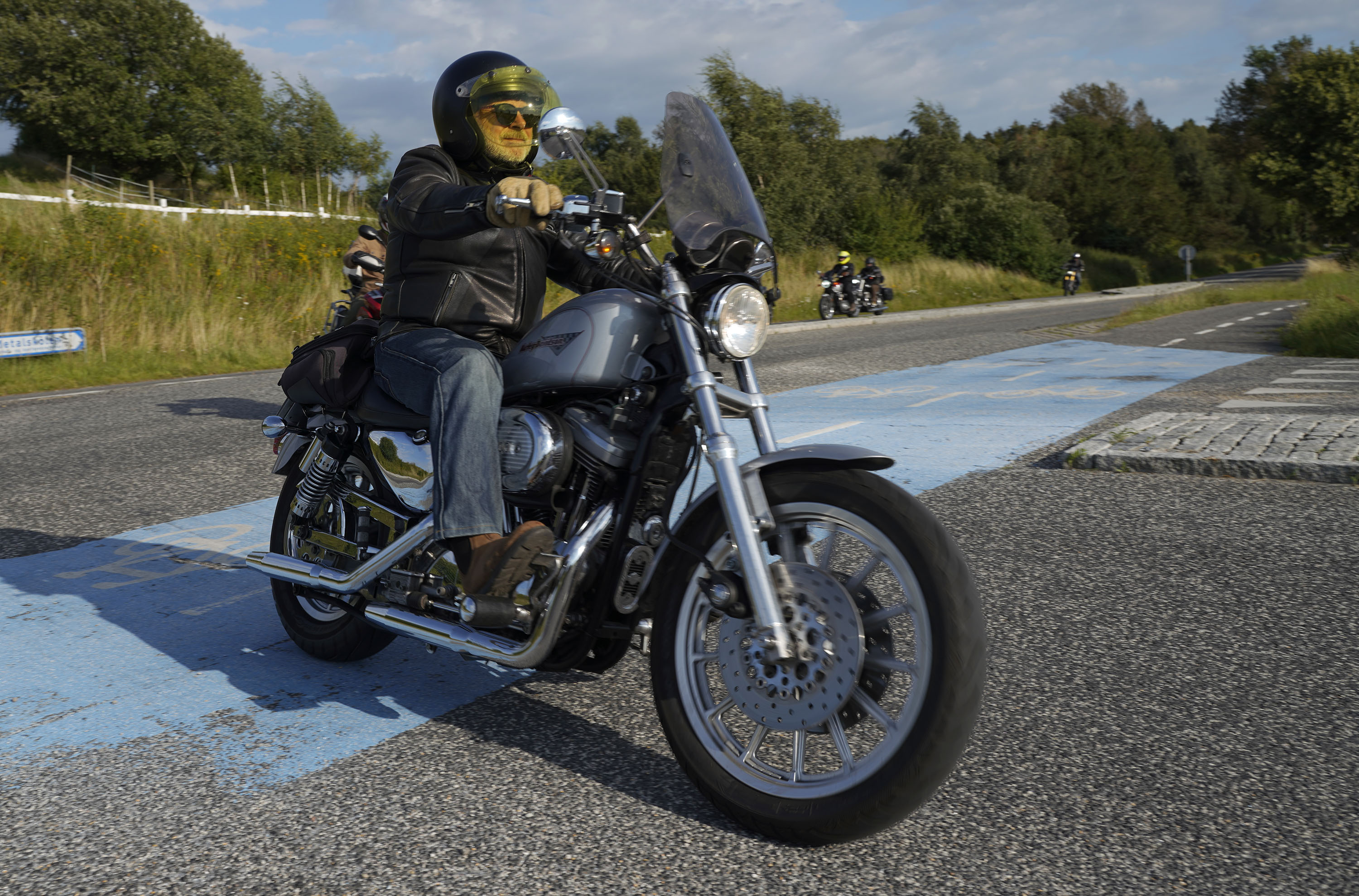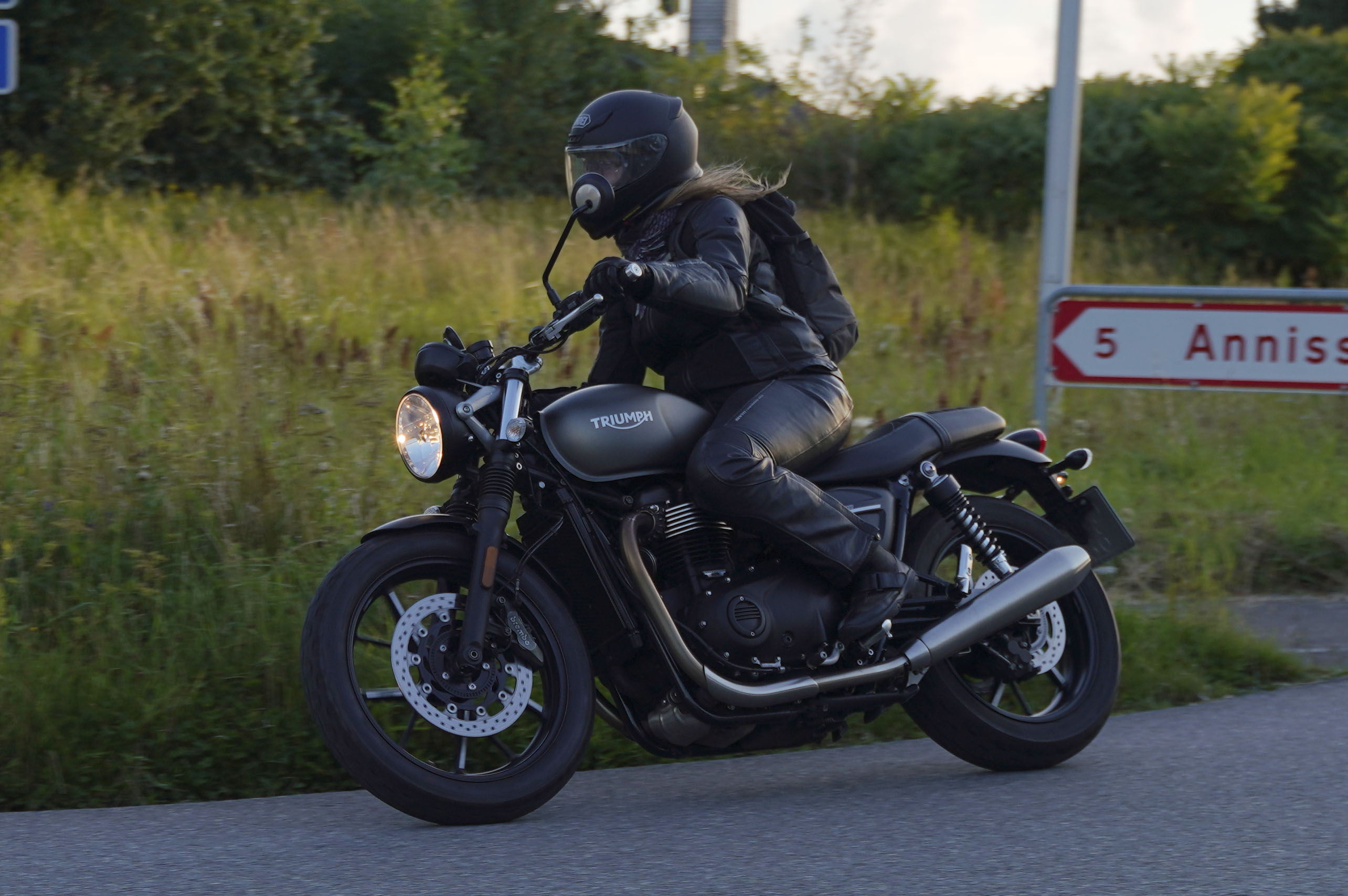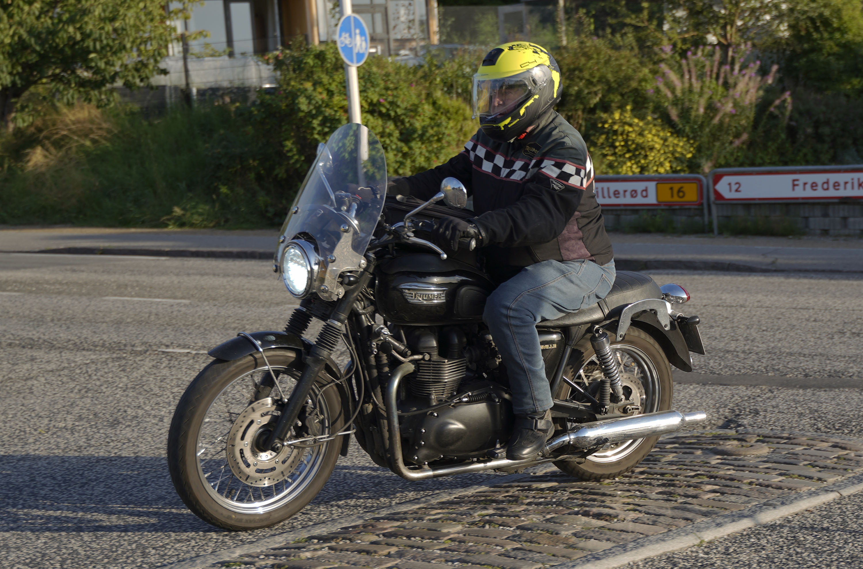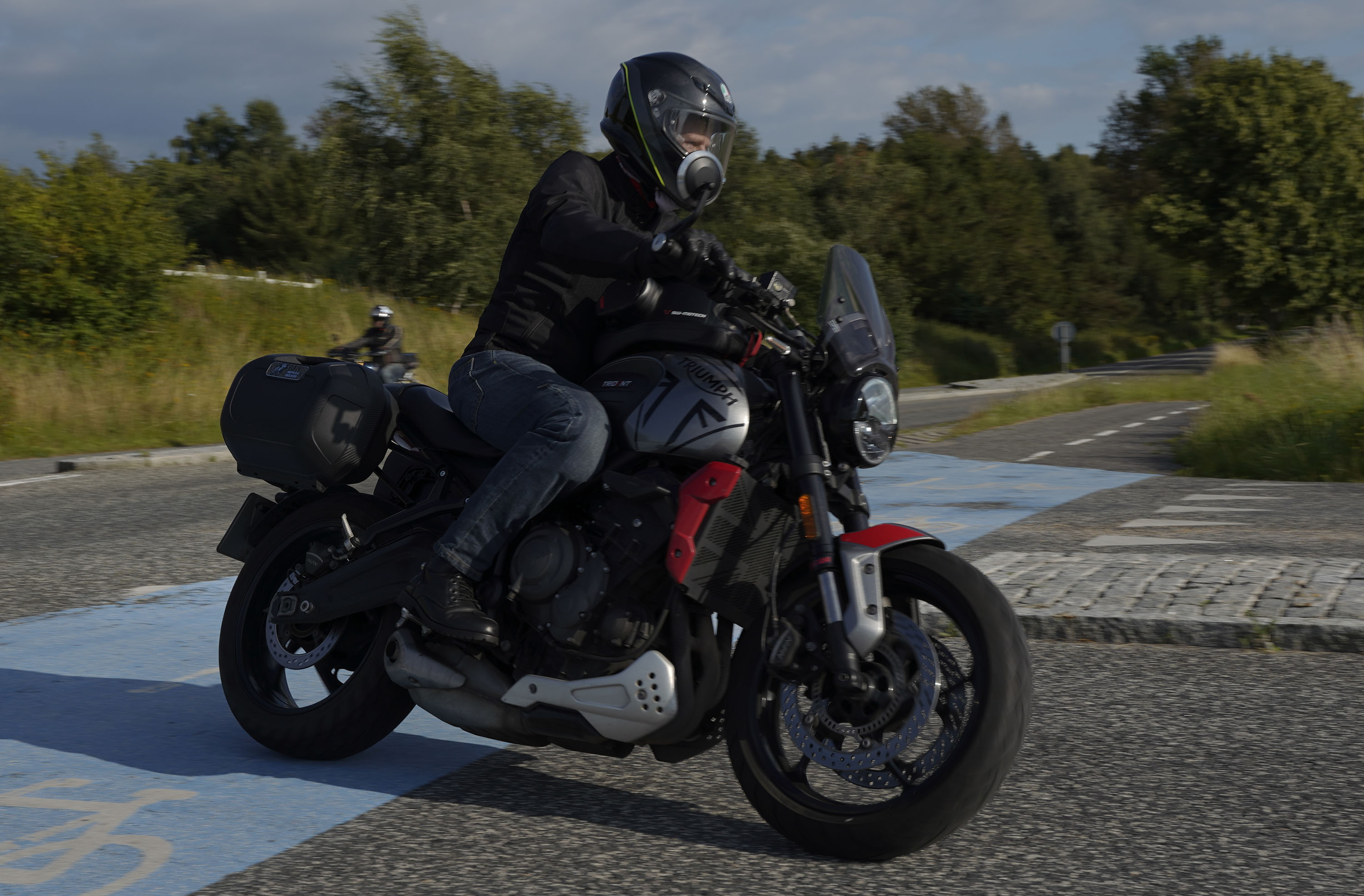 Jeg ankom til mødestedet på tanken, og der var flere der hade tænkt det samme. Der var Mogens på den sorte Bonneville -07, Tore på en sølv Trident 660 -21, Eva på en champagne/sort Street Twin -20, Niels Jørgen på en sort/hvis Bonneville T100 -05, Allan på en sort America -06, Torben på en sølv Harley Sprotster -99, Finn på en blå Scrambler 1200 -19, Per på en rød Tiger 900 -17, Julius på en rød/sølv Bonneville T120 -12, og mig selv på den grå/orange Street Triple KM-spec -08.Kl 17.30 startede vi turen og kørte gennem skoven til Værløse hvor vi drejede nord-vest mod Ganløse og Slagslunde.