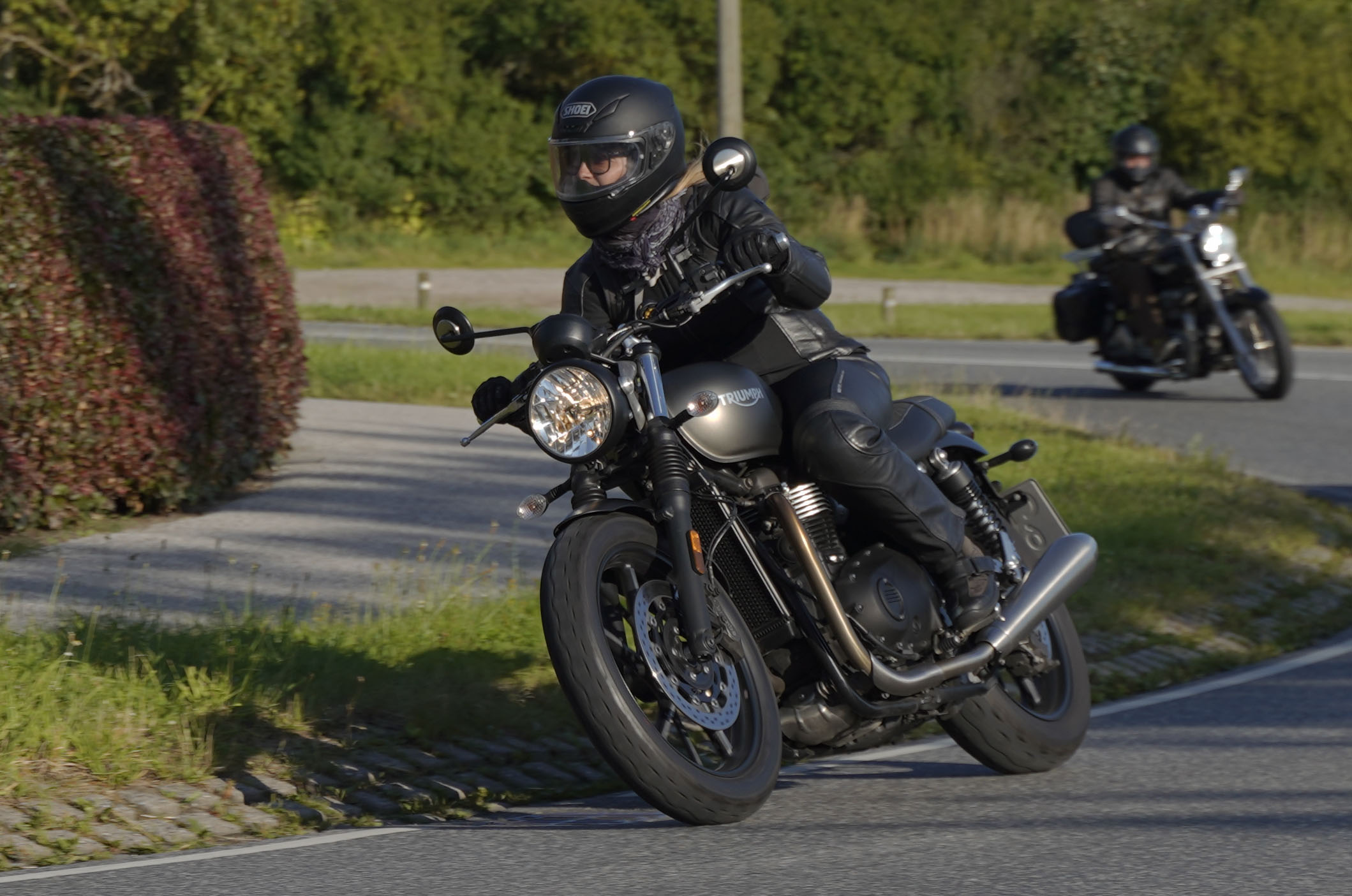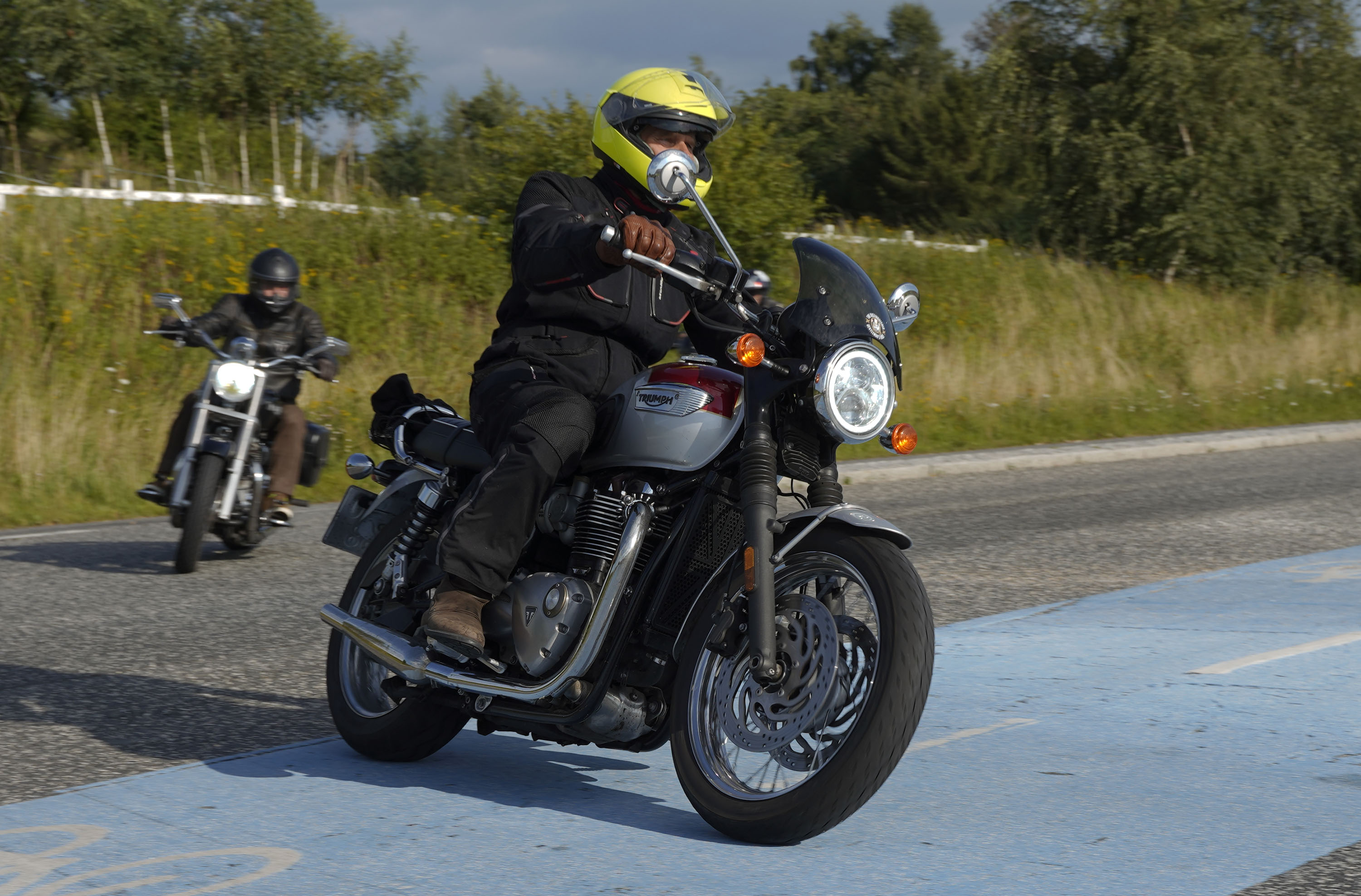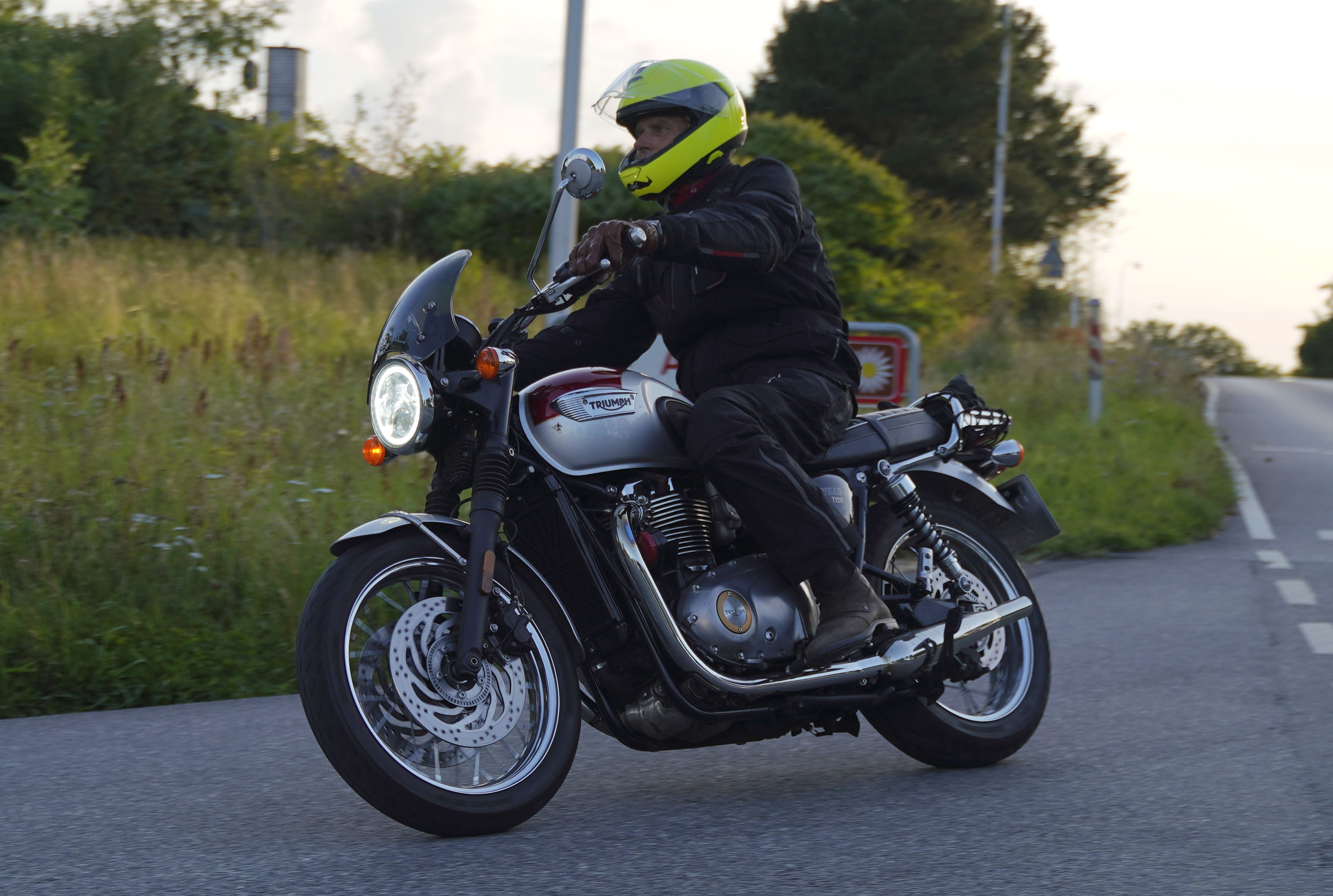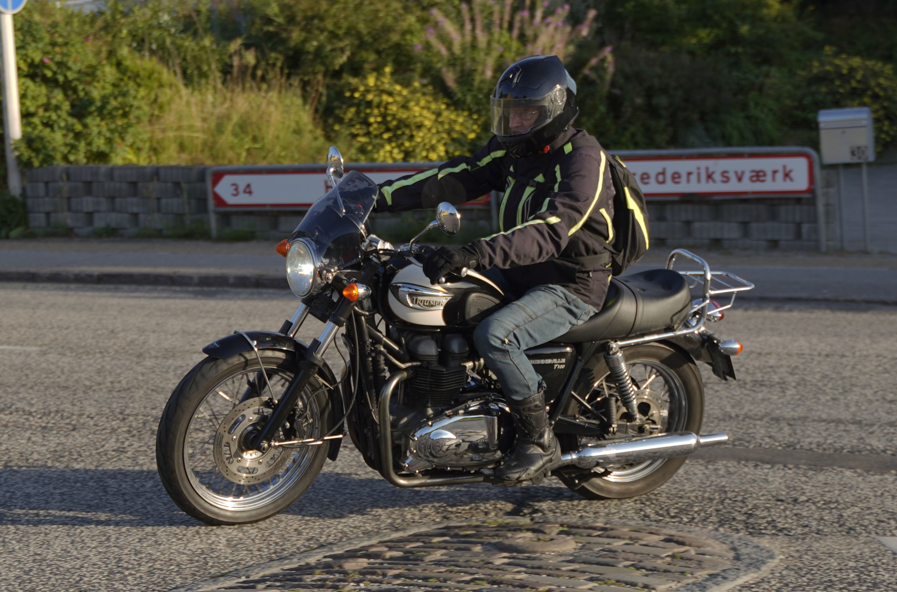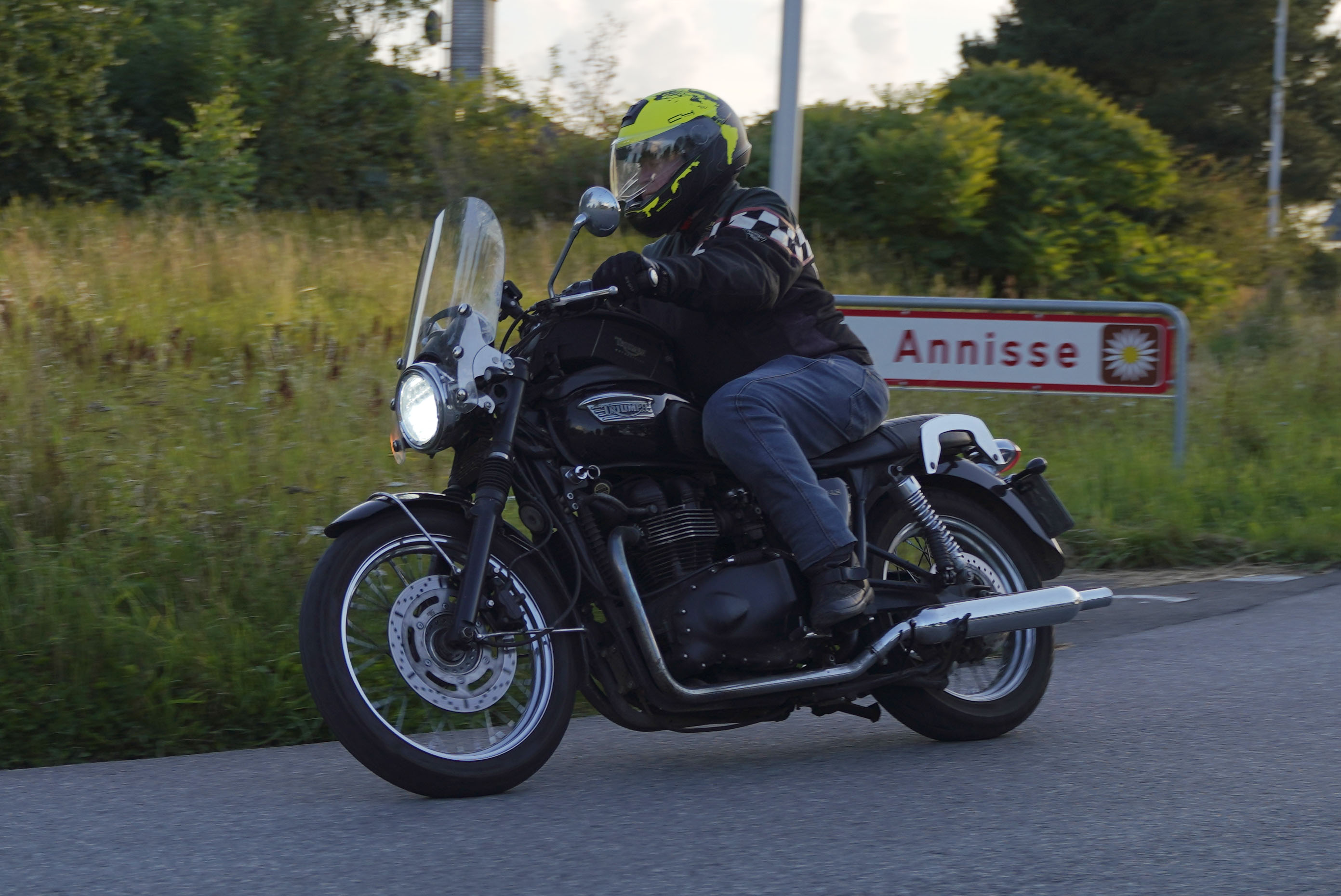 Jeg ankom til mødestedet på tanken, og der var flere der hade tænkt det samme. Der var Mogens på den sorte Bonneville -07, Tore på en sølv Trident 660 -21, Eva på en champagne/sort Street Twin -20, Niels Jørgen på en sort/hvis Bonneville T100 -05, Allan på en sort America -06, Torben på en sølv Harley Sprotster -99, Finn på en blå Scrambler 1200 -19, Per på en rød Tiger 900 -17, Julius på en rød/sølv Bonneville T120 -12, og mig selv på den grå/orange Street Triple KM-spec -08.Kl 17.30 startede vi turen og kørte gennem skoven til Værløse hvor vi drejede nord-vest mod Ganløse og Slagslunde.
