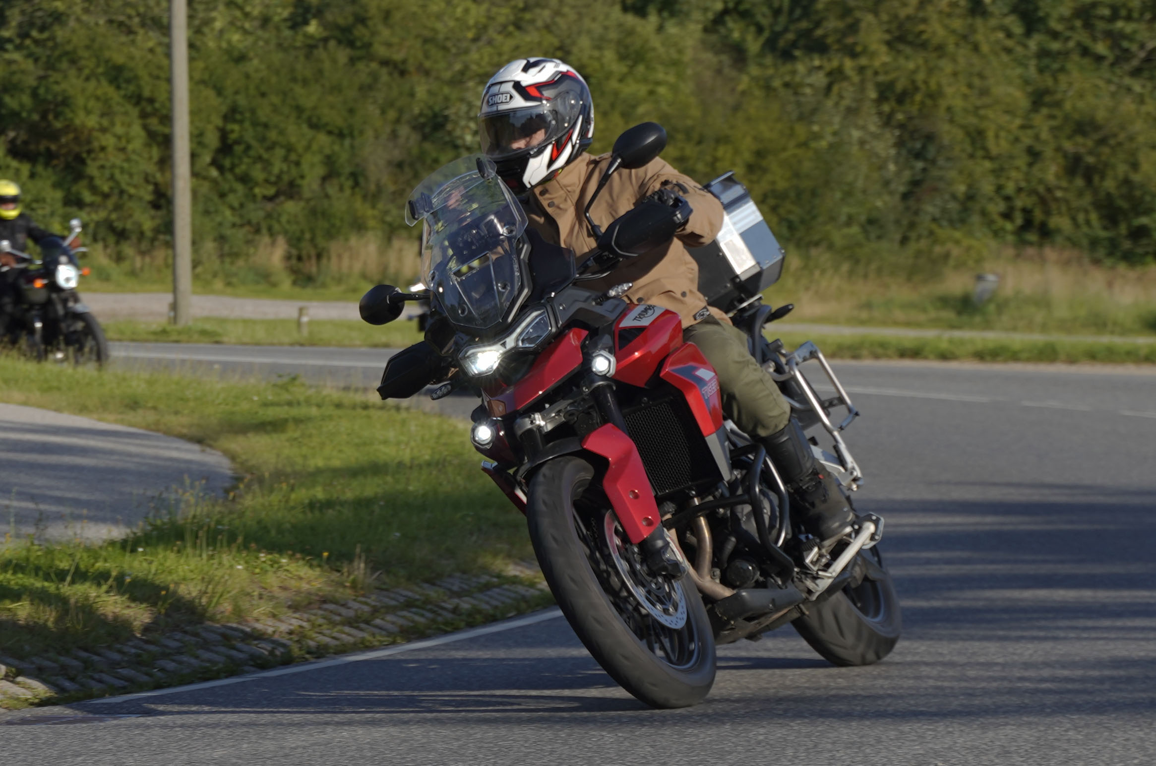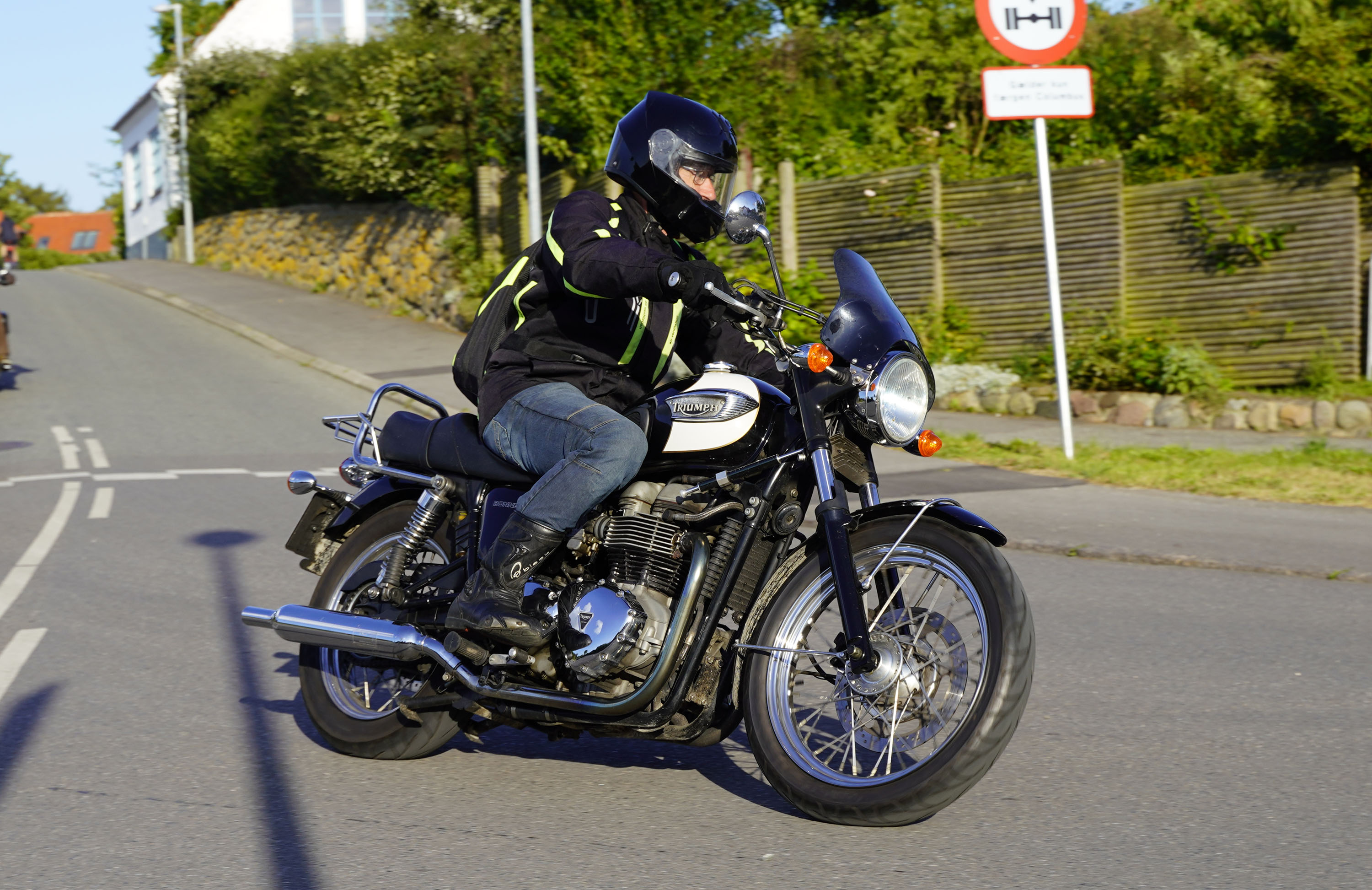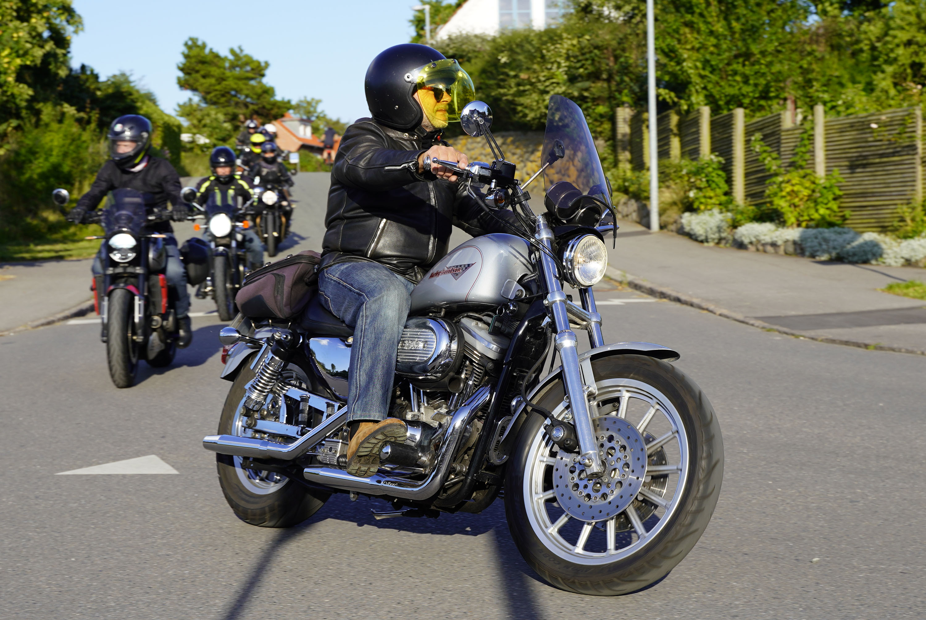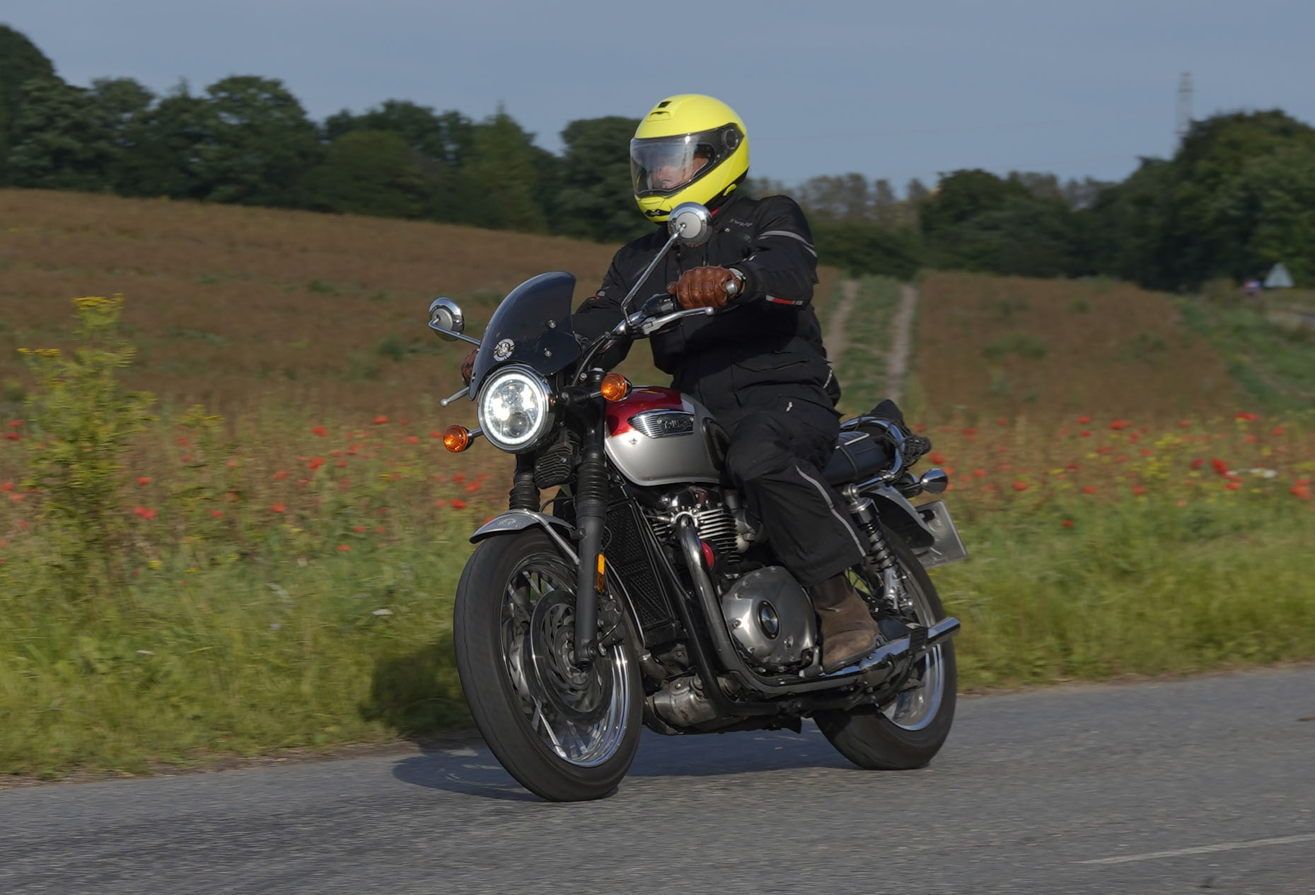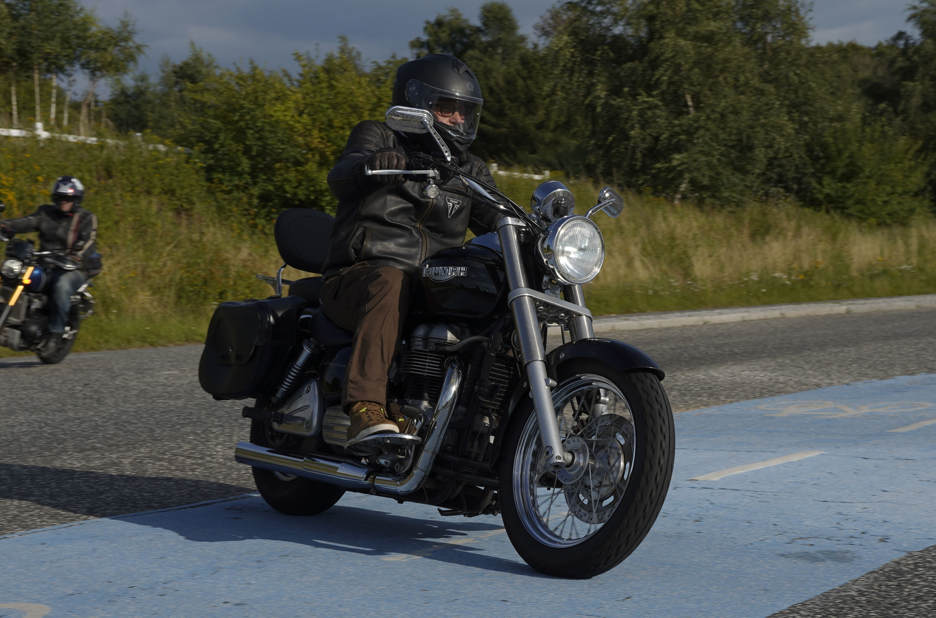 Jeg ankom til mødestedet på tanken, og der var flere der hade tænkt det samme. Der var Mogens på den sorte Bonneville -07, Tore på en sølv Trident 660 -21, Eva på en champagne/sort Street Twin -20, Niels Jørgen på en sort/hvis Bonneville T100 -05, Allan på en sort America -06, Torben på en sølv Harley Sprotster -99, Finn på en blå Scrambler 1200 -19, Per på en rød Tiger 900 -17, Julius på en rød/sølv Bonneville T120 -12, og mig selv på den grå/orange Street Triple KM-spec -08.Kl 17.30 startede vi turen og kørte gennem skoven til Værløse hvor vi drejede nord-vest mod Ganløse og Slagslunde.