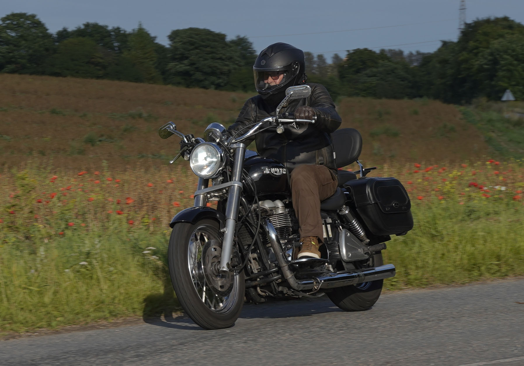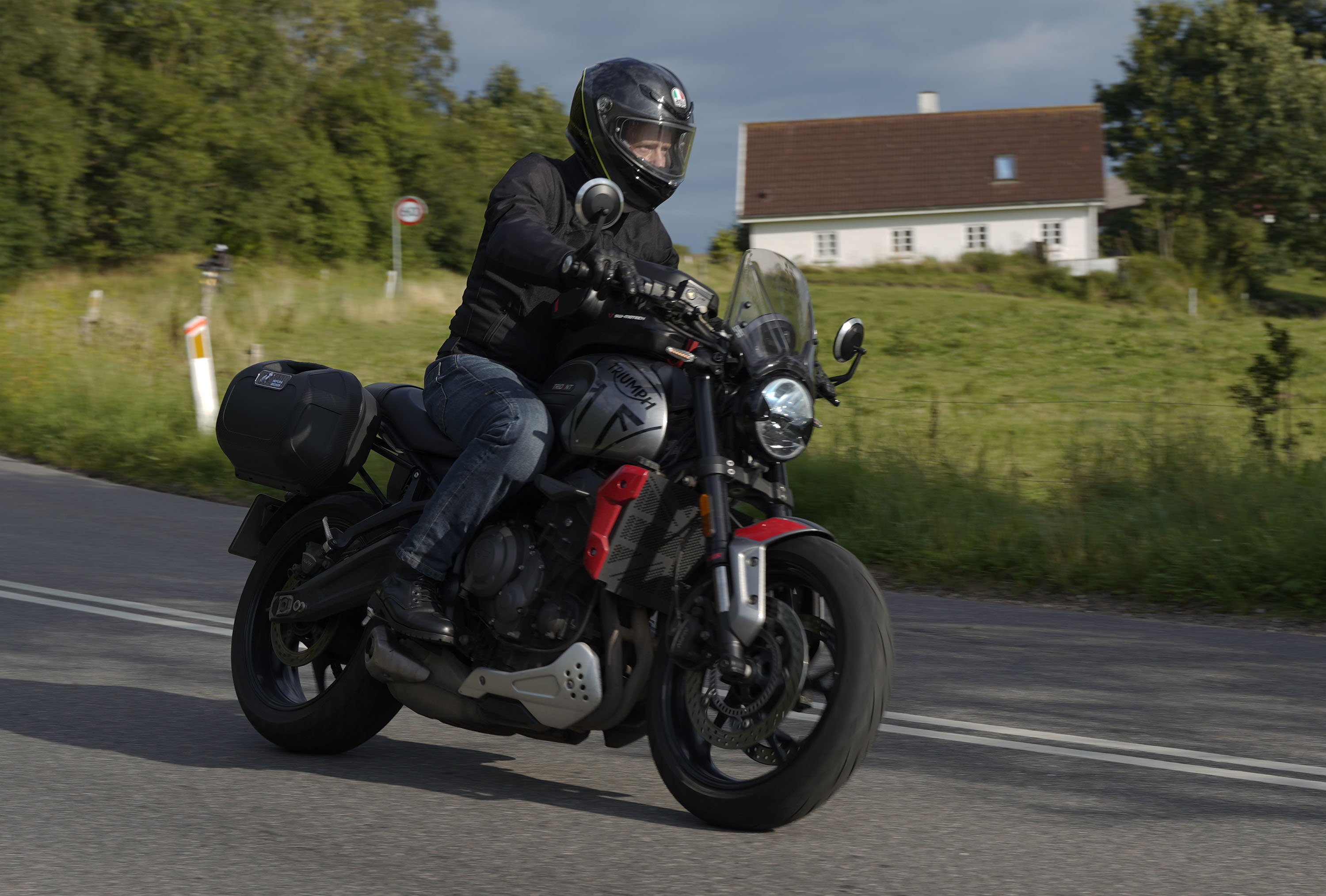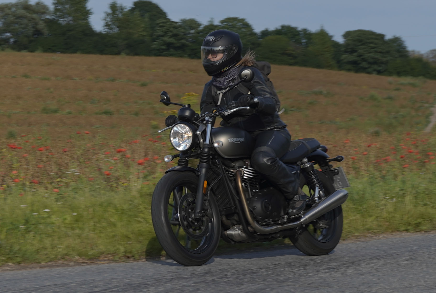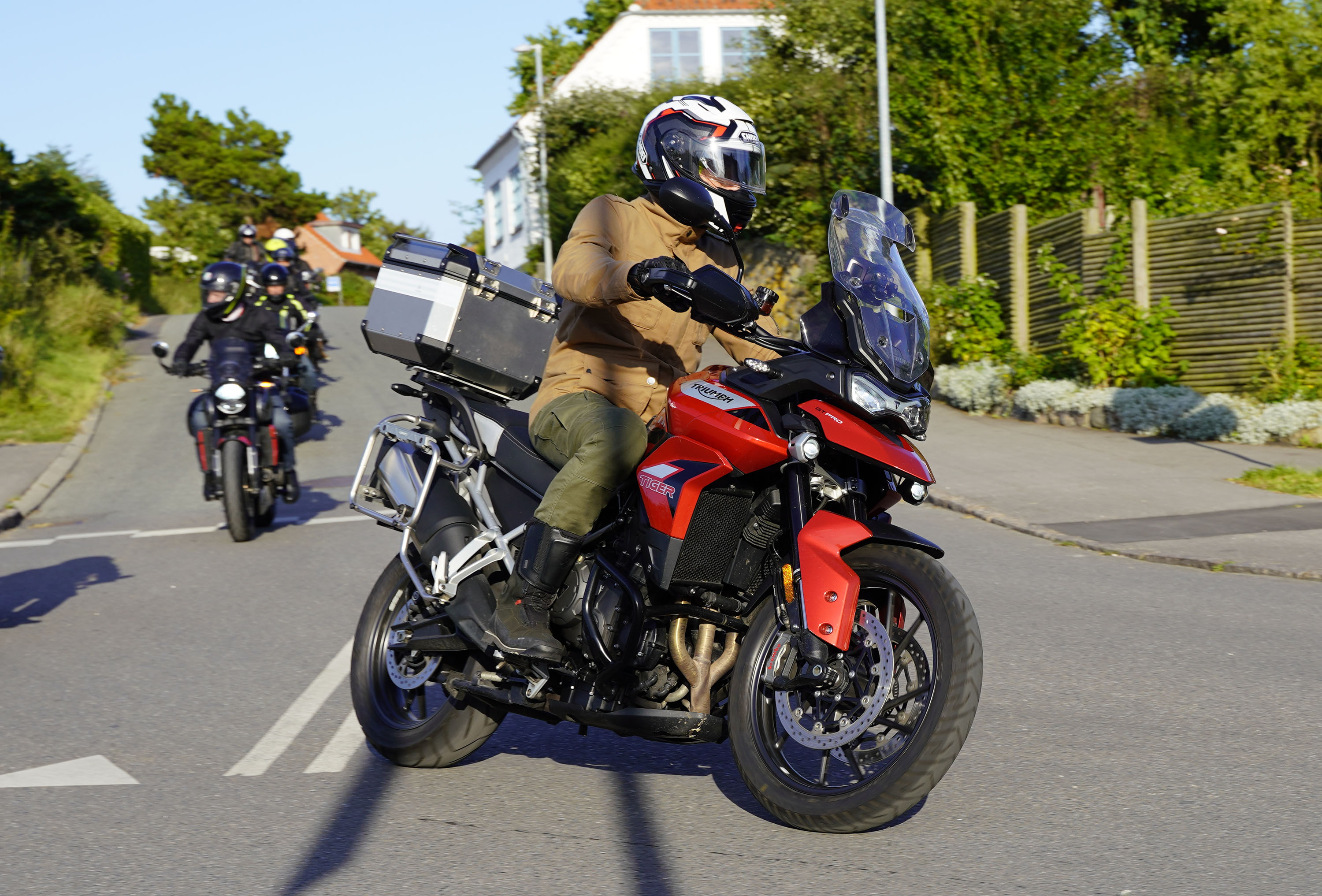 Jeg ankom til mødestedet på tanken, og der var flere der hade tænkt det samme. Der var Mogens på den sorte Bonneville -07, Tore på en sølv Trident 660 -21, Eva på en champagne/sort Street Twin -20, Niels Jørgen på en sort/hvis Bonneville T100 -05, Allan på en sort America -06, Torben på en sølv Harley Sprotster -99, Finn på en blå Scrambler 1200 -19, Per på en rød Tiger 900 -17, Julius på en rød/sølv Bonneville T120 -12, og mig selv på den grå/orange Street Triple KM-spec -08.Kl 17.30 startede vi turen og kørte gennem skoven til Værløse hvor vi drejede nord-vest mod Ganløse og Slagslunde.