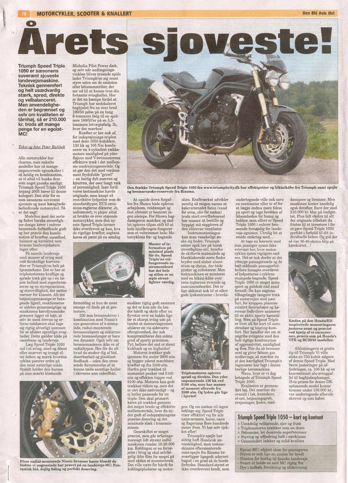 Den kendte danske MC-journalist Peter Rahbek har lånt våres Speed Triple 2005 til test. Det har der kommet en artikel ud af i Den Blå Avis den 8 september 2005.