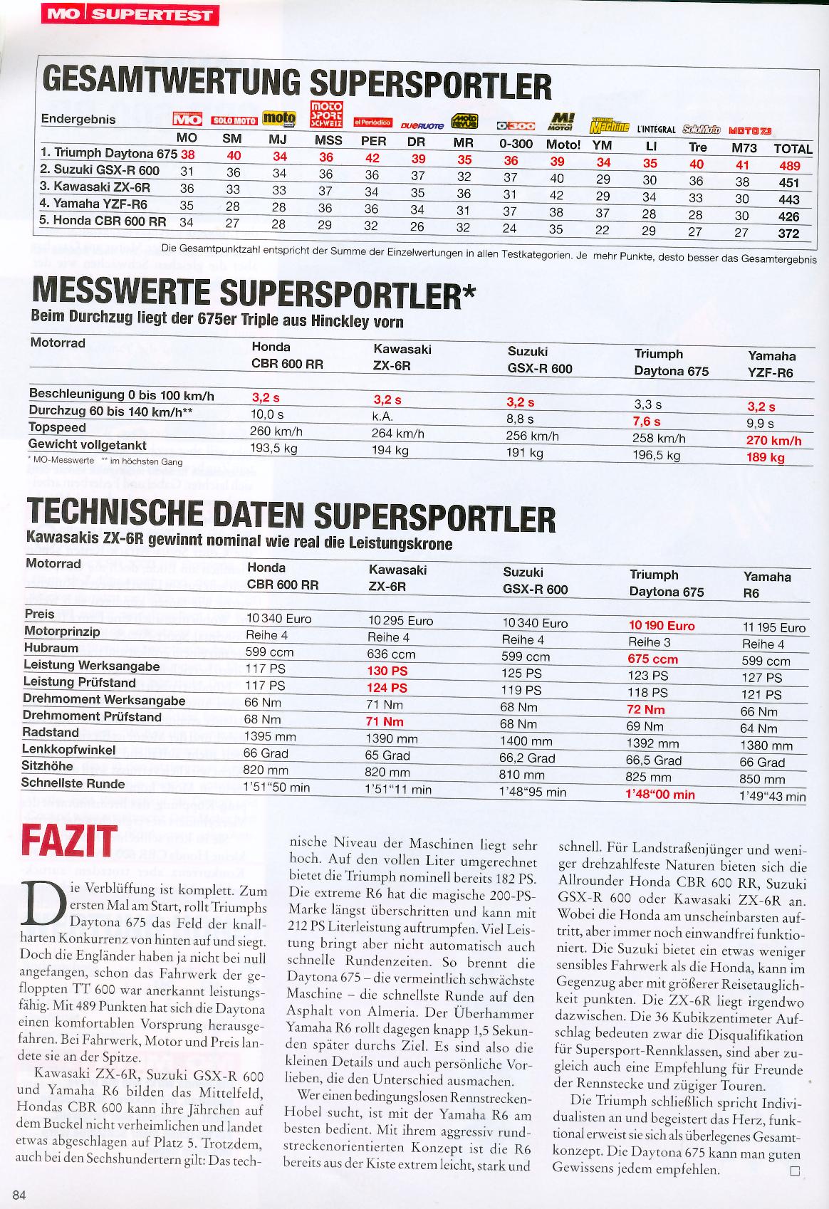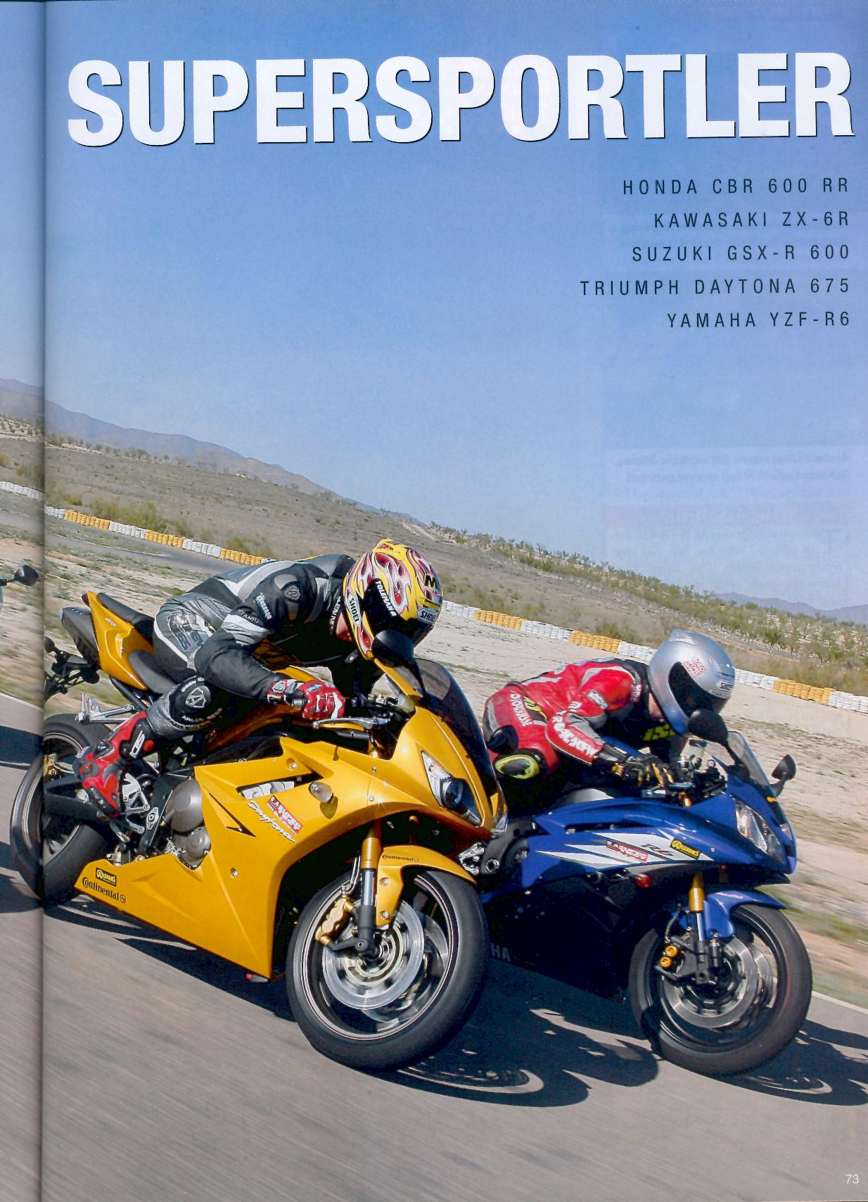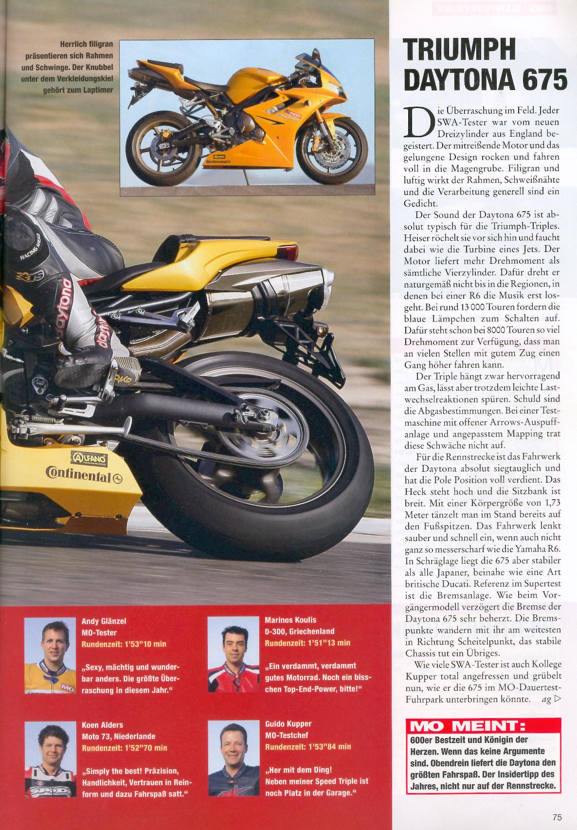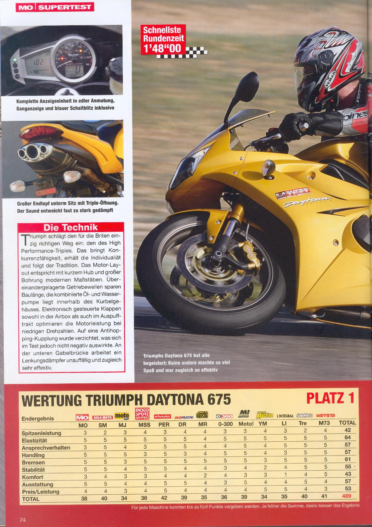 Tyske "MO Motorradmagazin" #5, 2006, har en stor test af alle supersportcykler i 600 klassen. Testen forgår på Almeria banen i Spanien og den vindes af... Triumph Daytona 675.