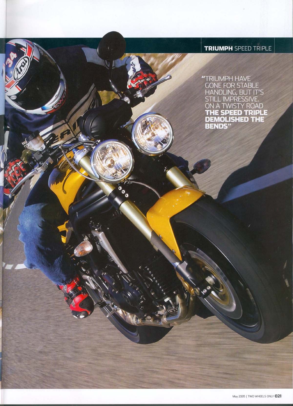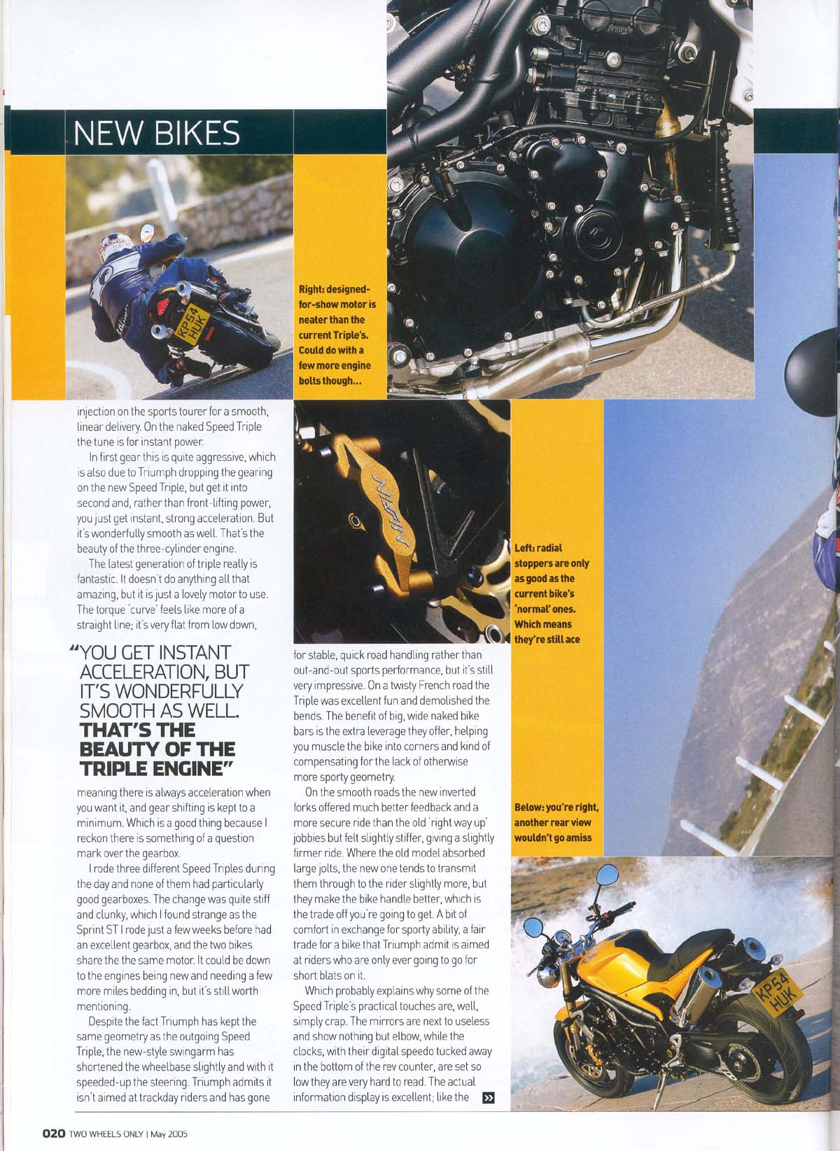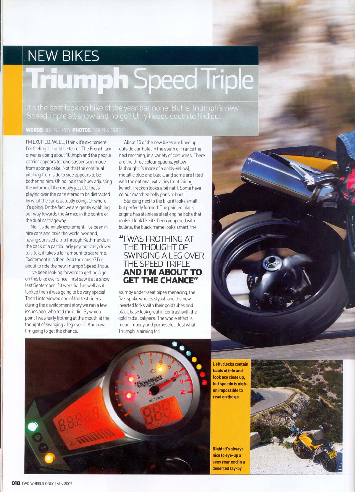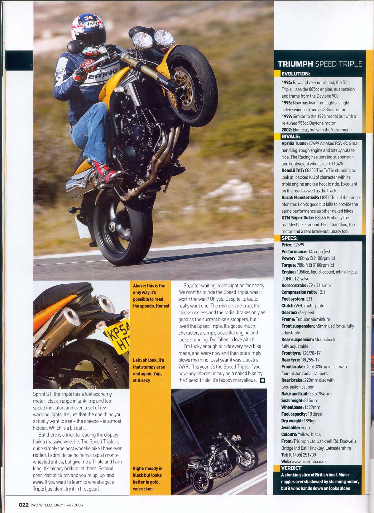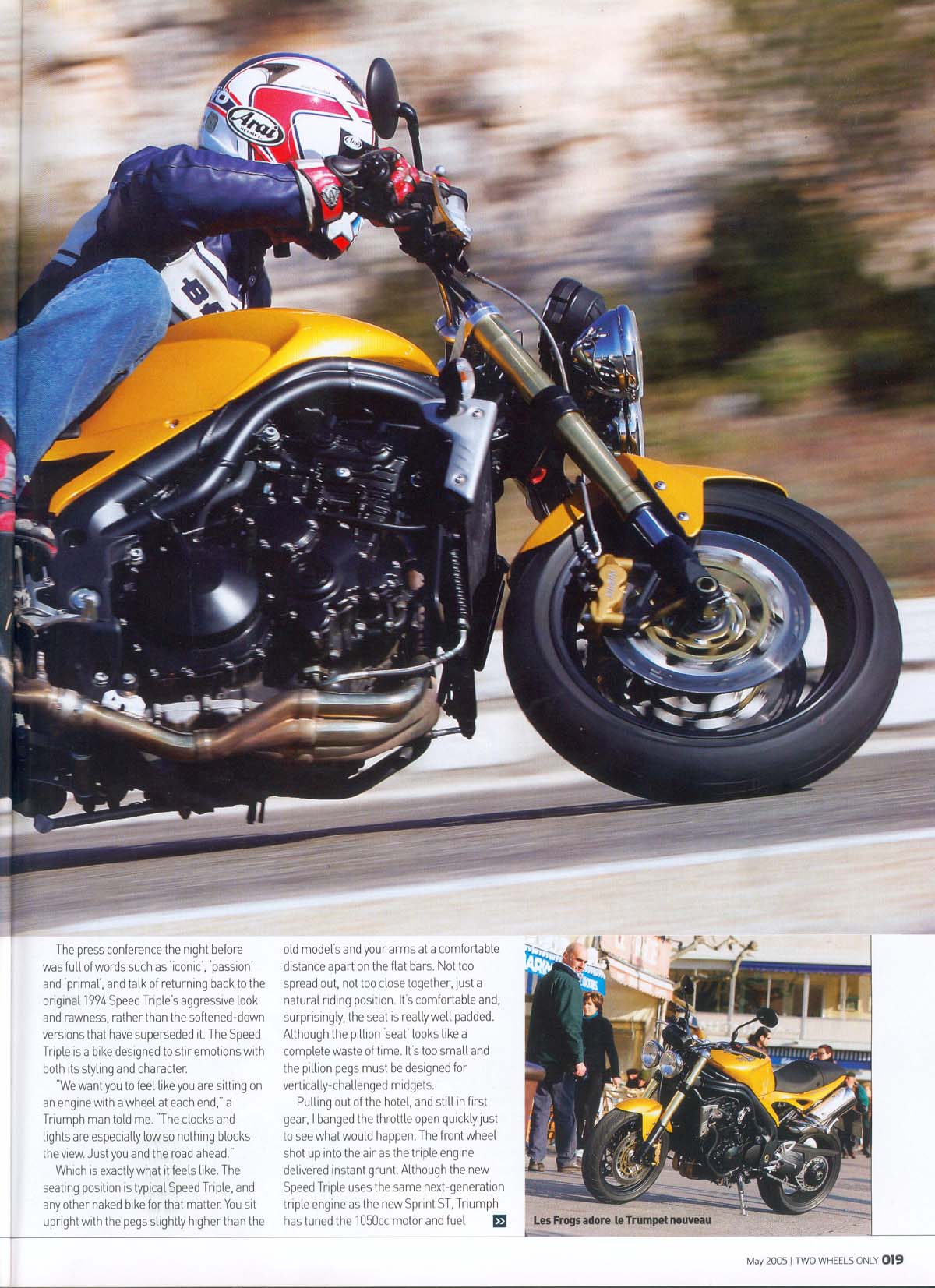 Engelske "Two Wheels Only" maj 2005 tester den nye 2005 Speed Triple 1050cc i Sydfrankrig. De kan godt lide den.