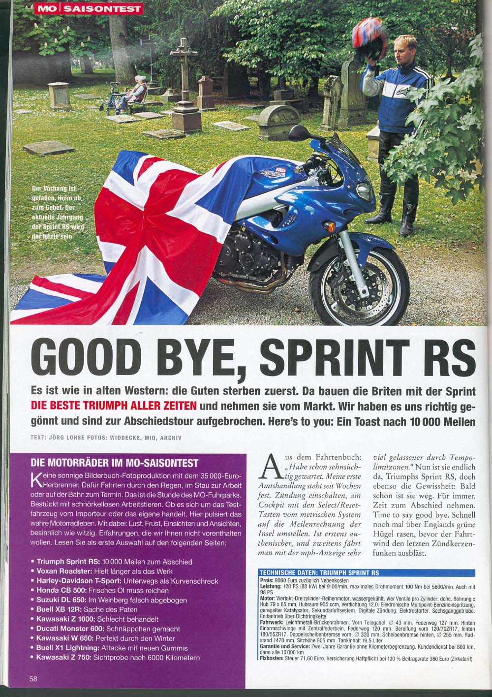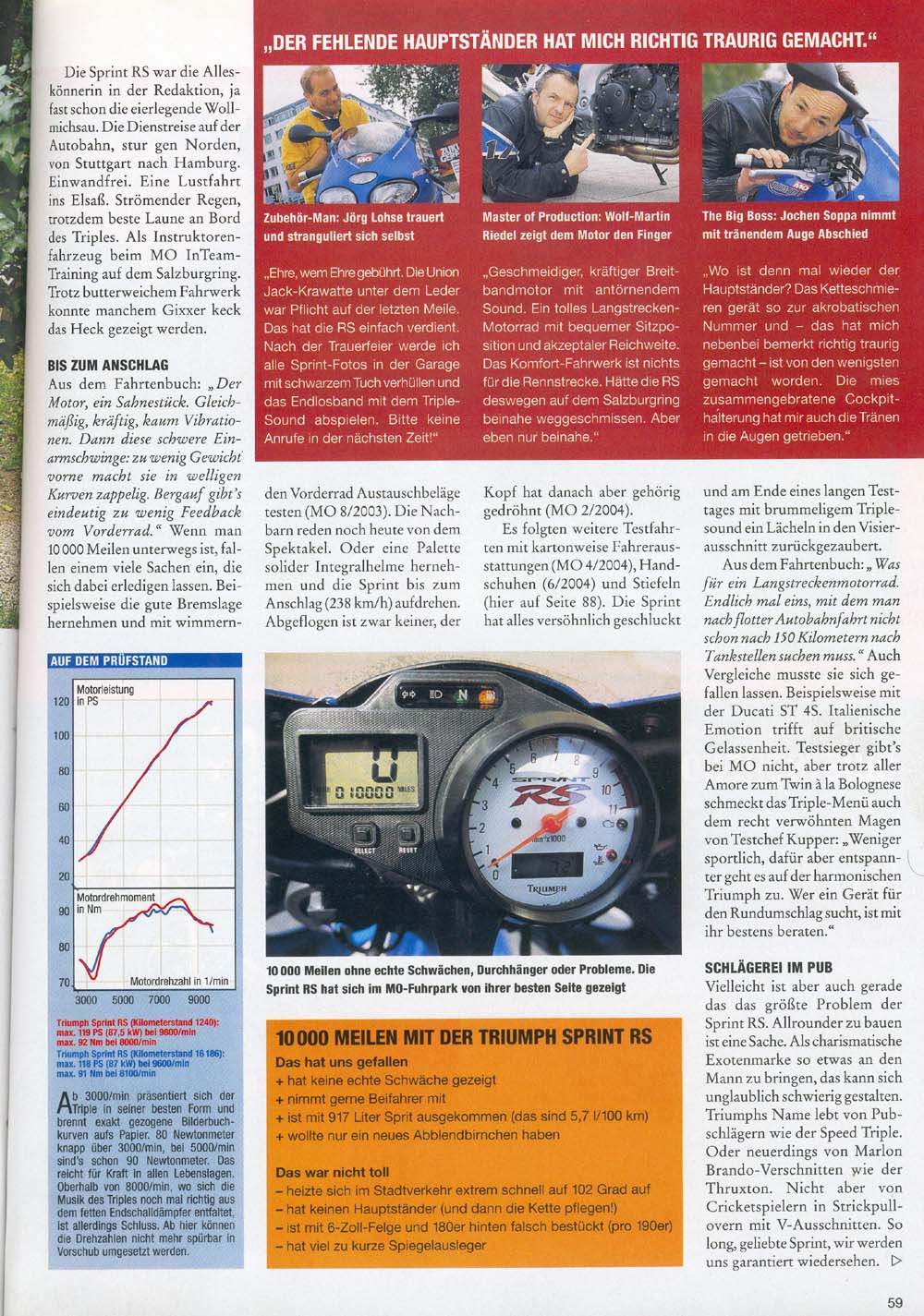 Tyske Motorrad juli 2004 afslutter en sęsong-test af Sprint RS efter 10.000 engelske mil eller 16.000 km.